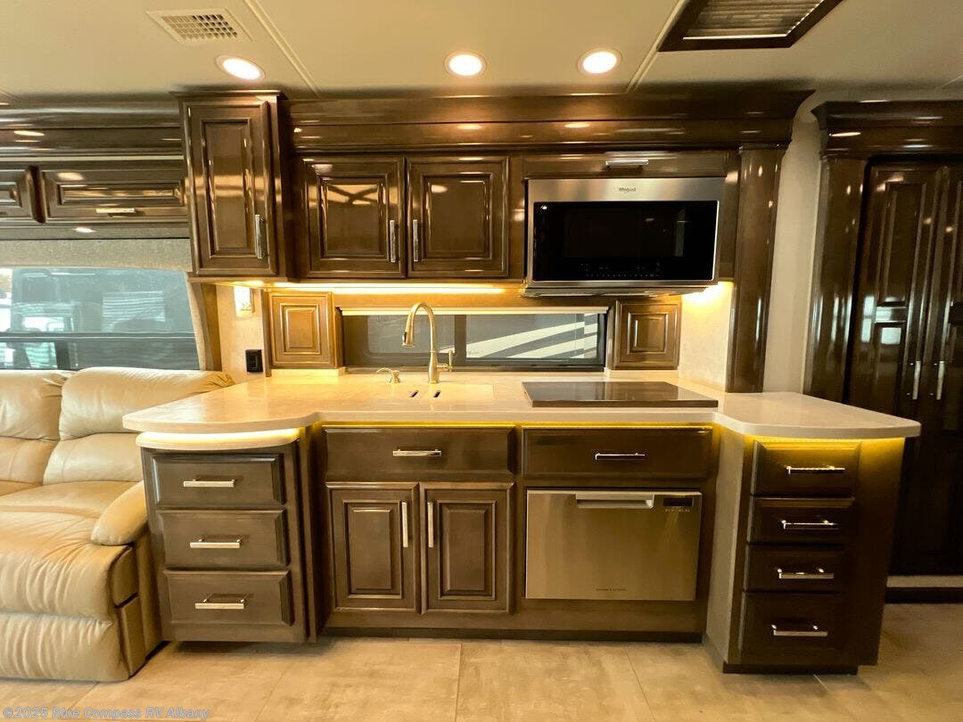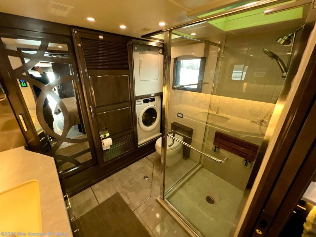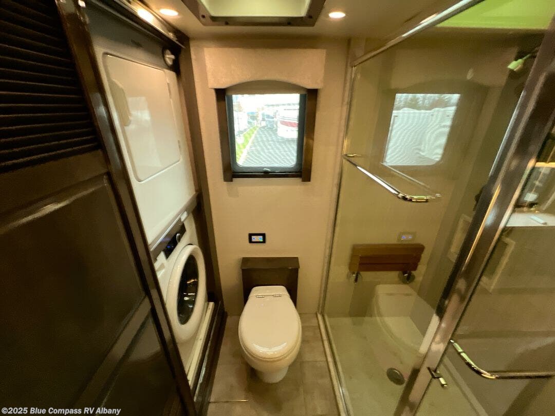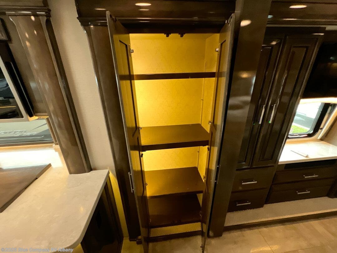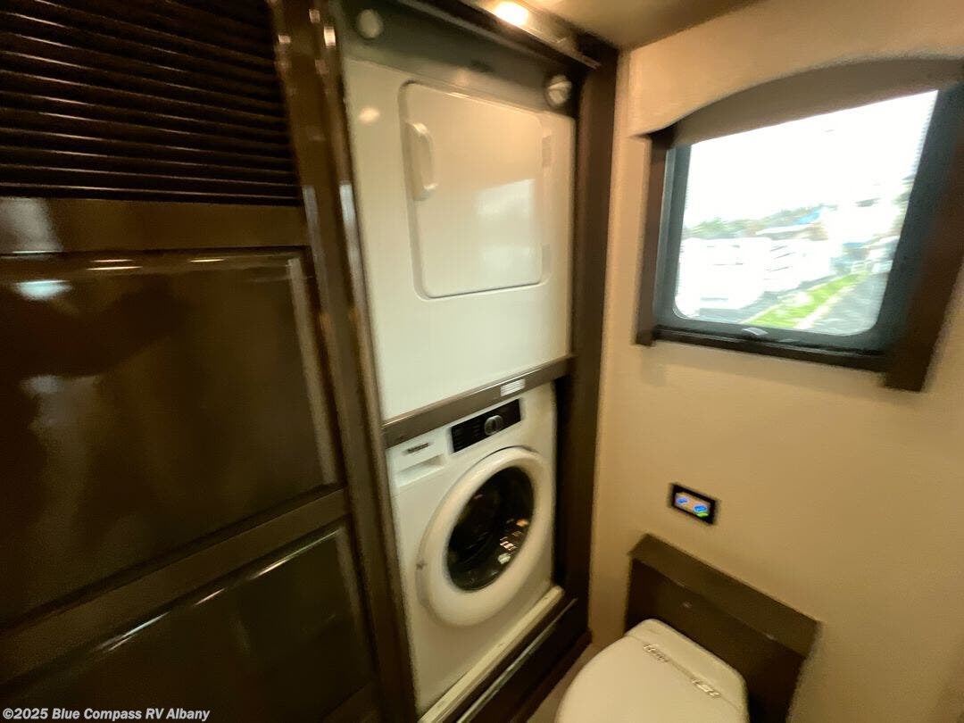 The cook will love the kitchen on this Anthem Class A diesel motorhome! From the induction cooktop which is easy to clean and the convection microwave to the slide out storage tray in the overhead cabinet and the Fisher & Paykel dishwasher, you can cook in style. The two ottomans in front of the sofa offer more seating or a place to put your legs up after a hike outside or shopping in town. Head to your master suite which has a Select Comfort Sleep Number king-size mattress, nightstands with USB ports, a set of wardrobes, and a 32" QLED 4K UHD Smart TV. The rear full bathroom offers a large cedar-lined wardrobe, a washer/dryer, a shower, and everything you will need to stay refreshed, and the mid-coach half bath is an additional convenience for all. You might like to add a few options such as a 100" reclining sofa.