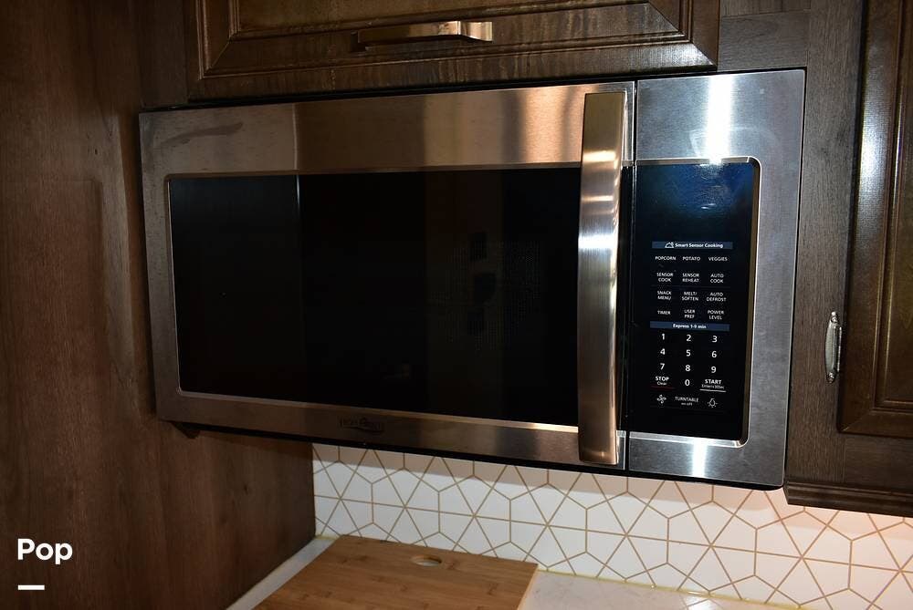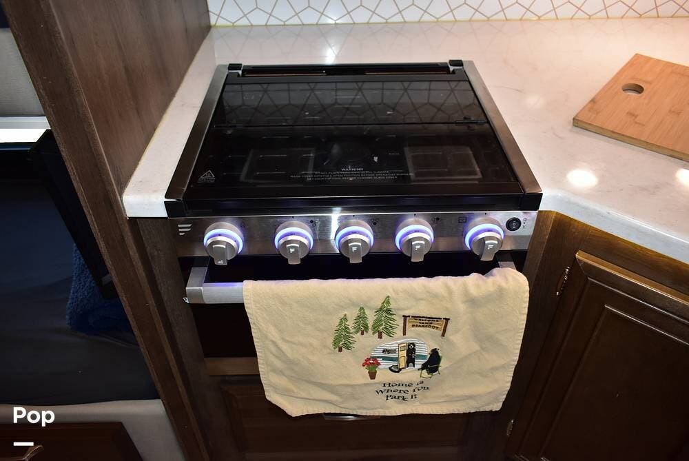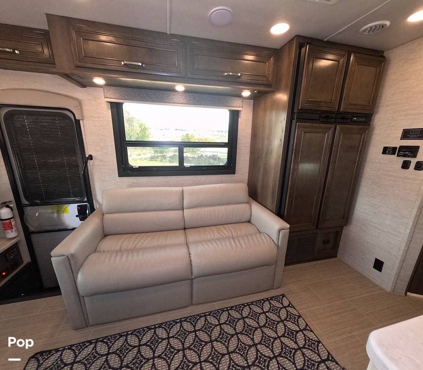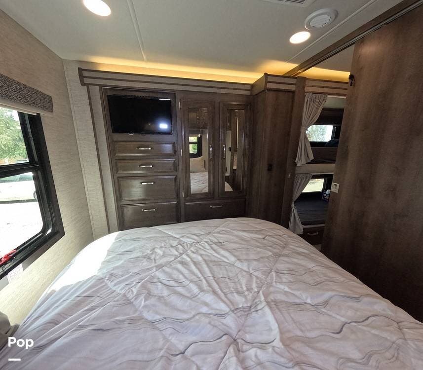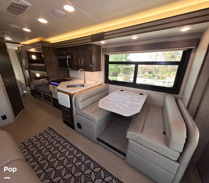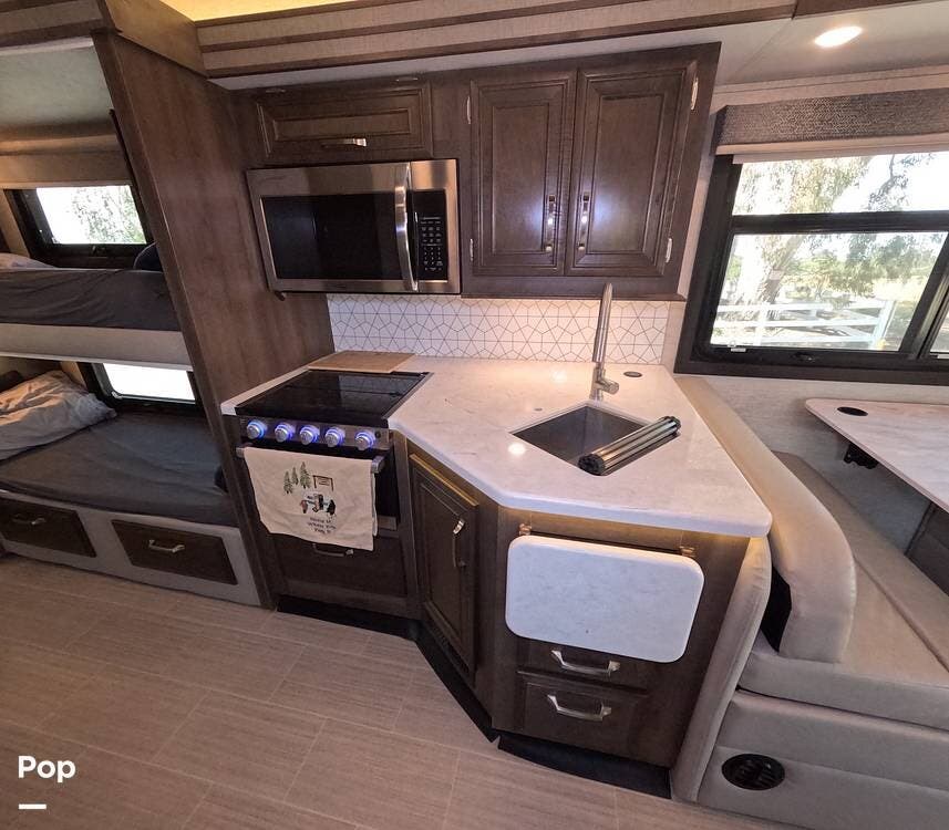 The private rear bedroom offers a quiet retreat, while the cab-over bunk, dinette, and sofa easily accommodate guests or growing families. Rich hardwood cabinetry, soft LED lighting, and residential-style finishes create a warm, inviting atmosphere that feels like home -- only better because your backyard is always changing.