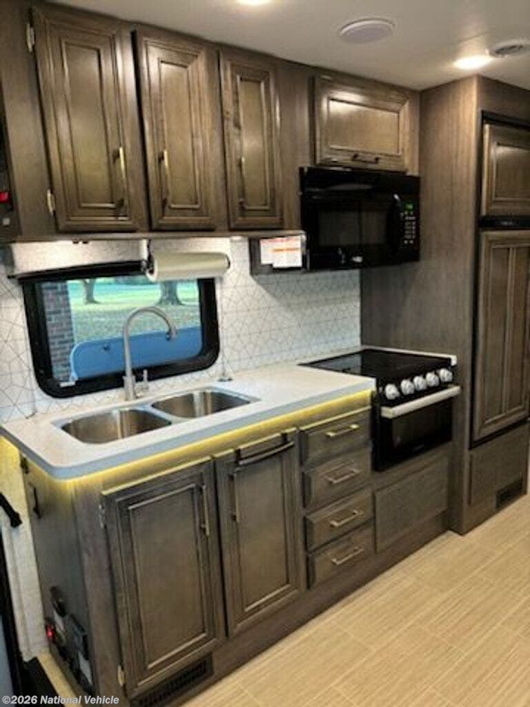 The 2022 Entegra Odyssey 24B is a family-friendly RV with a spacious floor plan, a multi-purpose dinette, and a cab-over bunk with a large automated window.