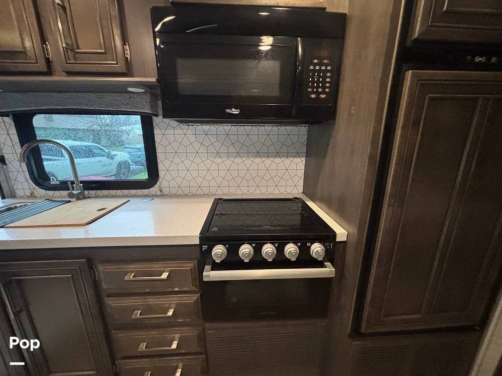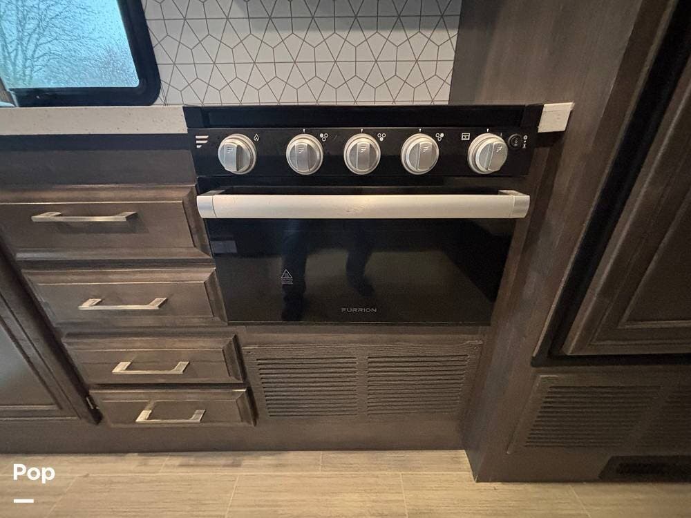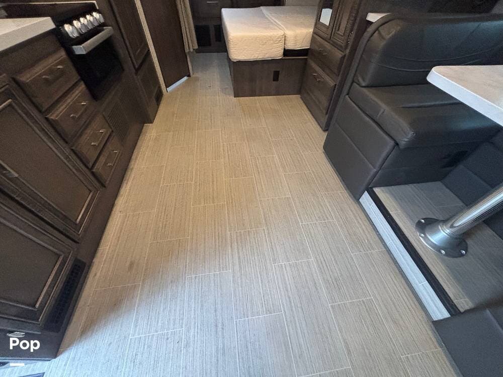 The living area expands with the slide, creating comfortable usable space for relaxing, dining, or planning the next stop. Seating is practical and well positioned, and the overall layout makes good use of square footage without feeling crowded. The kitchen provides solid counter space, storage, and the appliances needed to prepare real meals on the road, making this coach well suited for travelers who prefer convenience without relying on restaurants.