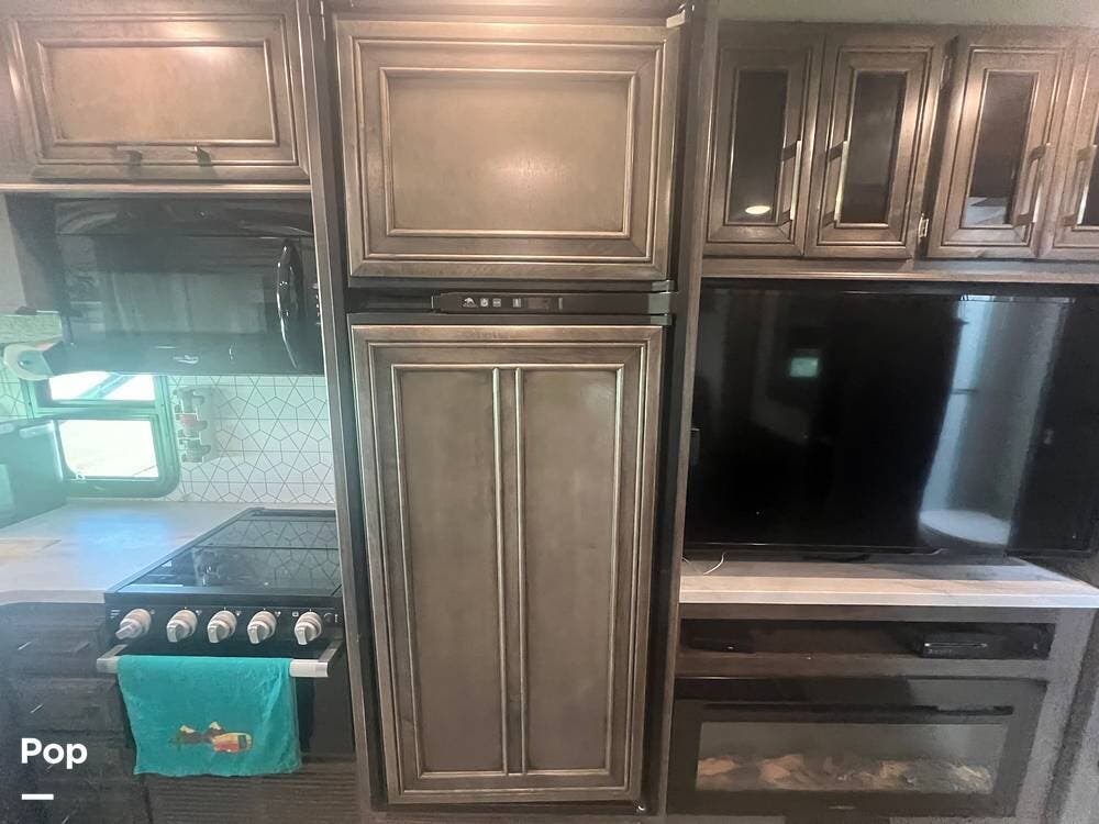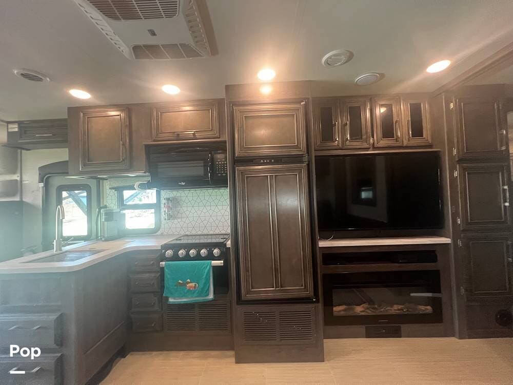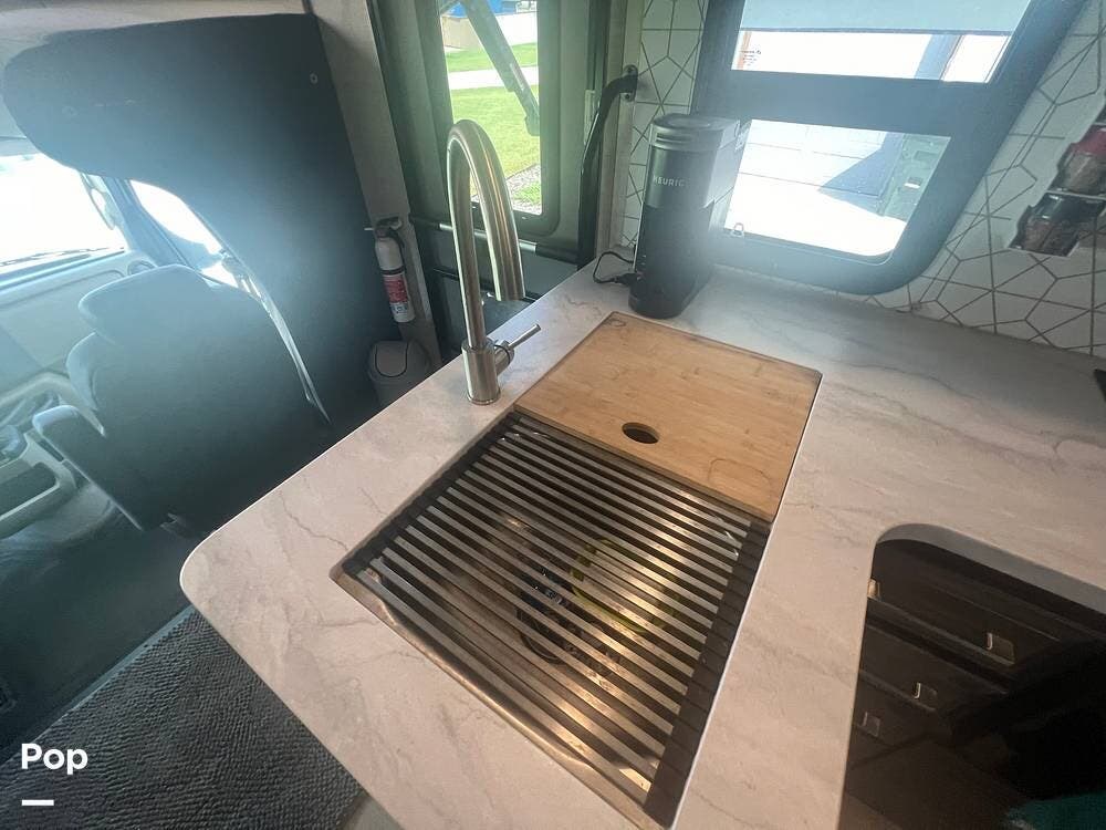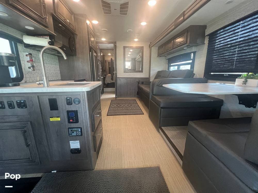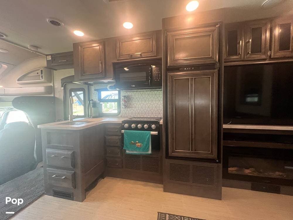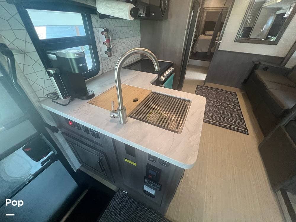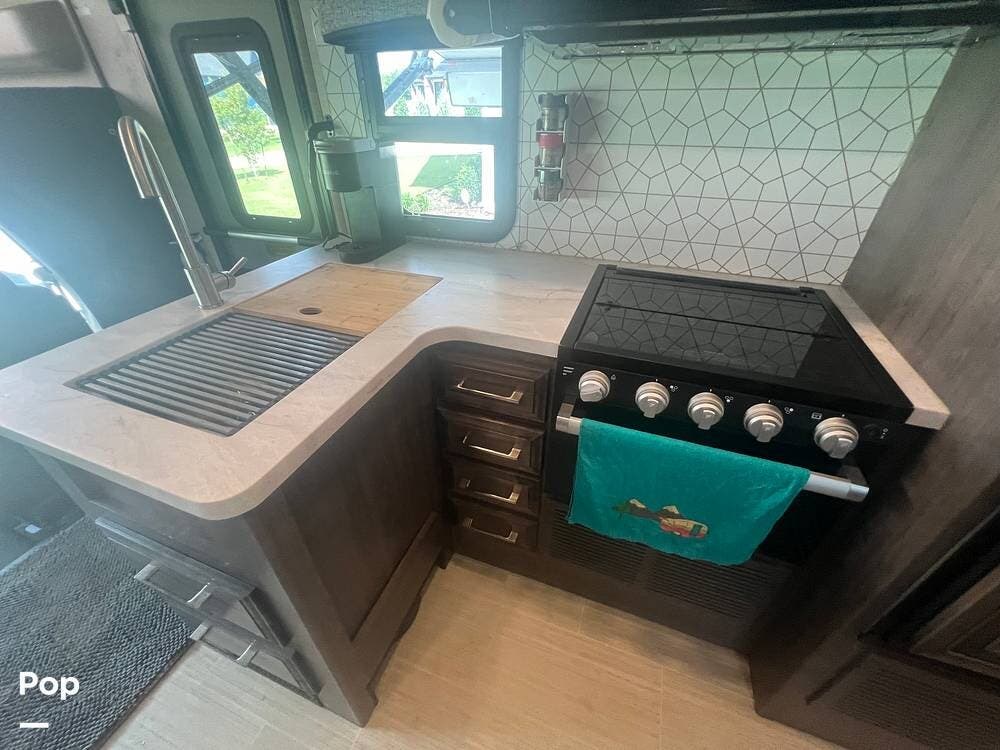The coach features a modern design with high-quality finishes, including a fully equipped kitchen with solid surface countertops, a residential-style refrigerator, and a three-burner cooktop.