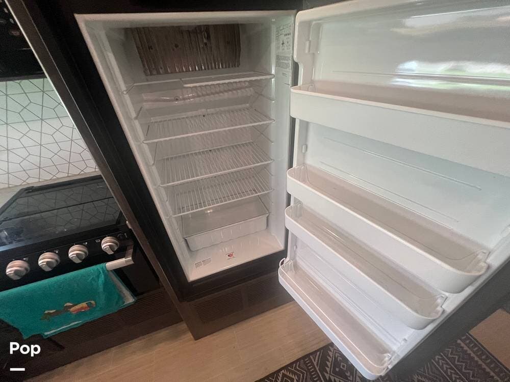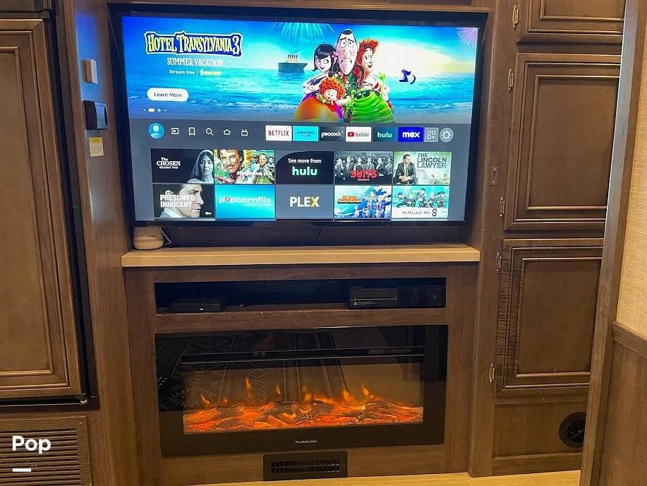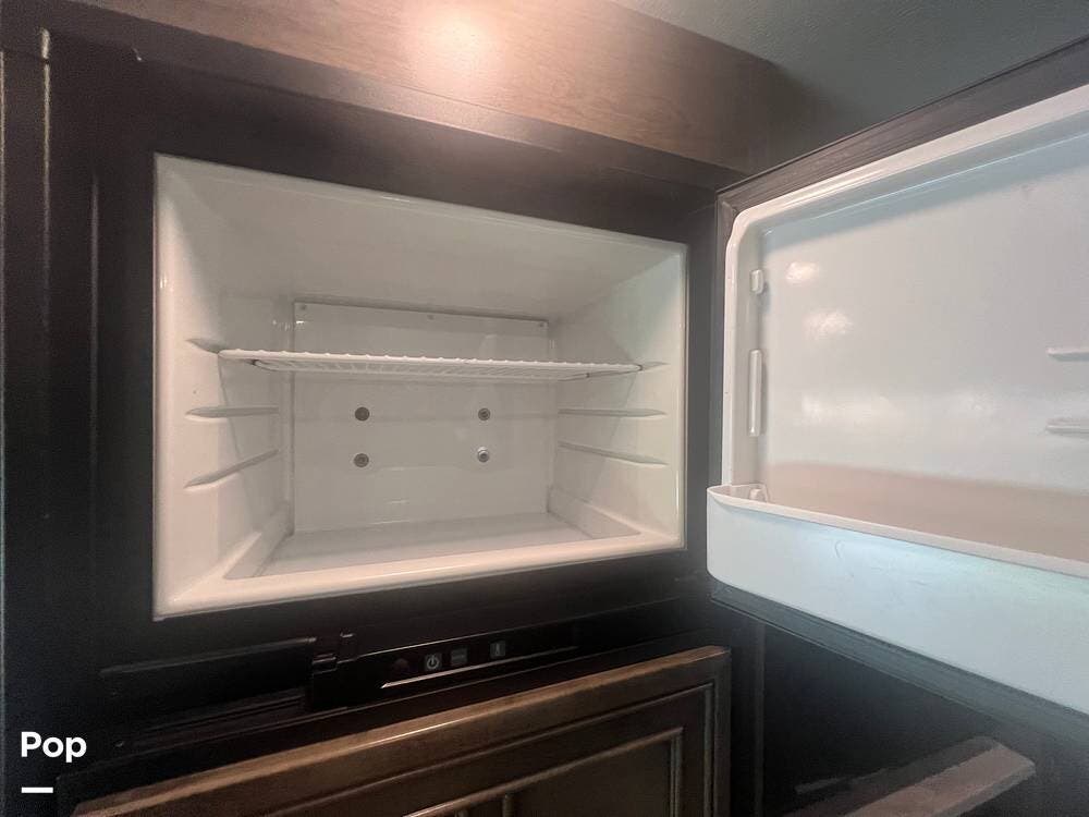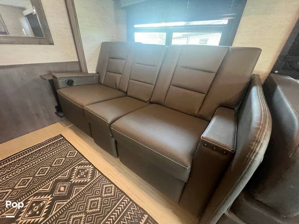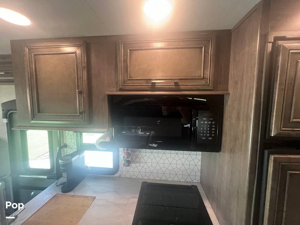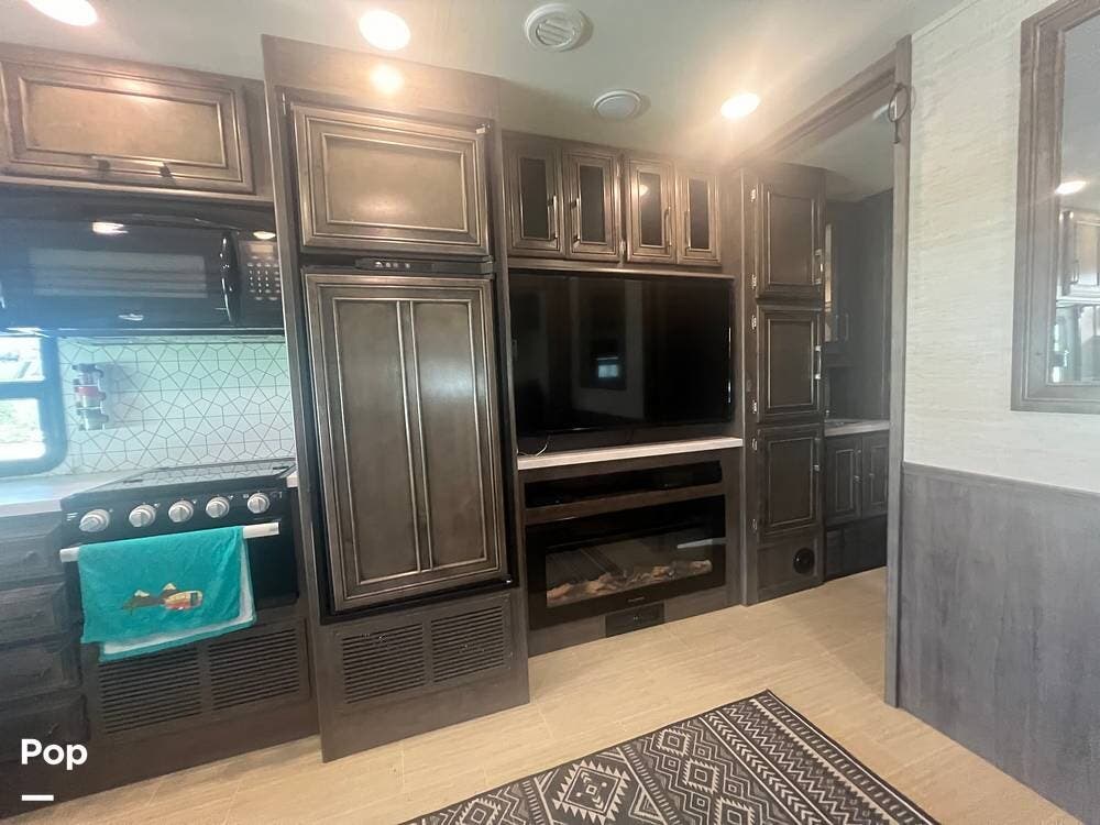 The coach features a modern design with high-quality finishes, including a fully equipped kitchen with solid surface countertops, a residential-style refrigerator, and a three-burner cooktop.