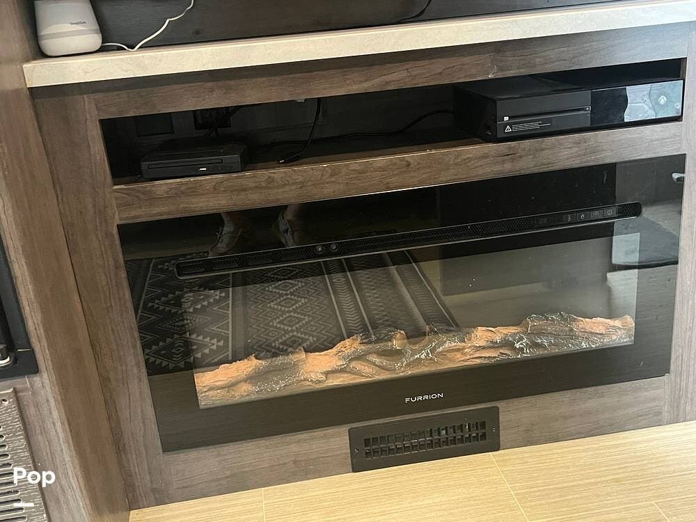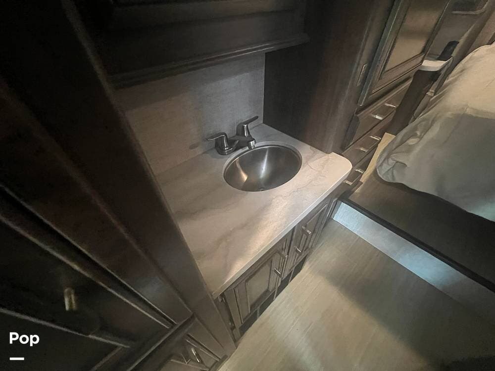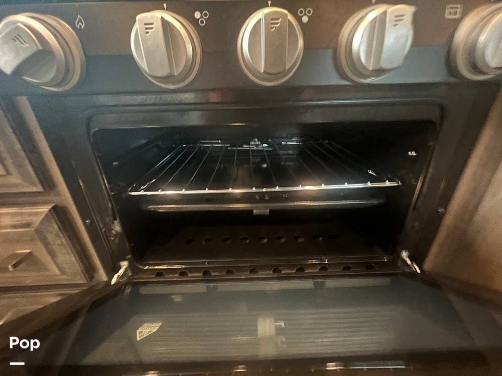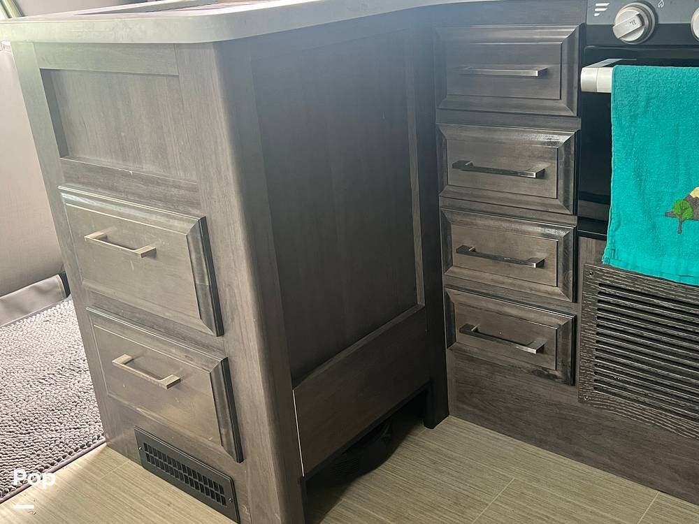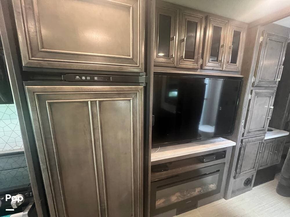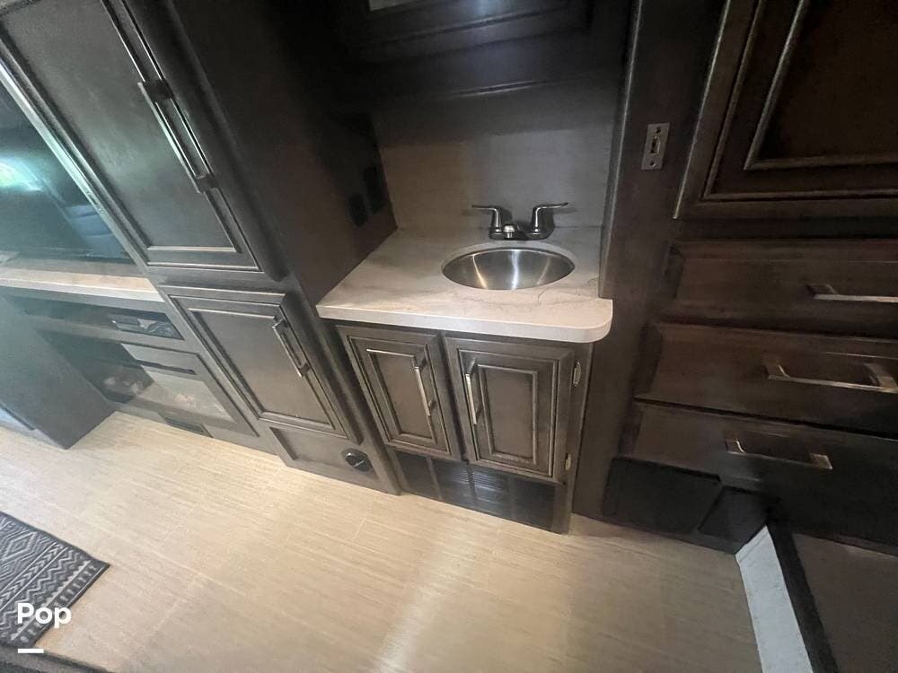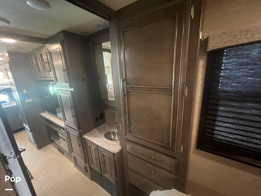 The coach features a modern design with high-quality finishes, including a fully equipped kitchen with solid surface countertops, a residential-style refrigerator, and a three-burner cooktop.