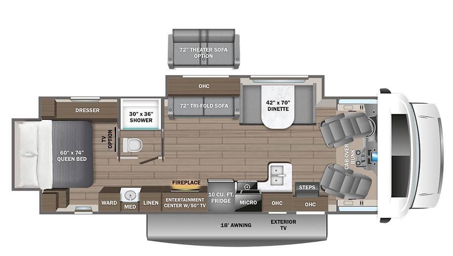 The Odyssey 30Z is powered by a Ford E-450 chassis and a 7.3-liter V8 engine, delivering reliable performance and handling.