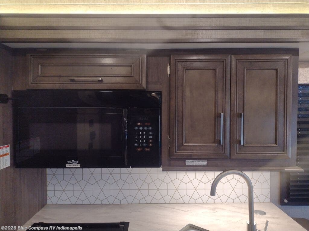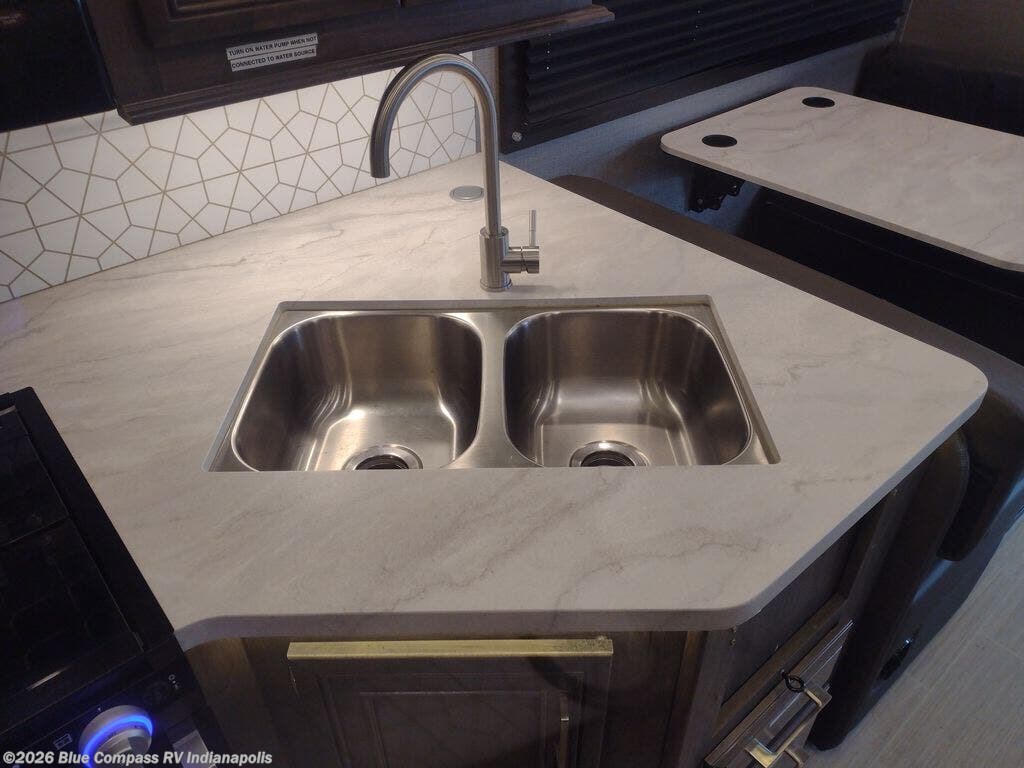 With any Odyssey Class C gas motorhome by Entegra Coach, the driver will appreciate the power from the 350 HP engine, the towing capacity from the 7,500 lb. hitch, the Tire Pressure Monitoring system, the navigation from the Sony infotainment center with Apple CarPlay and Android Auto, plus the backup and side-view cameras when parking and driving down the highway. The kitchen offers full amenities including a recessed stainless steel sink with a cutting board sink cover, LED-lite pressed countertops, a decorative backsplash, and a pop-up charging station with 110 outlet and USB plugs to keep your smart phones charged. Get ready for luxury in a Class C, choose your favorite today!