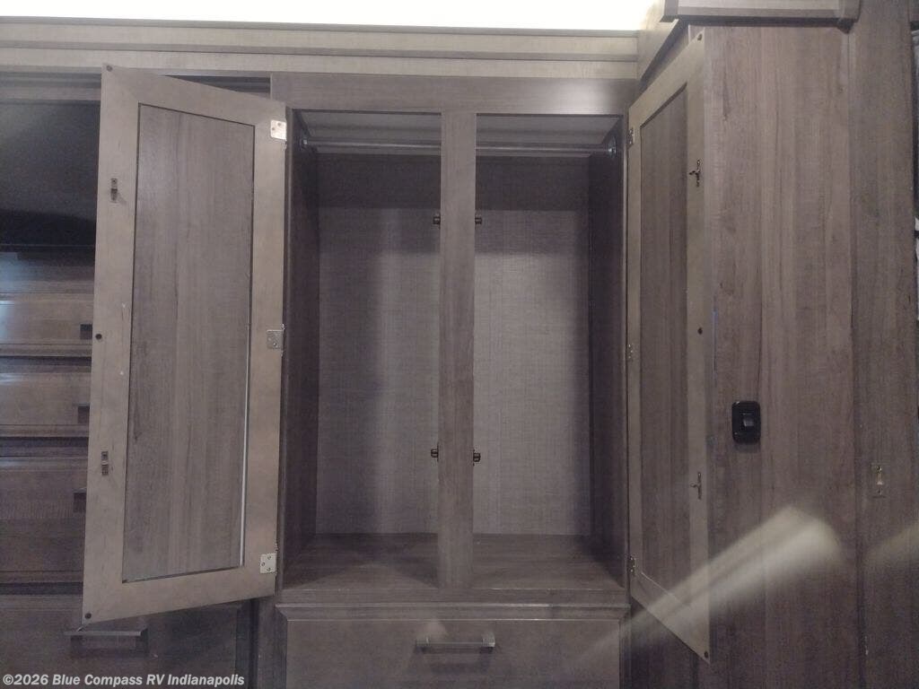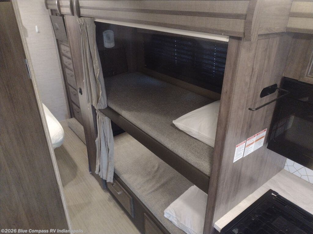 Gather your family and load up for travel games, camping games and all around comfort and luxury! The full-wall slide provides extra floor space from just behind the swivel captains chairs all the way back to the private rear bedroom with a queen bed and clothing storage. The bunk beds are across from the main entry to the bathroom, and your kids or grandkids will love this space as well as the front cab-over bunk. You even have more sleeping space provided by the booth dinette and sofa once easily setup for bedtime. And the cook will have a residential-size microwave, a Furrion all-in-one cooktop and oven, plus an 8 cu. ft. refrigerator to keep everyone fed, and the pantry will hold the snacks. Everyone can also enjoy the 18' electric awning while at the campsite either day or night thanks to the LED lights, and the exterior TV will allow you to watch the big game in the great outdoors.