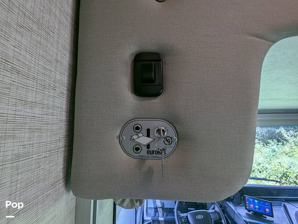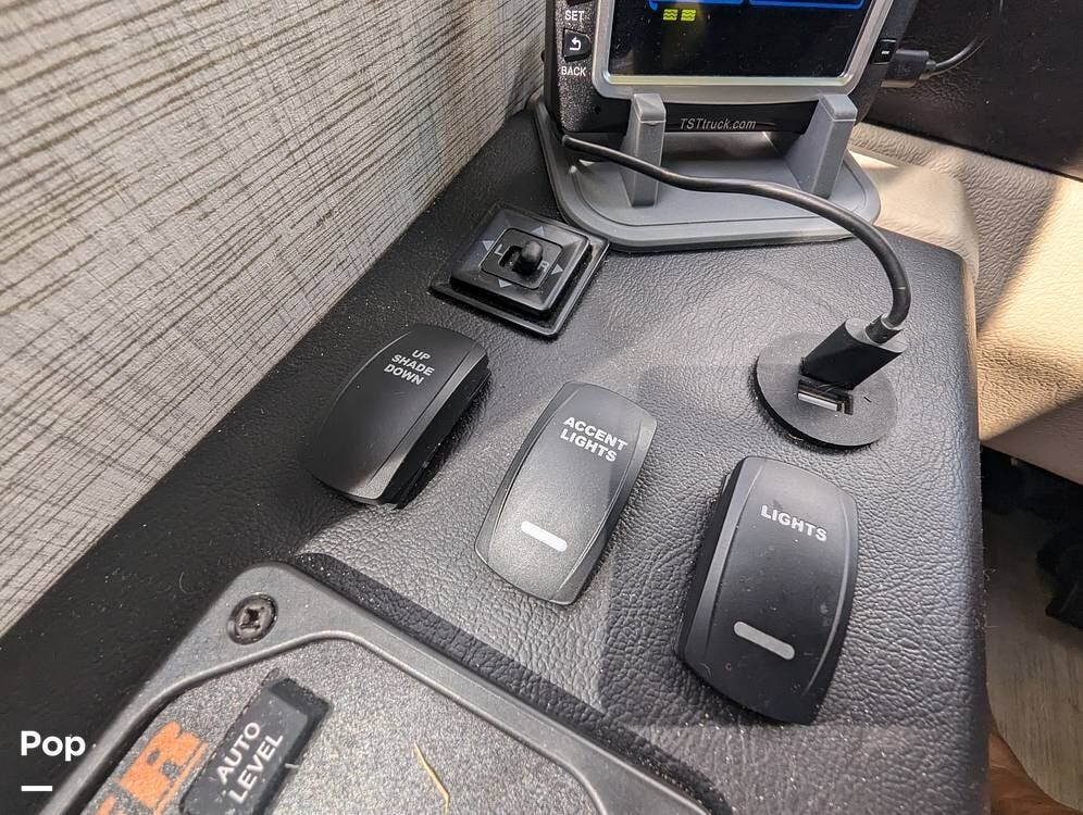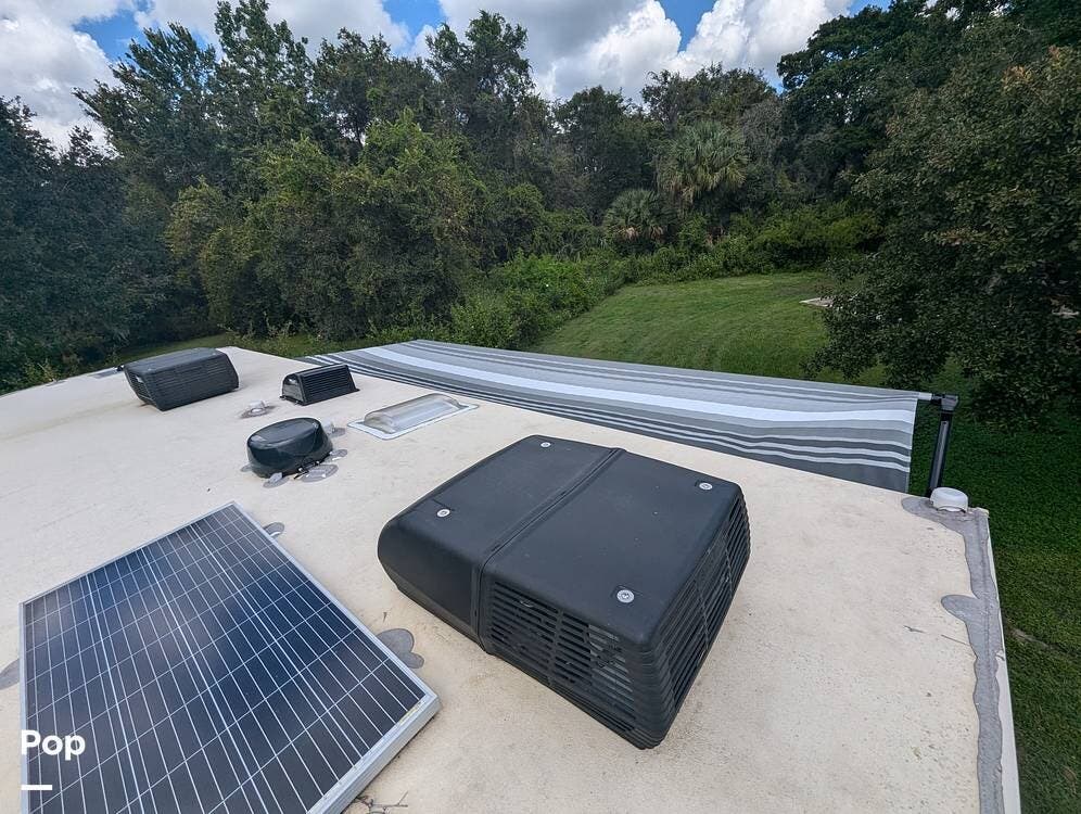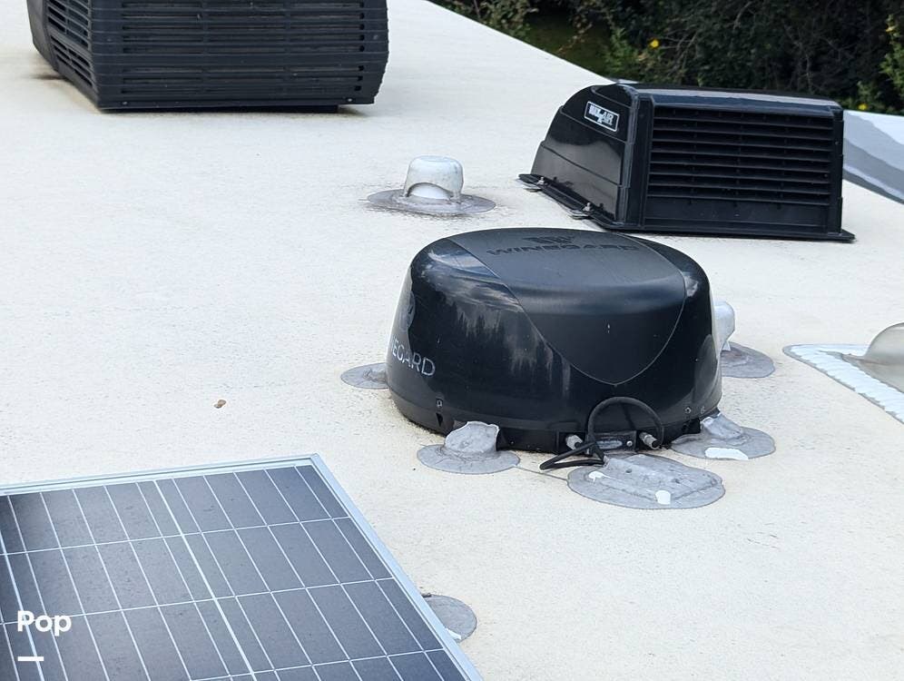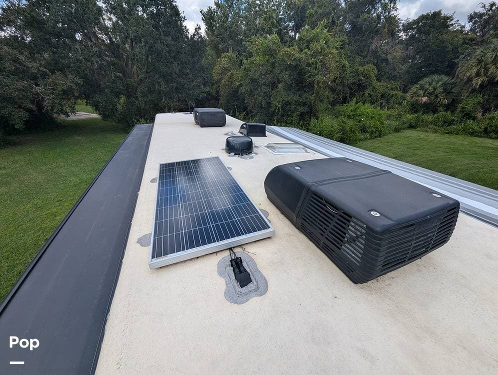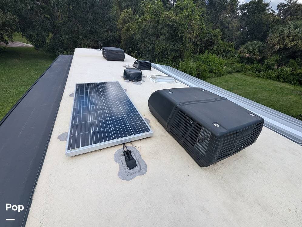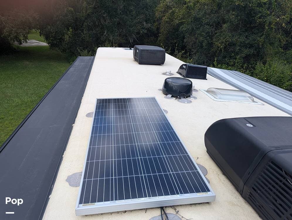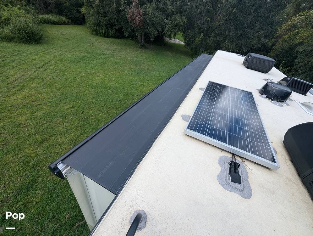 A factory solar panel is installed on the roof for added power. The panoramic windshield has an electric shade for privacy and rear and side cameras for driving.