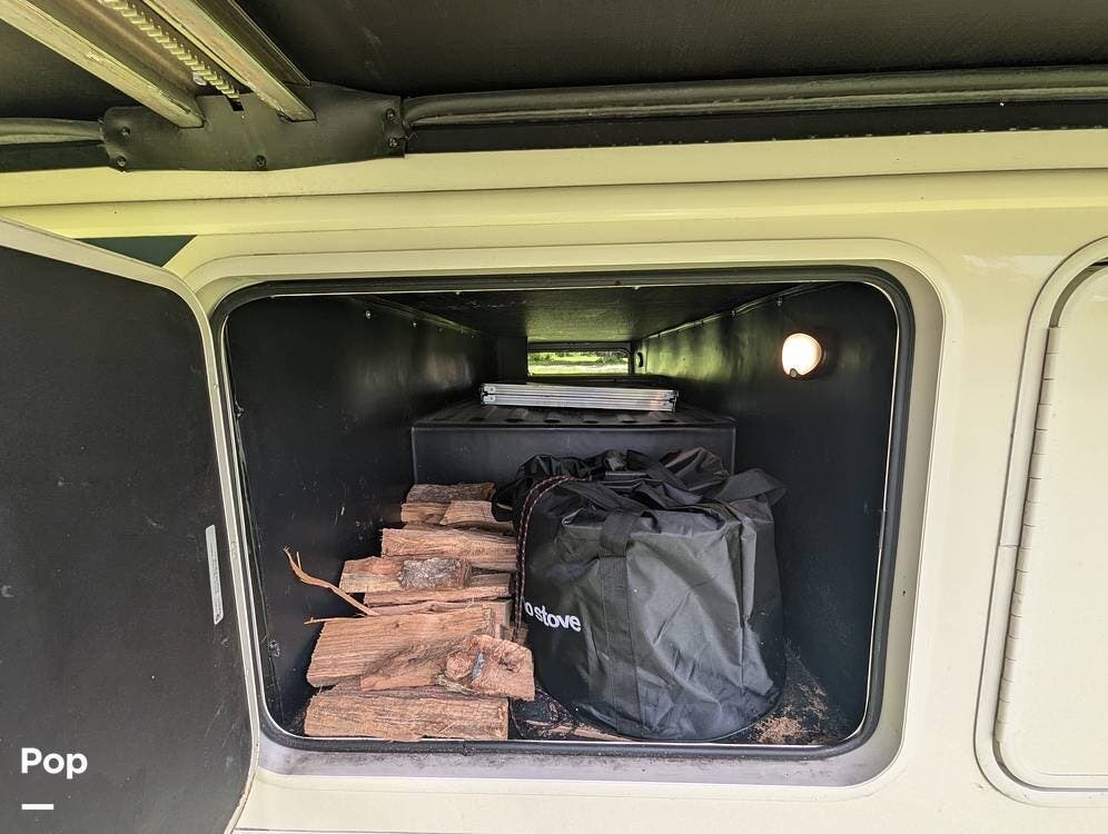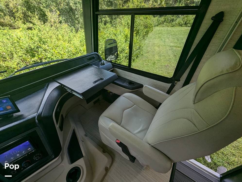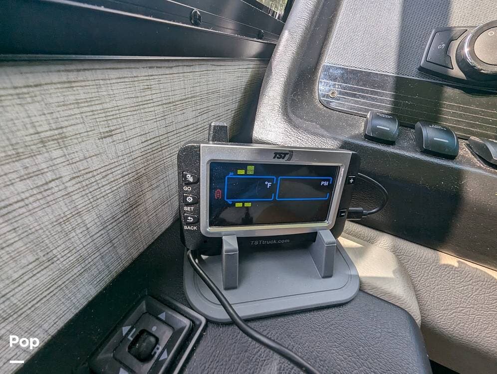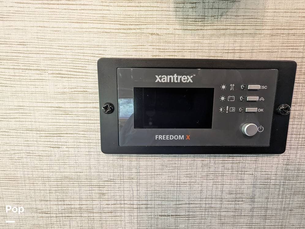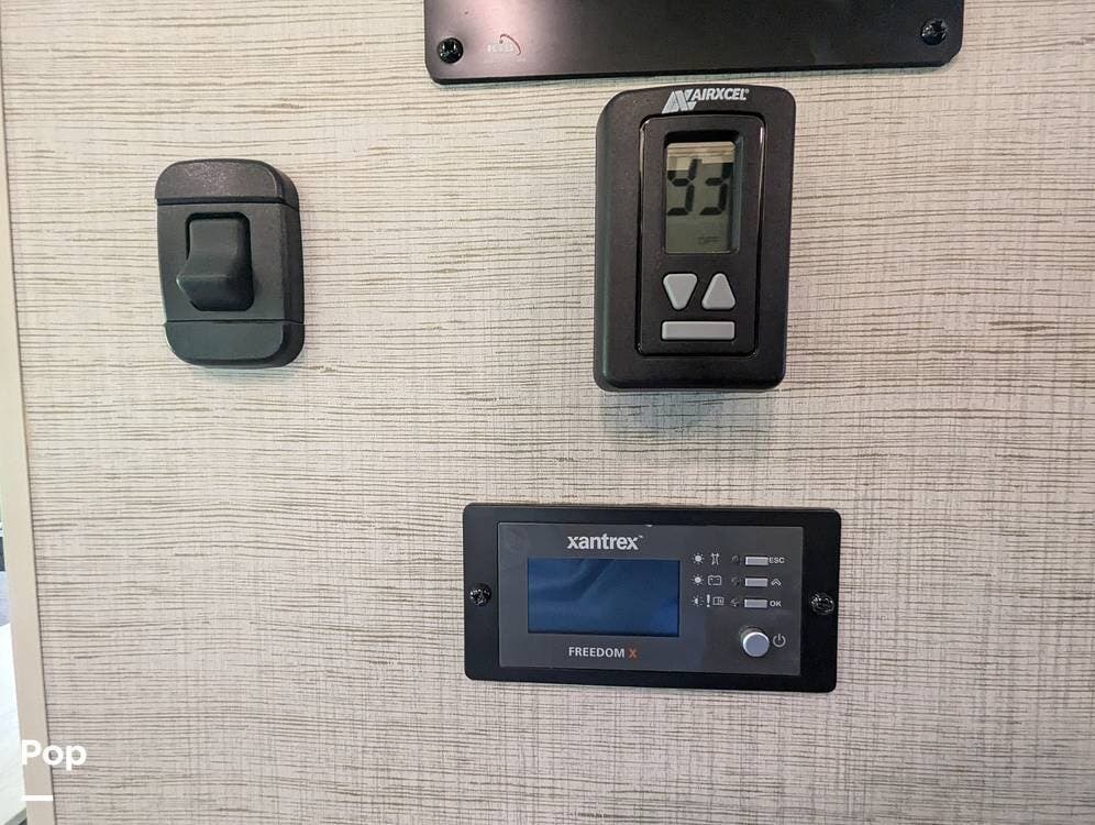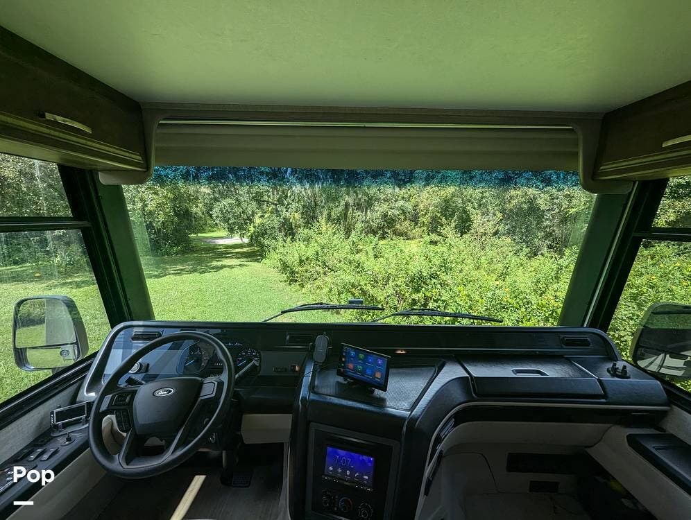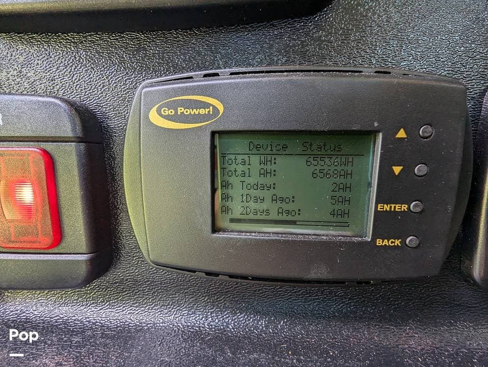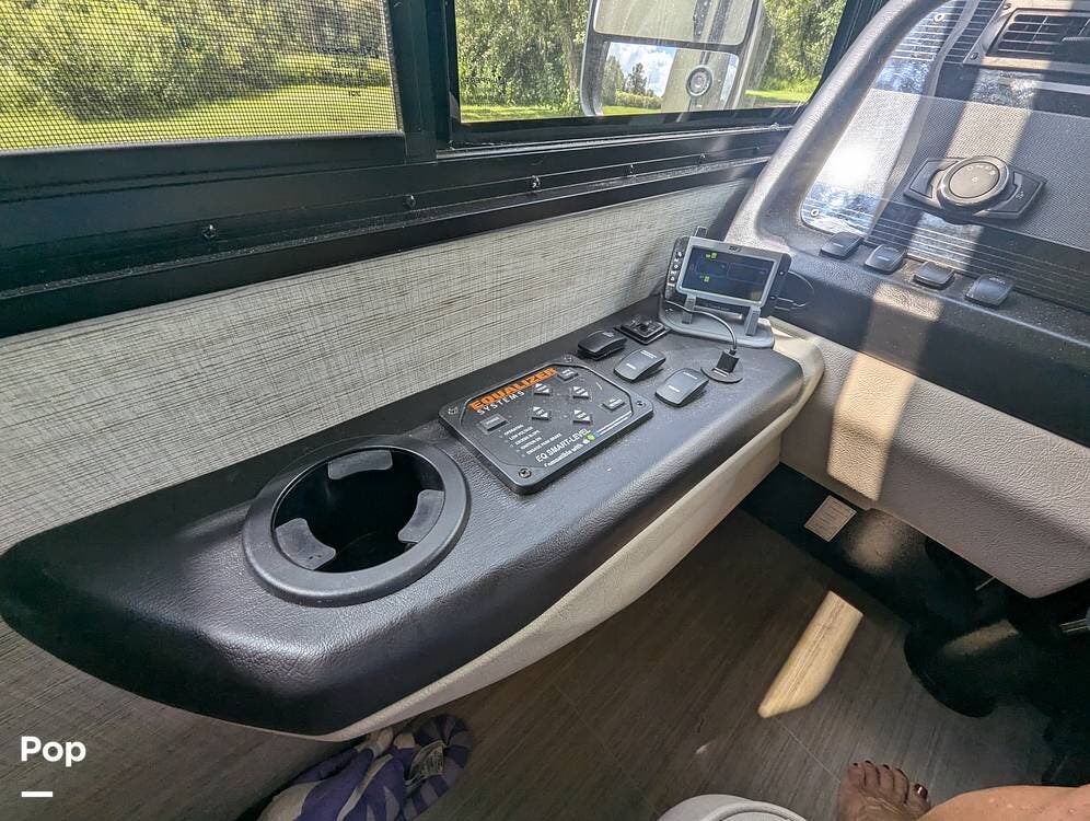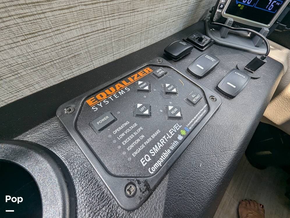 A factory solar panel is installed on the roof for added power. The panoramic windshield has an electric shade for privacy and rear and side cameras for driving.