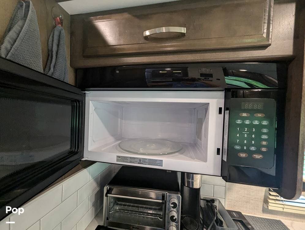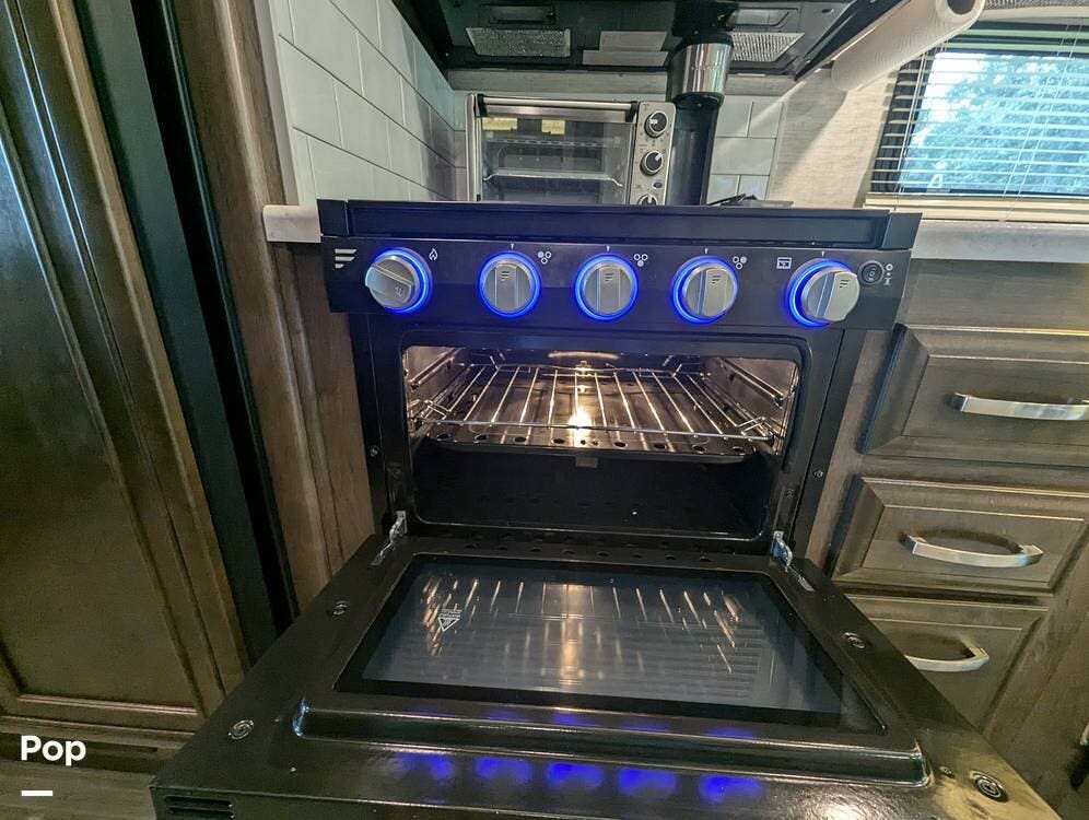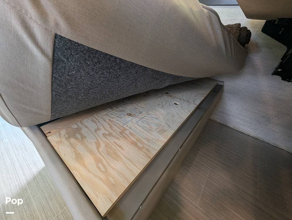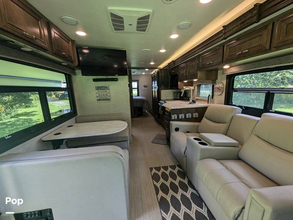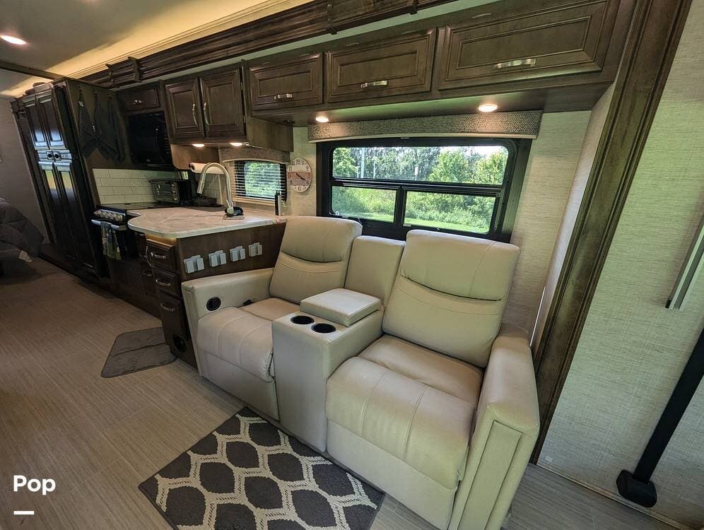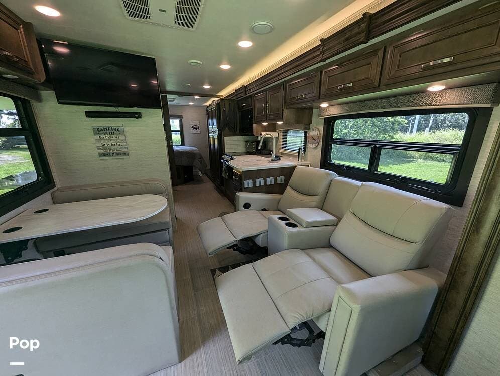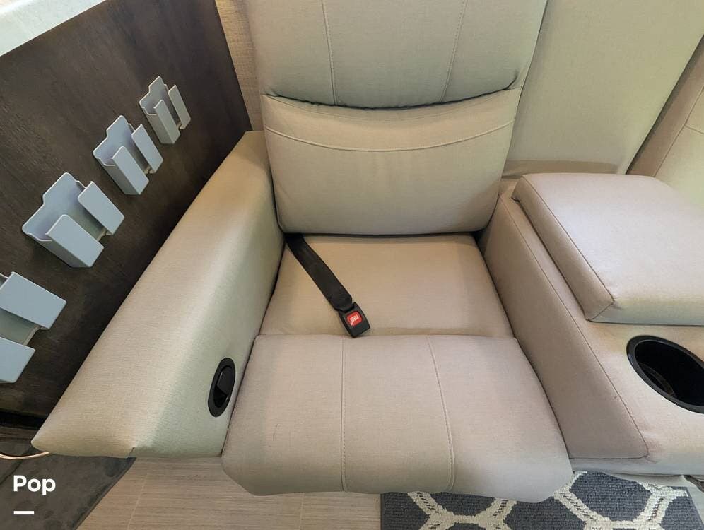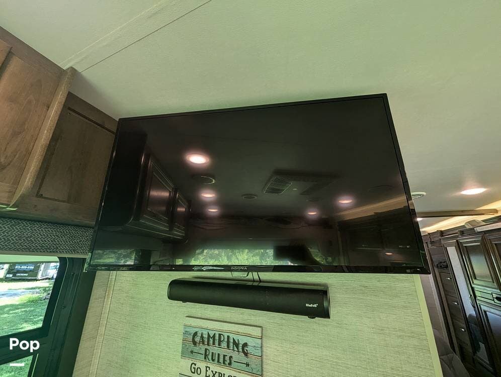 This coach comfortably sleeps 6. The master bedroom has a walkaround queen bed, there is an overhead Eurobed over the cab, and the dinette converts to sleep 2. Relax in the plush stadium recliners with the 39" LED HD Smart TV in easy view. The driver and passenger seats swivel to the rear for added seating when needed.
