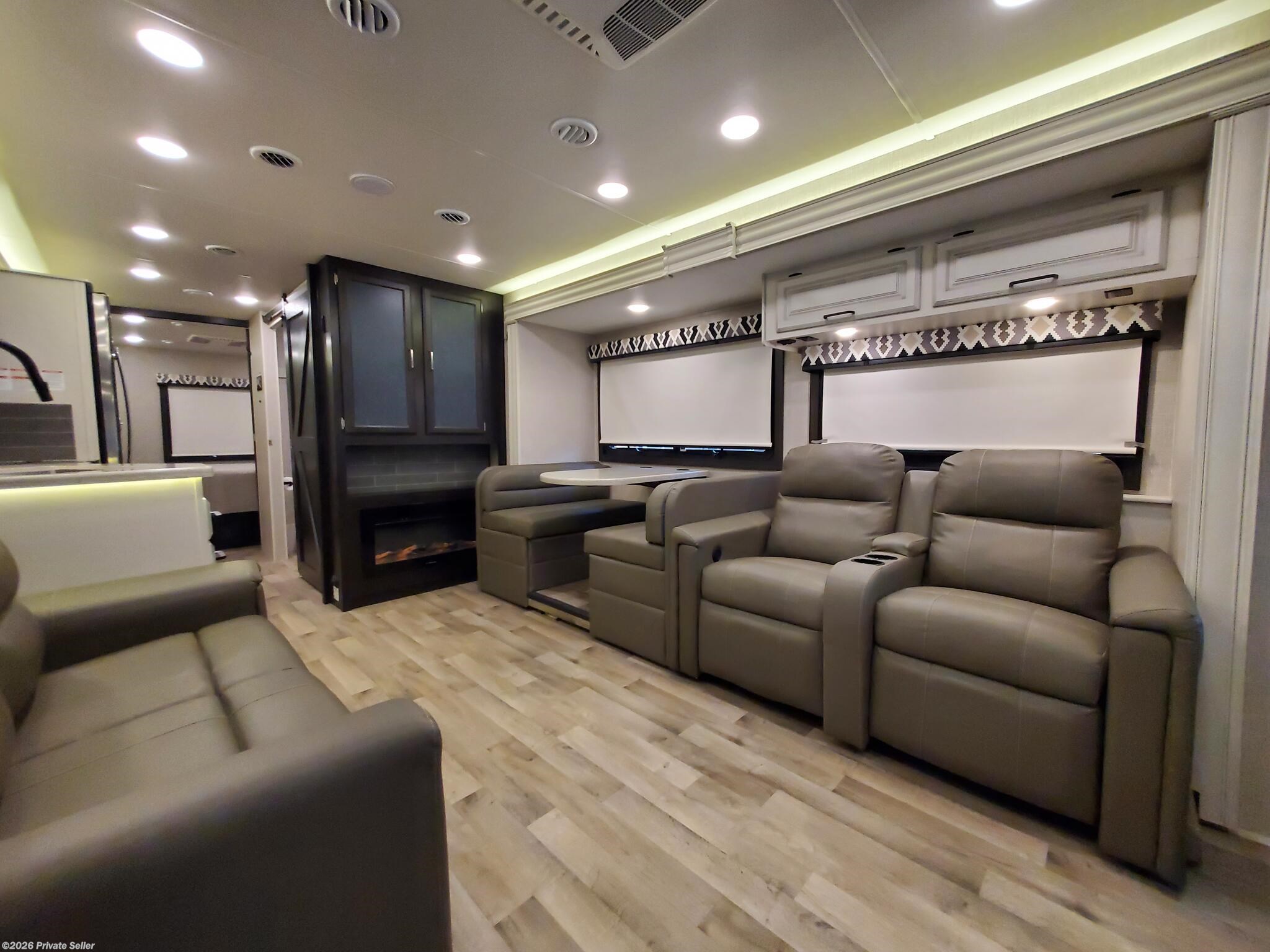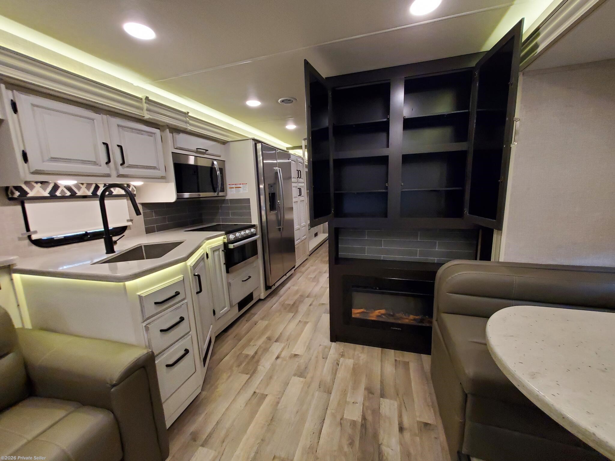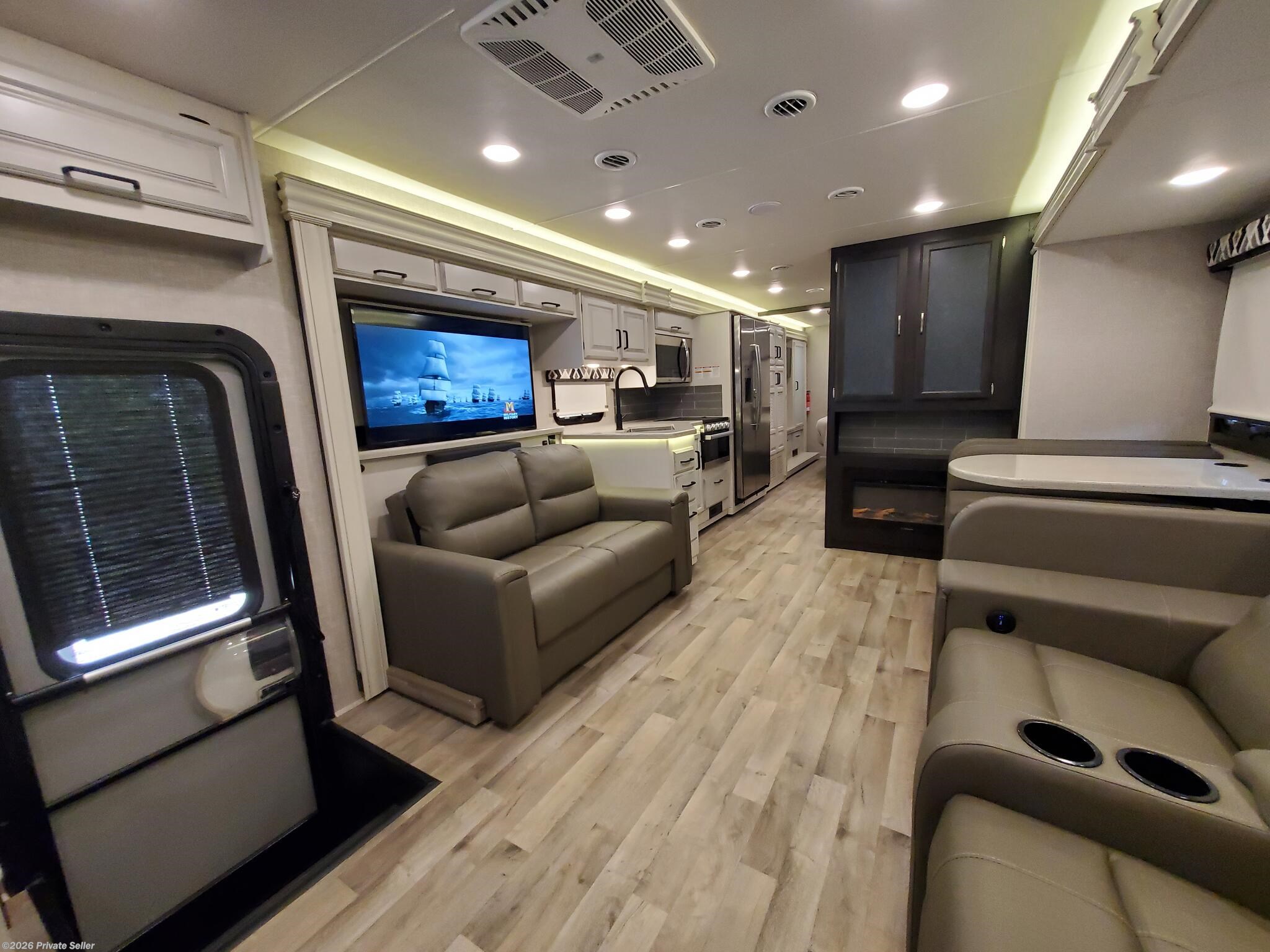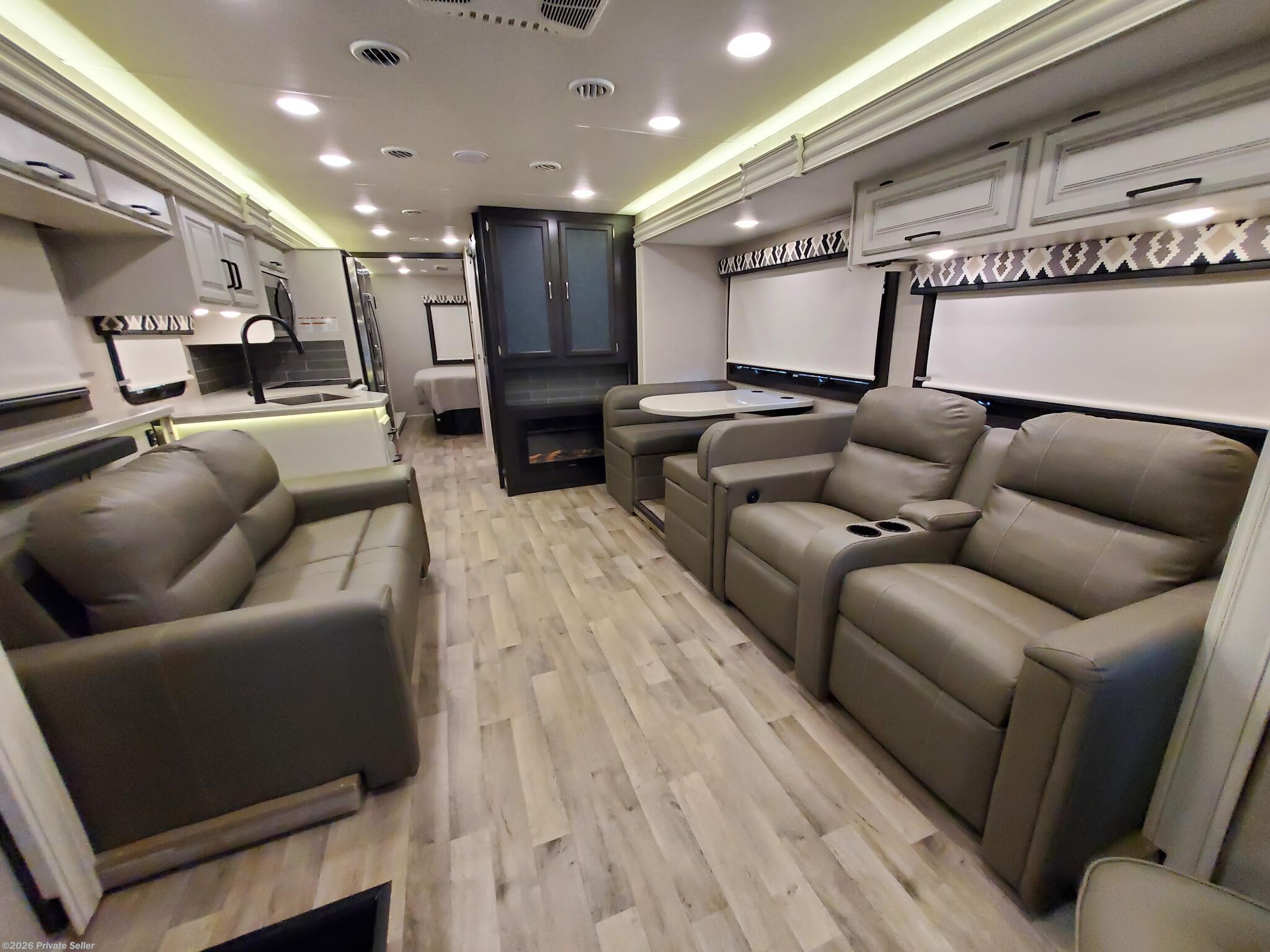 PRIVATE SELLER. 2022 Entegra Vision XL 34G Class A motorhome. This low mileage (12,051) gas coach is in excellent condition and super clean, always stored under covered parking. Original owners, non-smoking. Upgraded Lithium Ion 400AH house battery system is only 1 year old. Upgraded audio visual wiring system can sync all 3 interior and exterior televisions to your preferred satellite or cable signal. Outdoor entertainment center. Customized, adjustable, removable shelving added to all closets and pantries. The walk around king bed master, motorized overhead drop bunk, sleep sofa and convertible dining unit provide plenty of sleeping space for 6-8. Comfortable power reclining theater seats, motorized tv lift, Furion electric fireplace and day/night roller shades in living area. Residential size refrigerator and microwave, solid surface countertops, recessed stainless steel sinks, and water filtration system. Washer/dryer hookups in kitchen pantry closet.
