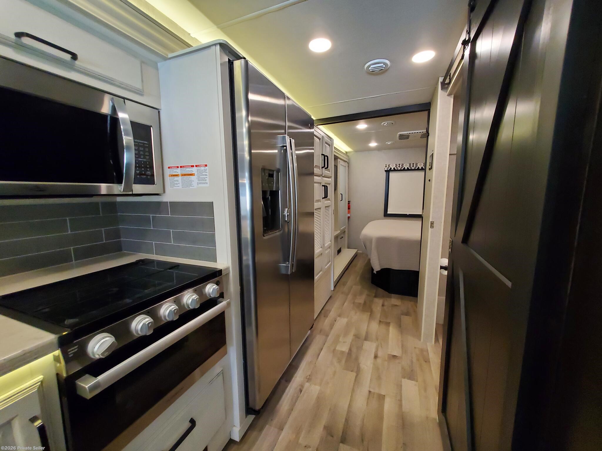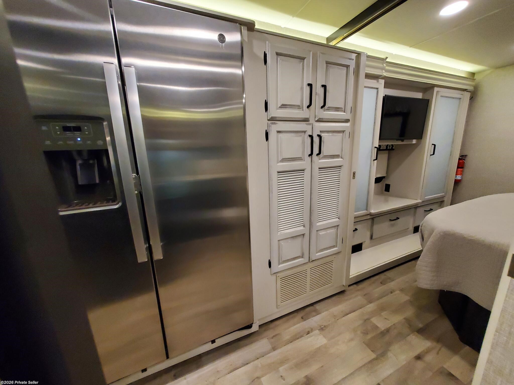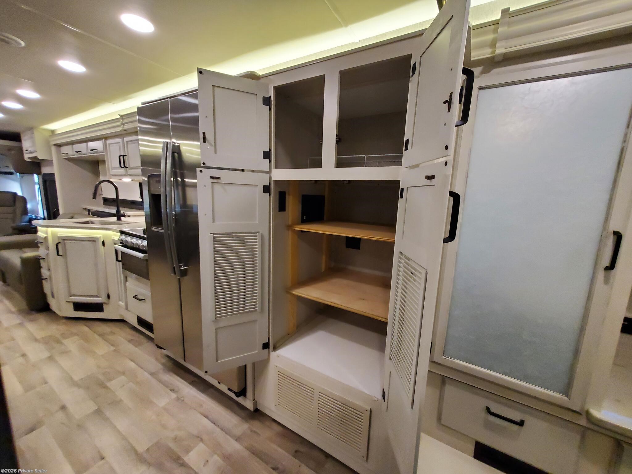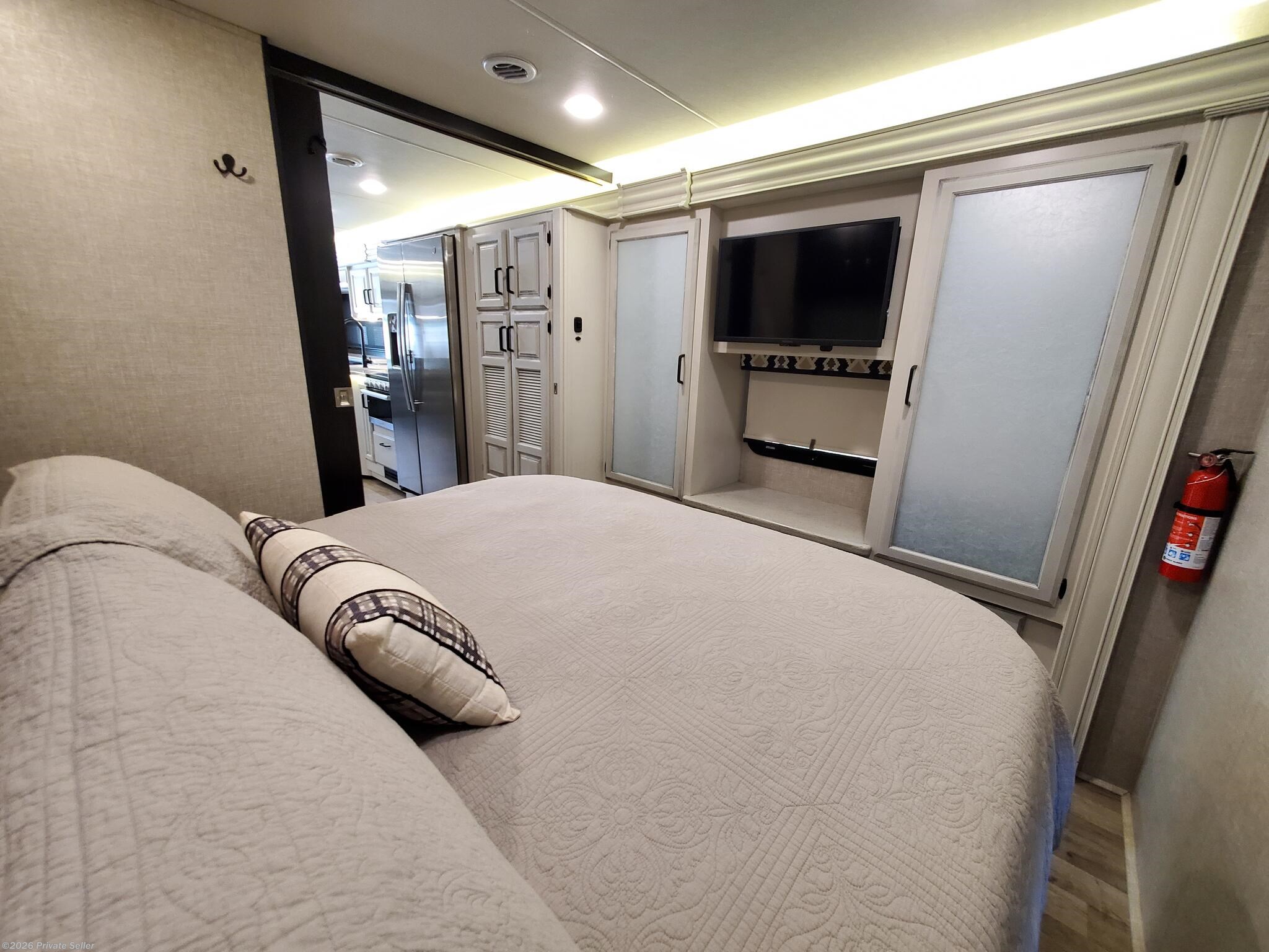 PRIVATE SELLER. 2022 Entegra Vision XL 34G Class A motorhome. This low mileage (12,051) gas coach is in excellent condition and super clean, always stored under covered parking. Original owners, non-smoking. Upgraded Lithium Ion 400AH house battery system is only 1 year old. Upgraded audio visual wiring system can sync all 3 interior and exterior televisions to your preferred satellite or cable signal. Outdoor entertainment center. Customized, adjustable, removable shelving added to all closets and pantries. The walk around king bed master, motorized overhead drop bunk, sleep sofa and convertible dining unit provide plenty of sleeping space for 6-8. Comfortable power reclining theater seats, motorized tv lift, Furion electric fireplace and day/night roller shades in living area. Residential size refrigerator and microwave, solid surface countertops, recessed stainless steel sinks, and water filtration system. Washer/dryer hookups in kitchen pantry closet.