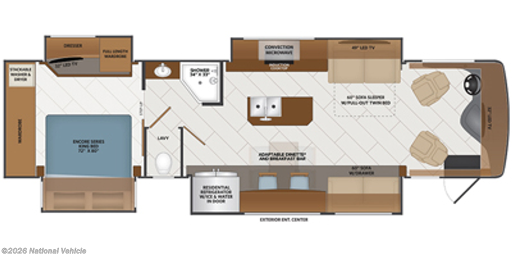 Step inside and take a look back at all of the convenient features that would make any journey enjoyable. The kitchen area features everything you need to prepare great meals on the go including a sink, a two burner range with microwave/convection oven, and a refrigerator/freezer with an ice maker. There is also plenty of storage for all of your dry and canned goods. Have a seat at the comfortable free standing dinette, where you can enjoy meals with your family.
