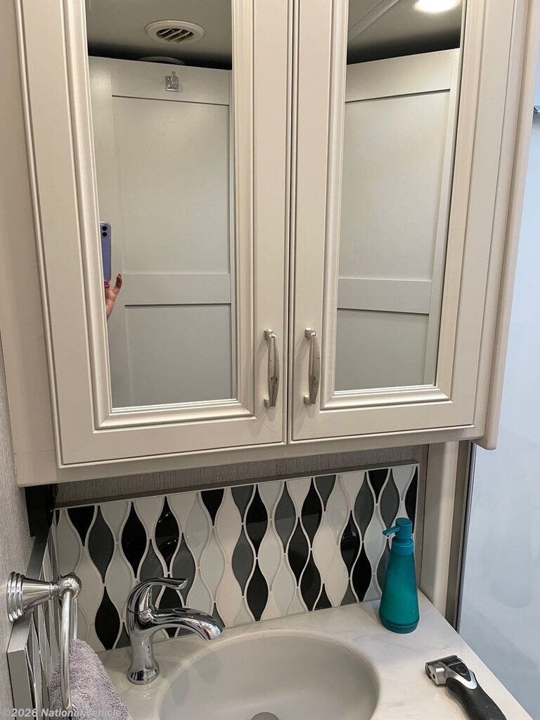 This coach features a bathroom complete with shower, toilet, and a sink with a medicine cabinet above for your convenience.