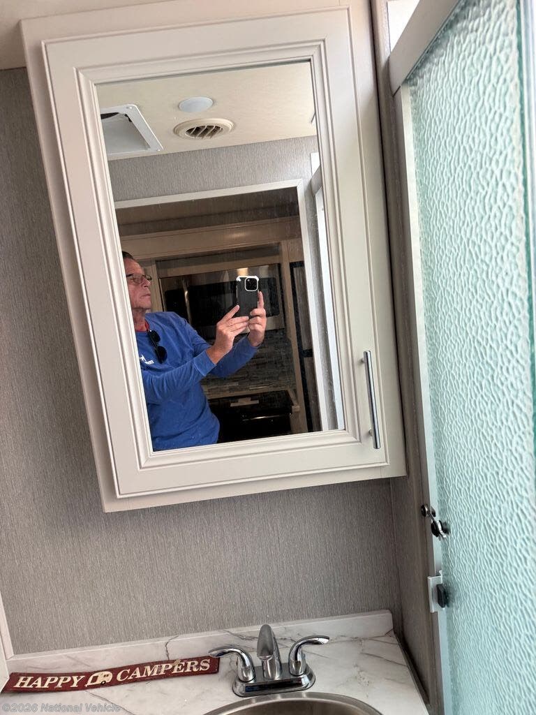 This Flair Class A gas motorhome is worth the investment! There is so much luxury and convenience included on this coach, like the Serenity Series RV king bed in the private bedroom, the residential refrigerator in the fully stocked kitchen, the Hide-A-Loft drop-down bunk above the cab, and the three LED TVs. You'll have a full bathroom with shower skylight so that you can keep clean while you're out adventuring, and the L-shaped dinette and jackknife sofa will both provide lounging and sleeping space. You can even turn the cab seats around to use the driver/passenger pedestal table as another lounge spot.