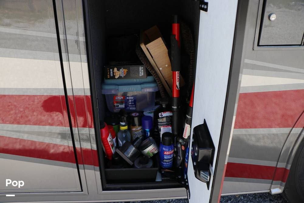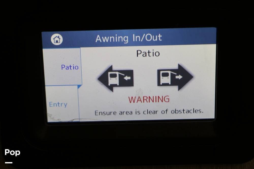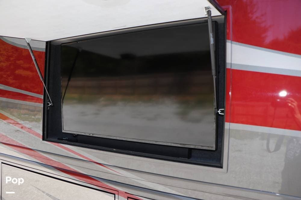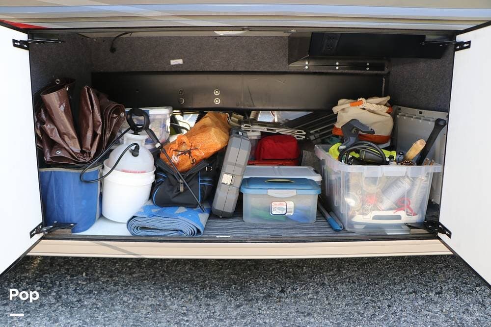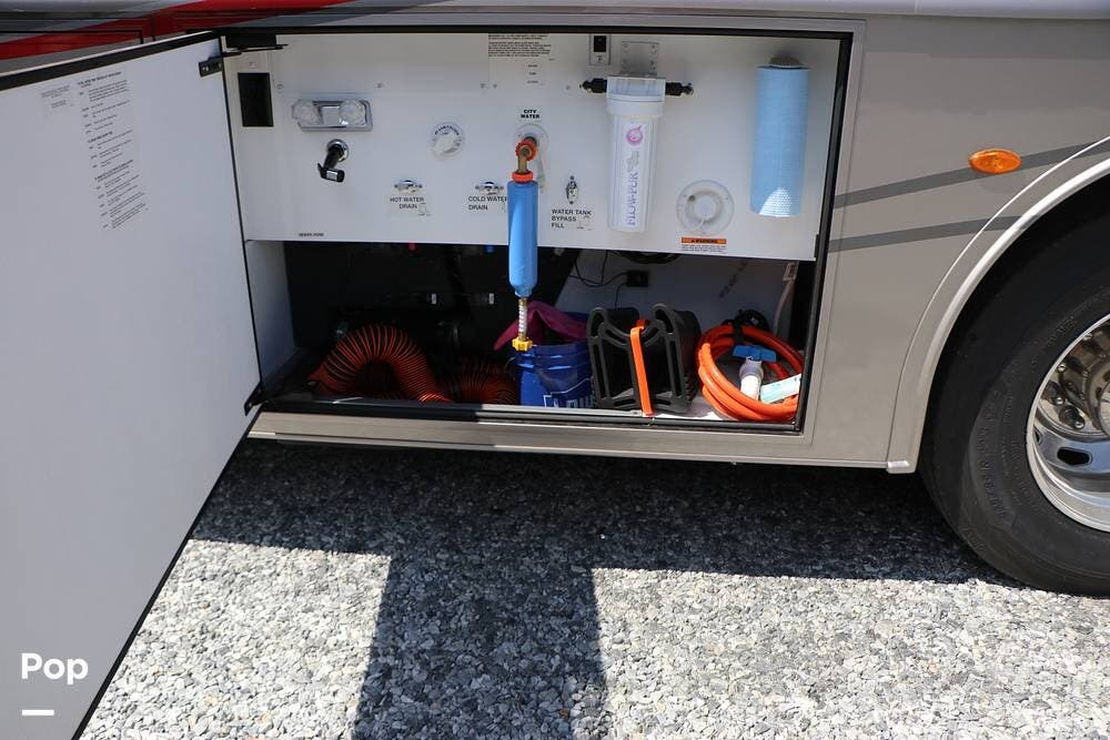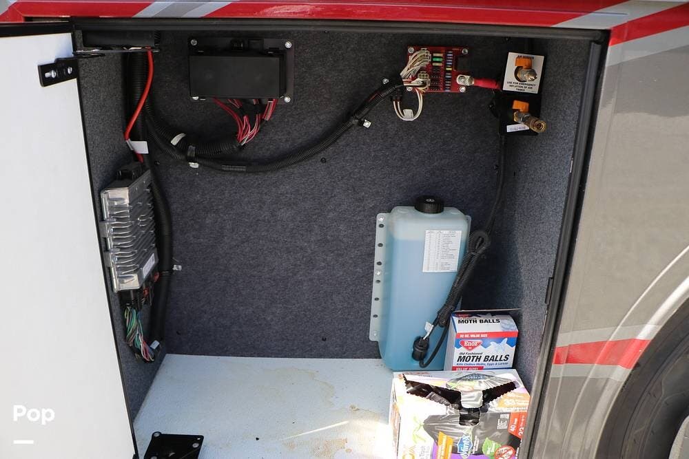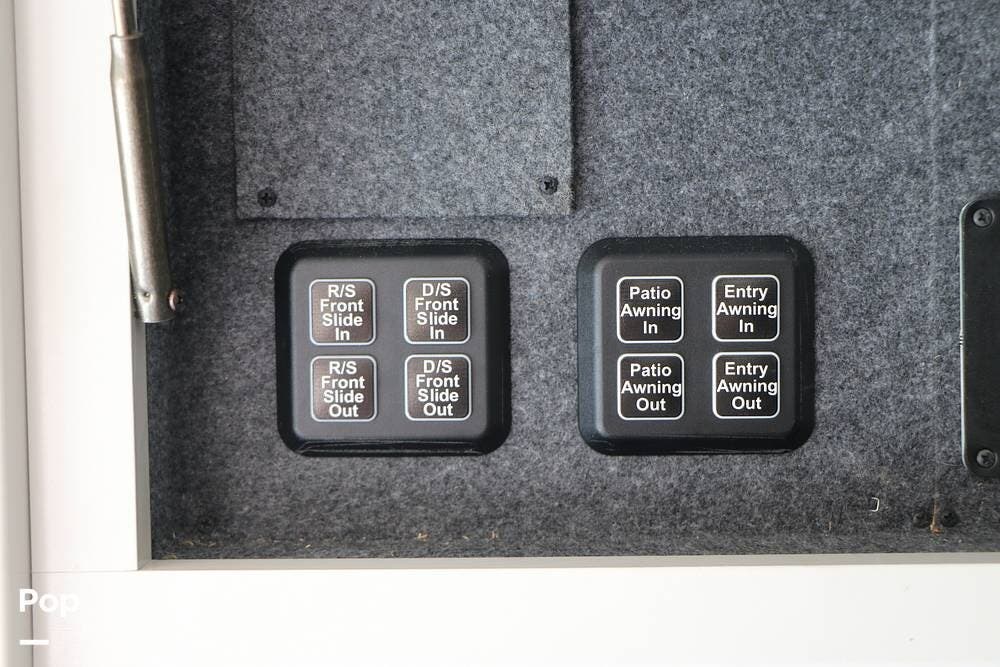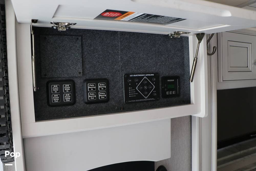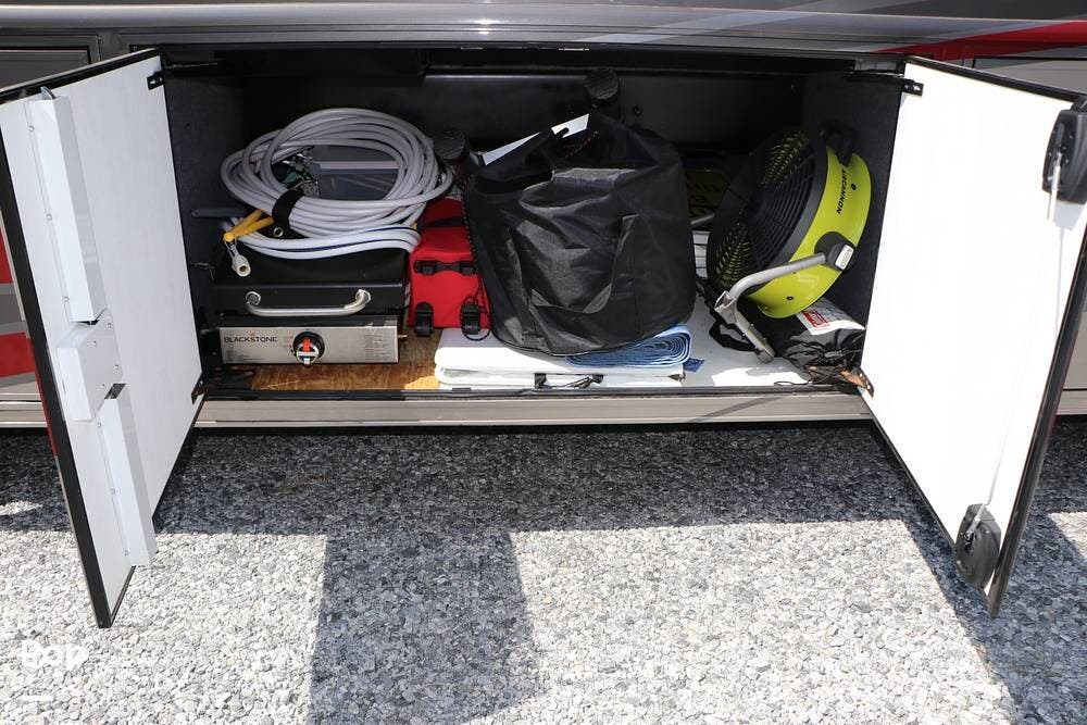 Outside, the Exterior TV and sound bar make this a great RV for tailgating, along with the two Power Patio Awnings that also feature auto-retracting capabilities for inclement weather. All of the slides have slide toppers, and there is ample exterior storage space as shown in the photos. All of the RV systems are clearly marked and easily accessible.