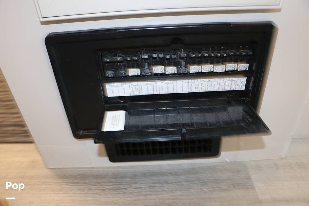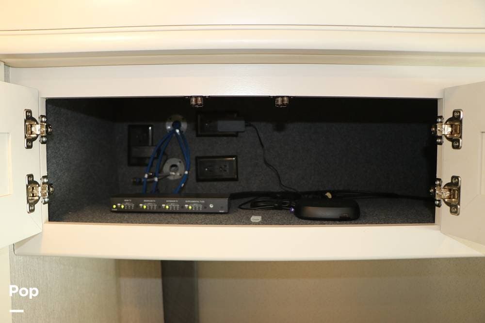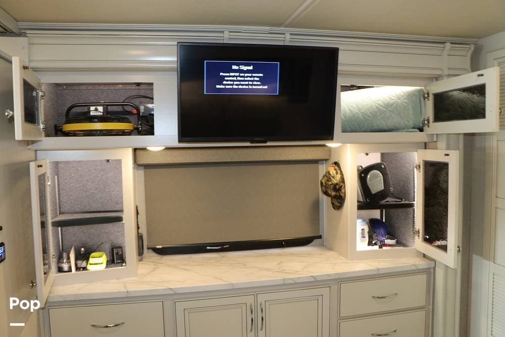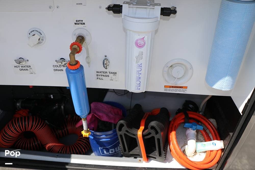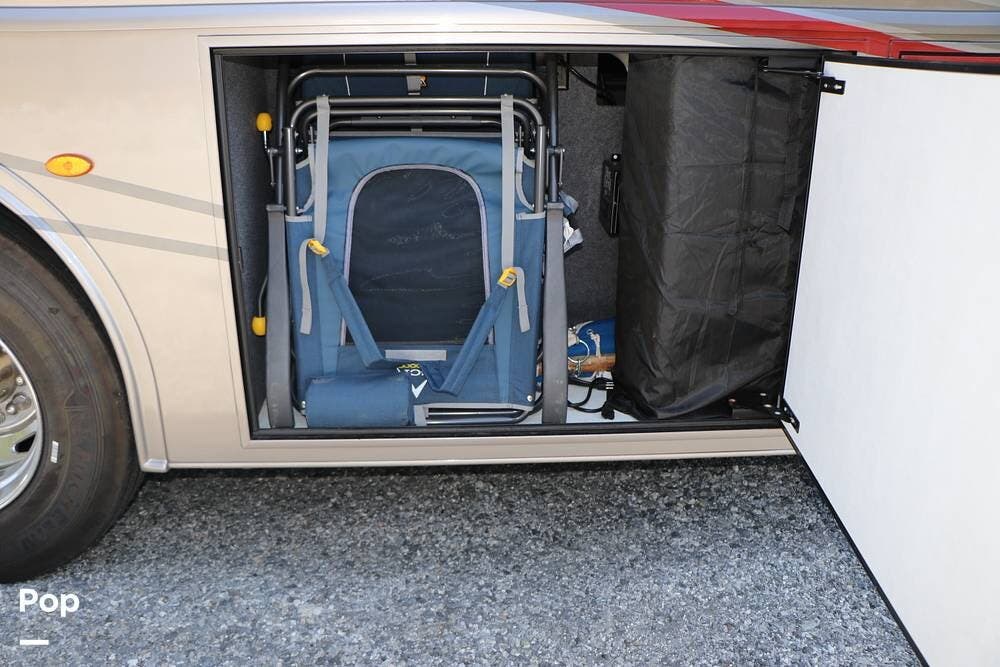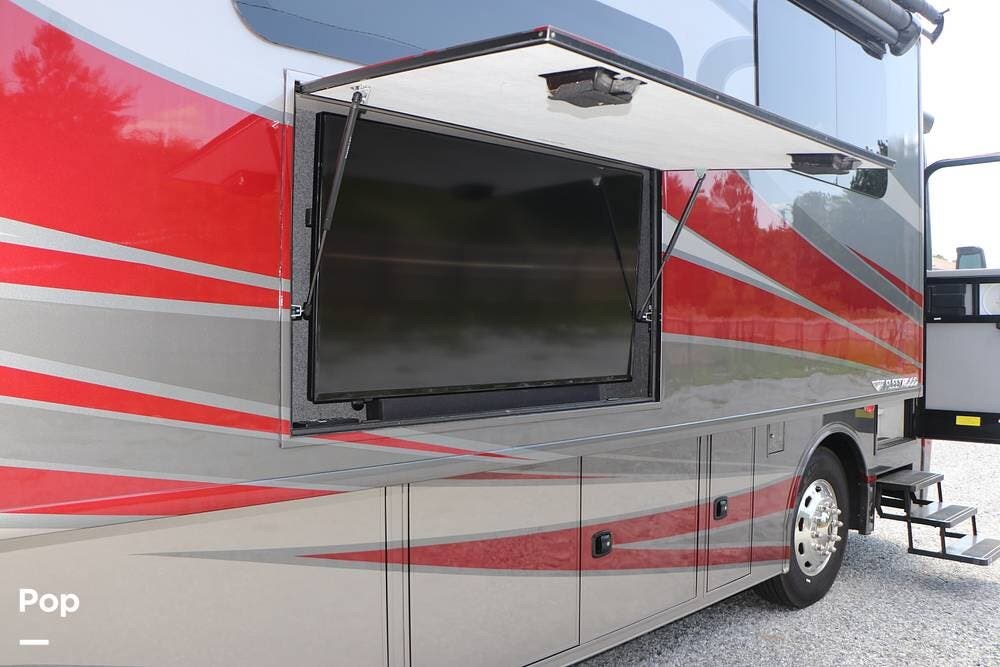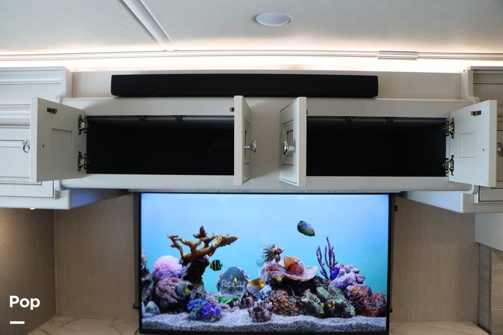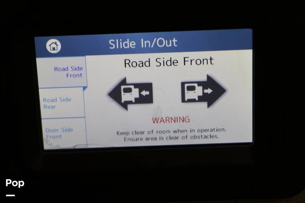 Outside, the Exterior TV and sound bar make this a great RV for tailgating, along with the two Power Patio Awnings that also feature auto-retracting capabilities for inclement weather. All of the slides have slide toppers, and there is ample exterior storage space as shown in the photos. All of the RV systems are clearly marked and easily accessible.