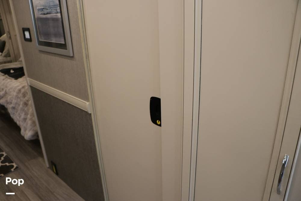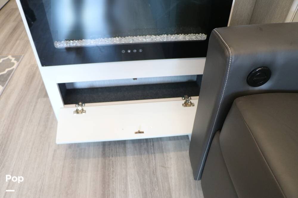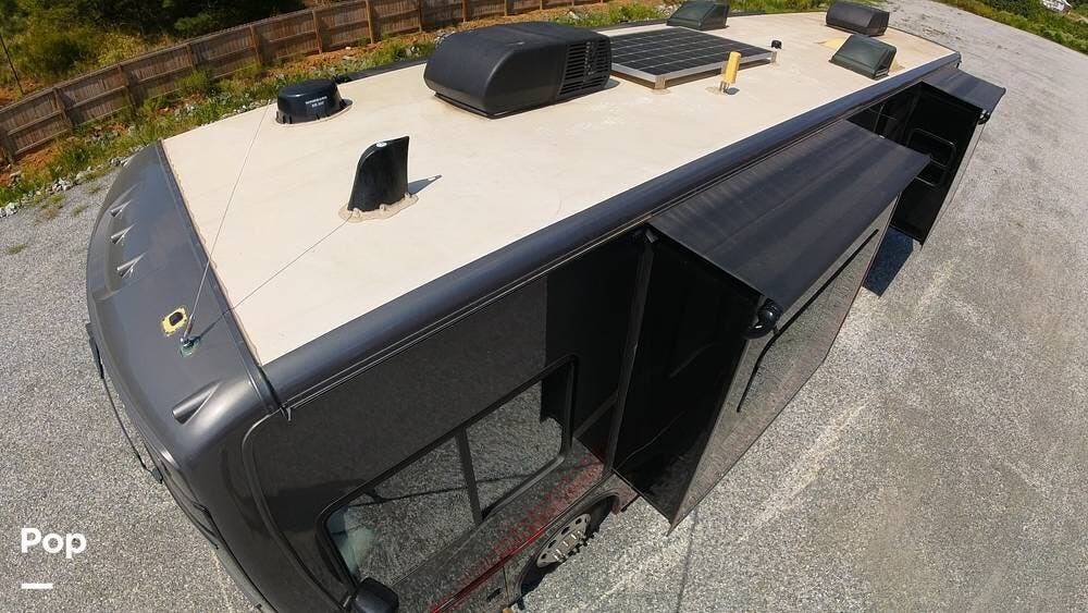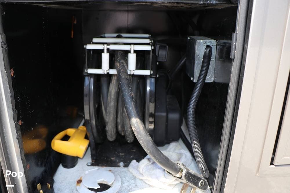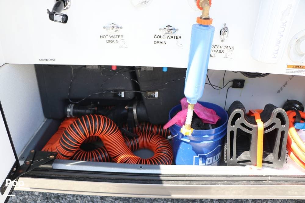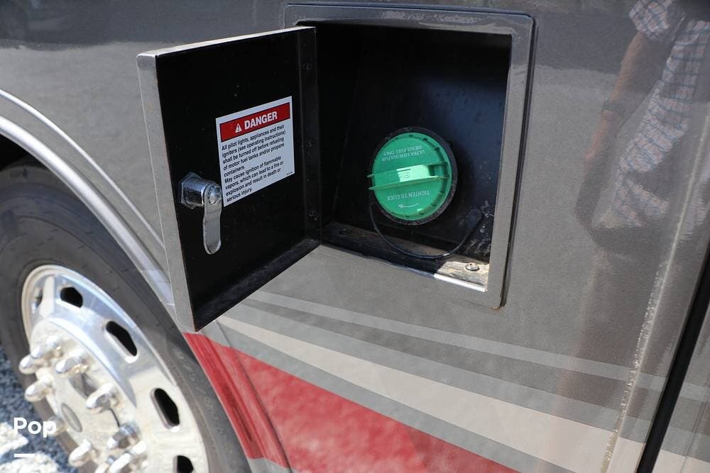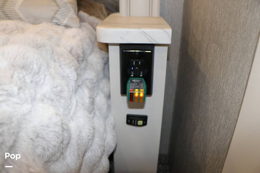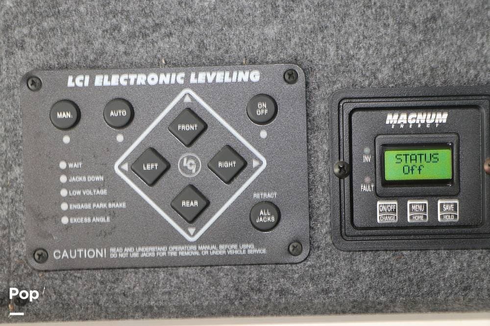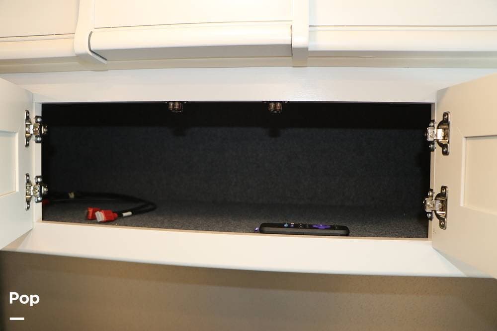 Outside, the Exterior TV and sound bar make this a great RV for tailgating, along with the two Power Patio Awnings that also feature auto-retracting capabilities for inclement weather. All of the slides have slide toppers, and there is ample exterior storage space as shown in the photos. All of the RV systems are clearly marked and easily accessible.