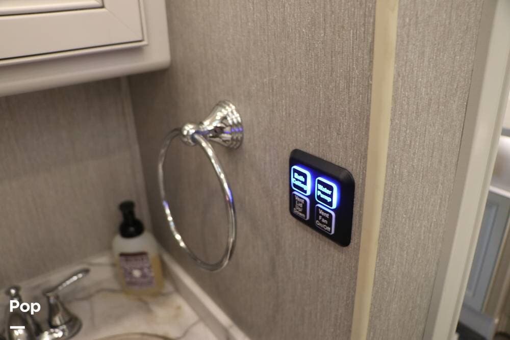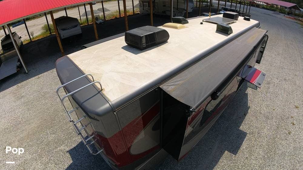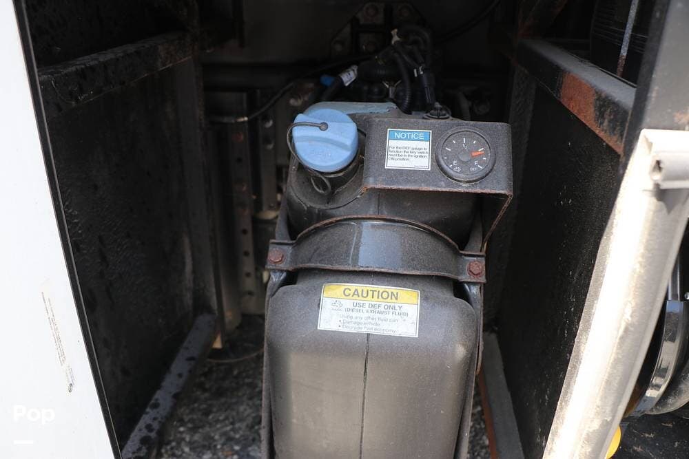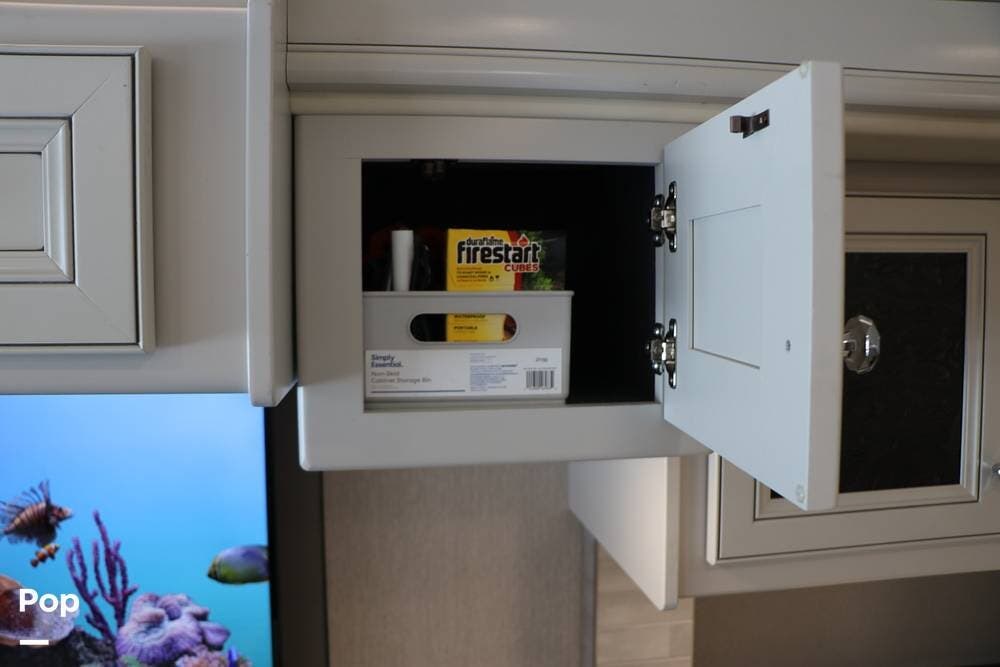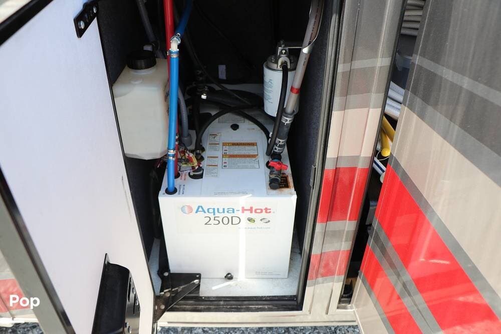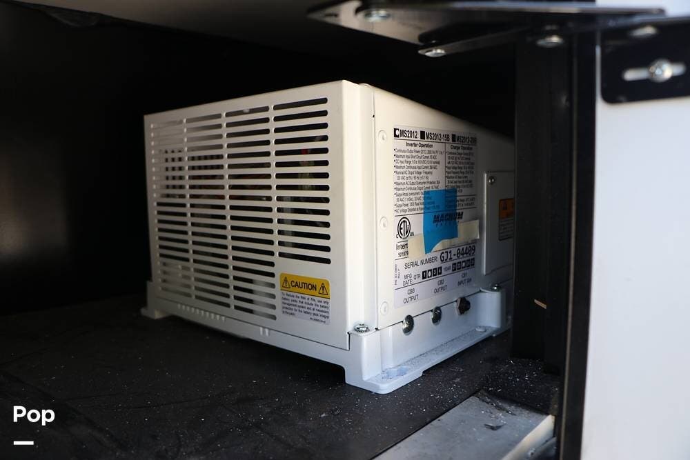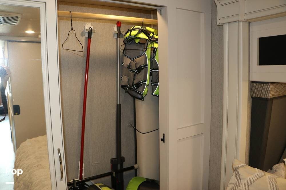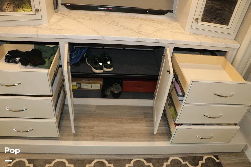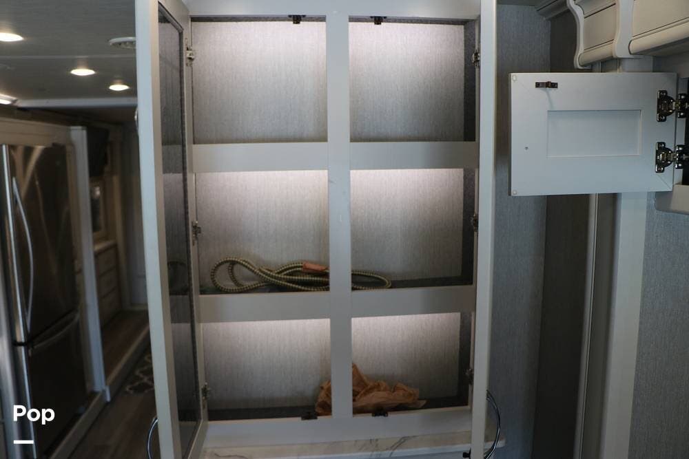 Outside, the Exterior TV and sound bar make this a great RV for tailgating, along with the two Power Patio Awnings that also feature auto-retracting capabilities for inclement weather. All of the slides have slide toppers, and there is ample exterior storage space as shown in the photos. All of the RV systems are clearly marked and easily accessible.