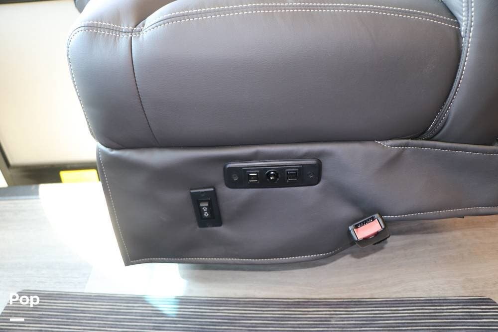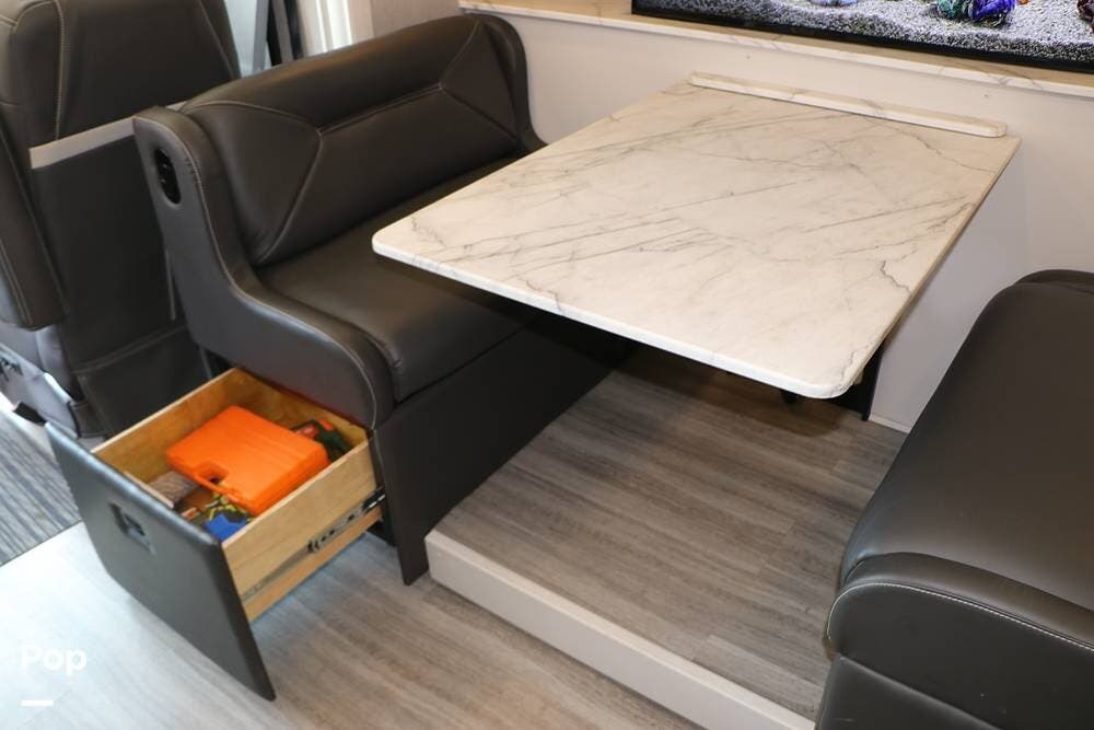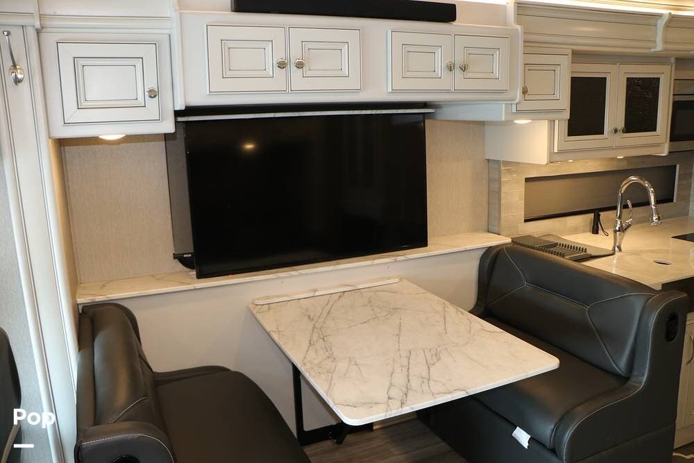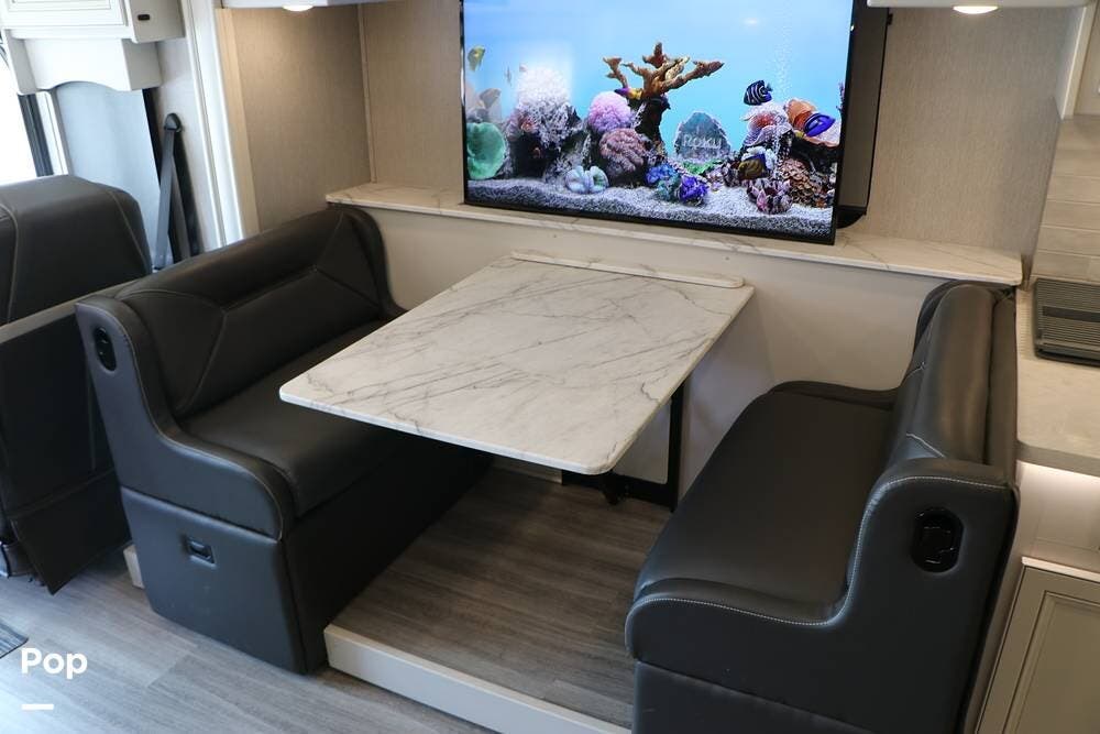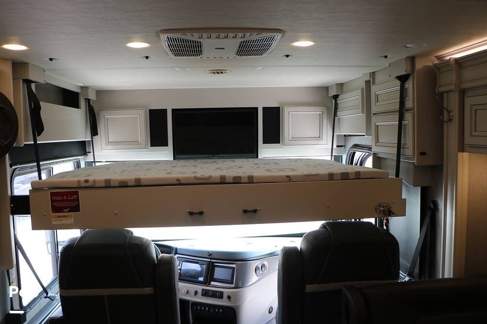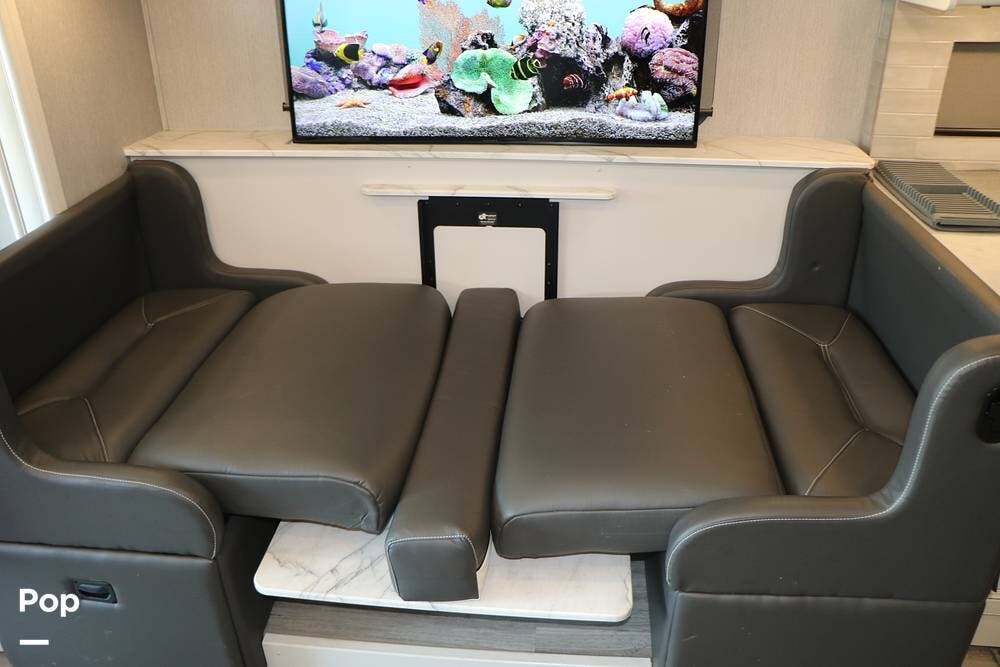 The interior is plush and comfortable - with sleeping accommodations for up to six adults, the twin recliners directly face the large flat-screen Smart TV on a lift behind the dinette table, which quickly converts into a third sleeping area if needed. The drop-down Euro bed over the driver's and passenger's Captains' Chairs, and, of course, the king-size bed that tilts for reading or watching TV in the master bedroom.