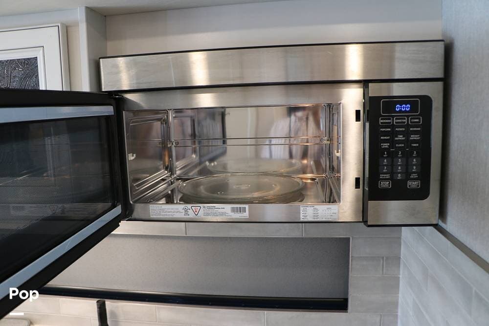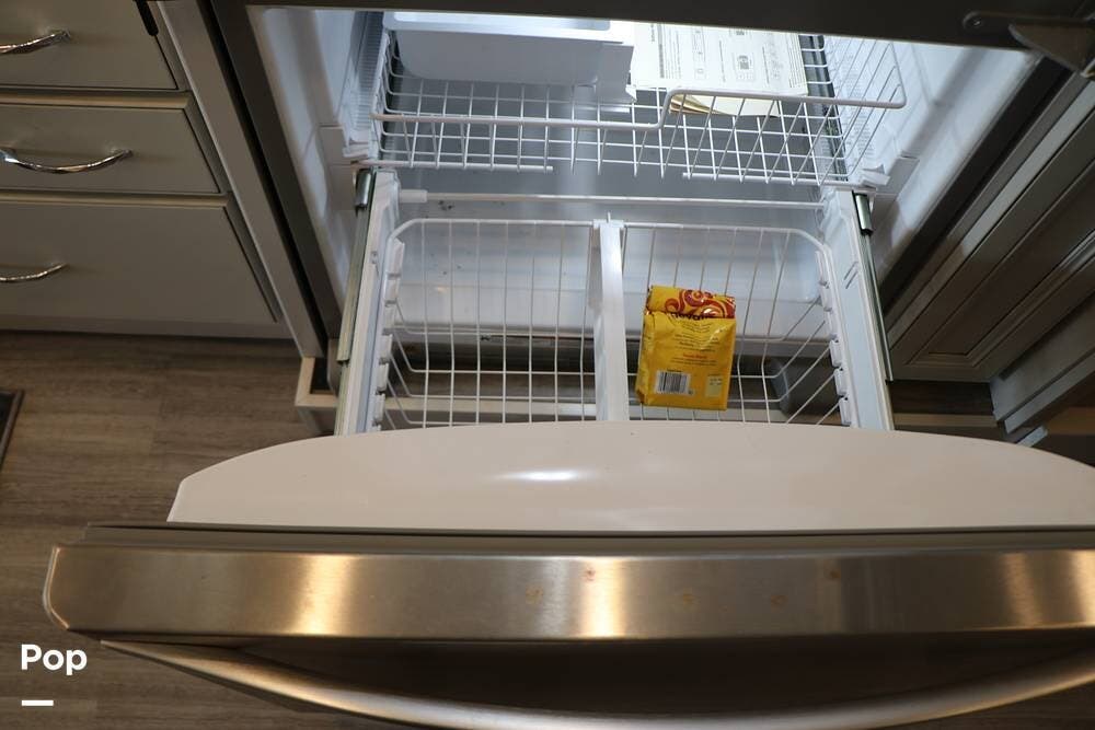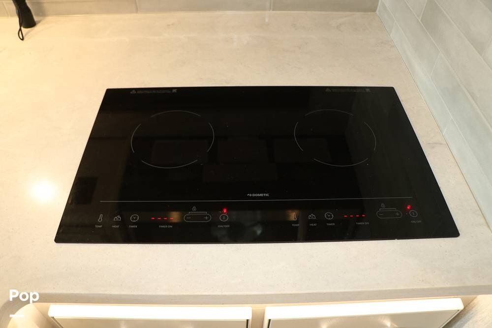 The galley is fully equipped with a convection microwave oven, a 2-burner Induction stovetop - No Propane, a double stainless steel kitchen sink with matching covers to the solid surface counter tops that run throughout the RV, and a residential stainless steel 3-door refrigerator/freezer that can run off of AC (Shore or Generator) or the 2000 Watt Inverter.