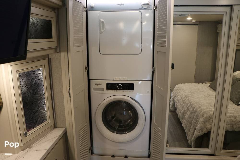 The upgrades include stacked clothes washer and dryer units, a central vacuum system, power theater seating, a Wi-Fi Ranger Sky 4 Pro Pack, a 300W Solar Panel and Cellular Booster, a Power Cord Take-up Reel, a double-wide full-width Storage bay in the Basement, an Aqua Hot 250D water heater, and Dual 15M AC units.
