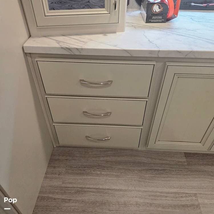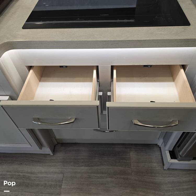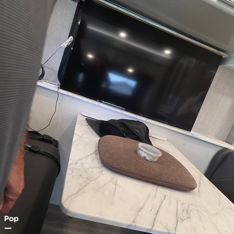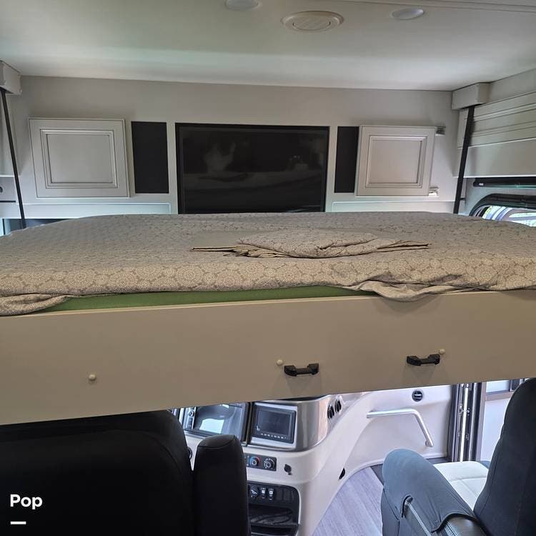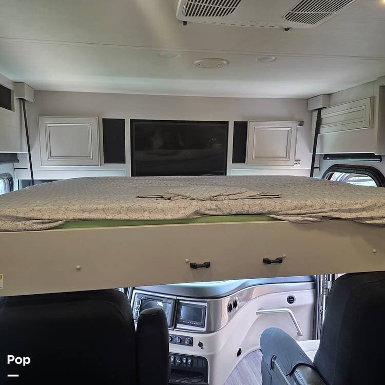 The interior is plush and comfortable - with sleeping accommodations for up to six adults, the twin recliners directly face the large flat-screen Smart TV on a lift behind the dinette table, which quickly converts into a third sleeping area if needed. The drop-down Euro bed over the driver's and passenger's Captains' Chairs, and, of course, the king-size bed that tilts for reading or watching TV in the master bedroom.