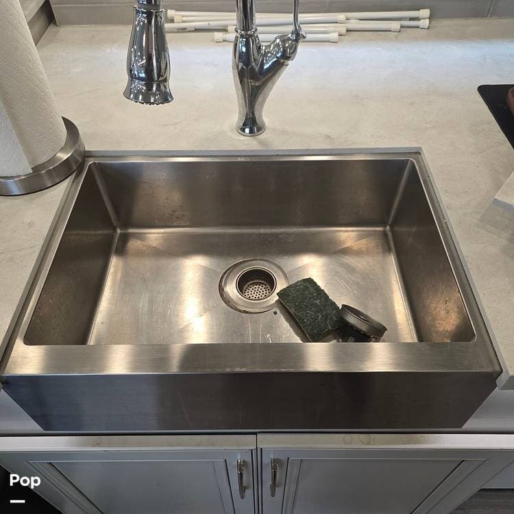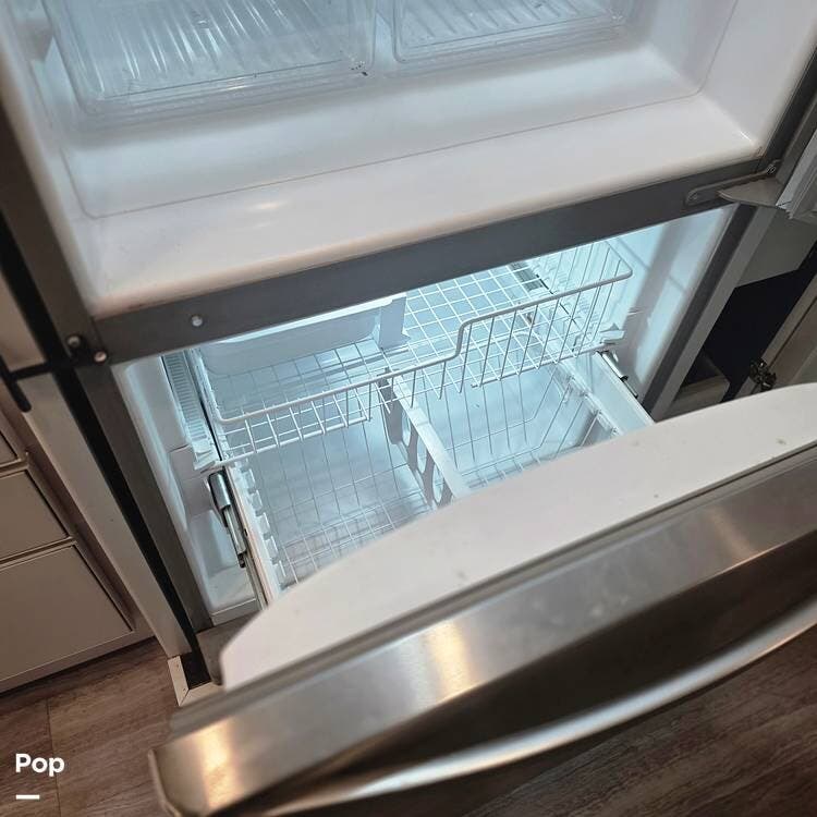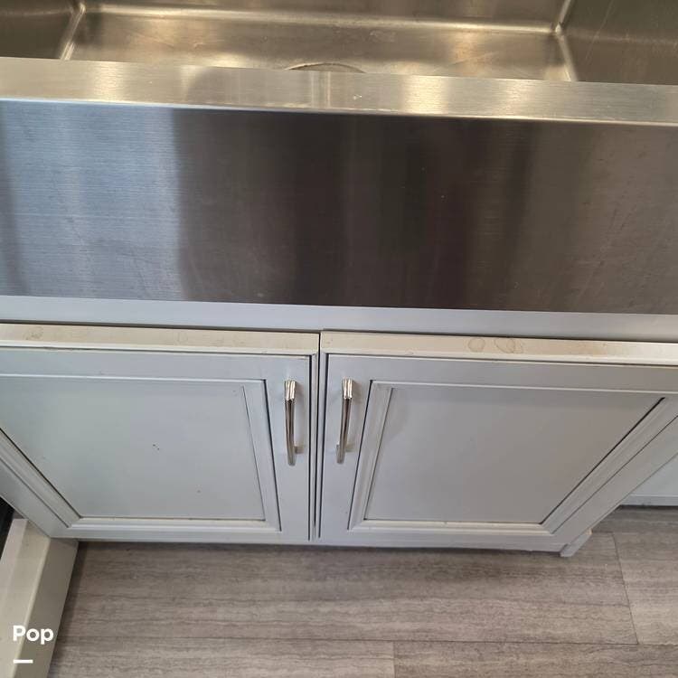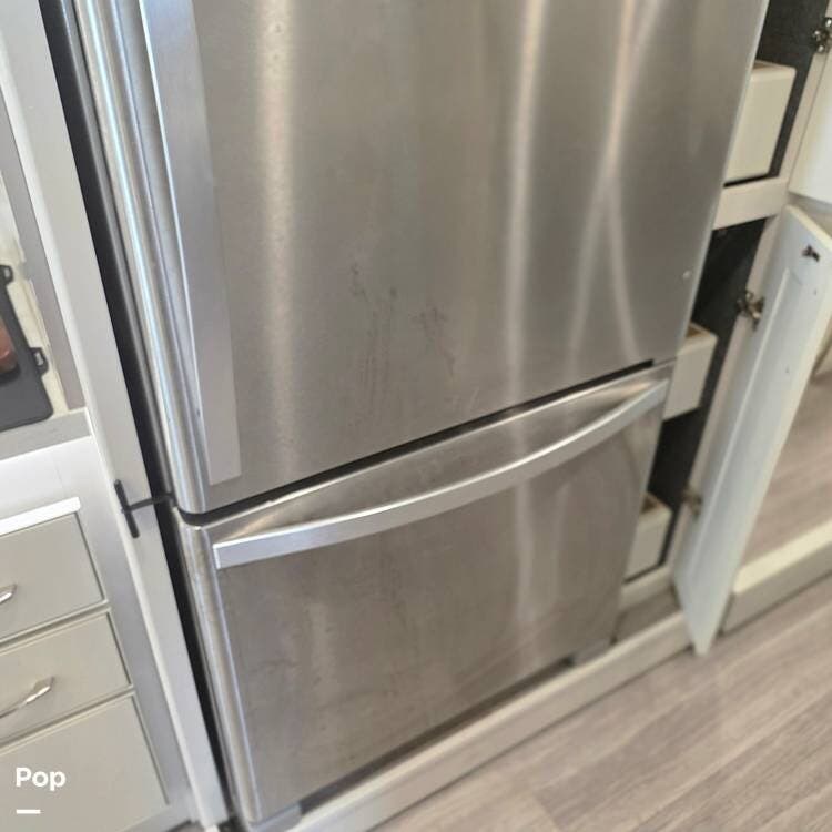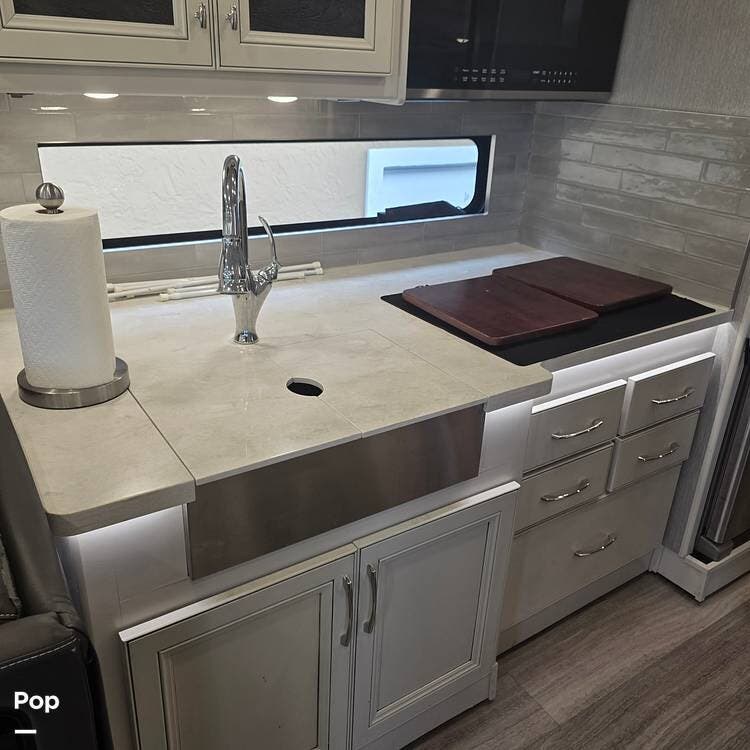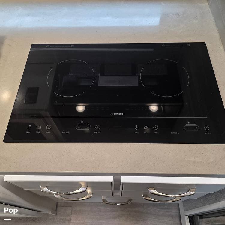 The galley is fully equipped with a convection microwave oven, a 2-burner Induction stovetop - No Propane, a double stainless steel kitchen sink with matching covers to the solid surface counter tops that run throughout the RV, and a residential stainless steel 2-door refrigerator/freezer that can run off of AC (Shore or Generator) or the 2000 Watt Inverter an Aqua Hot 250D water heater,