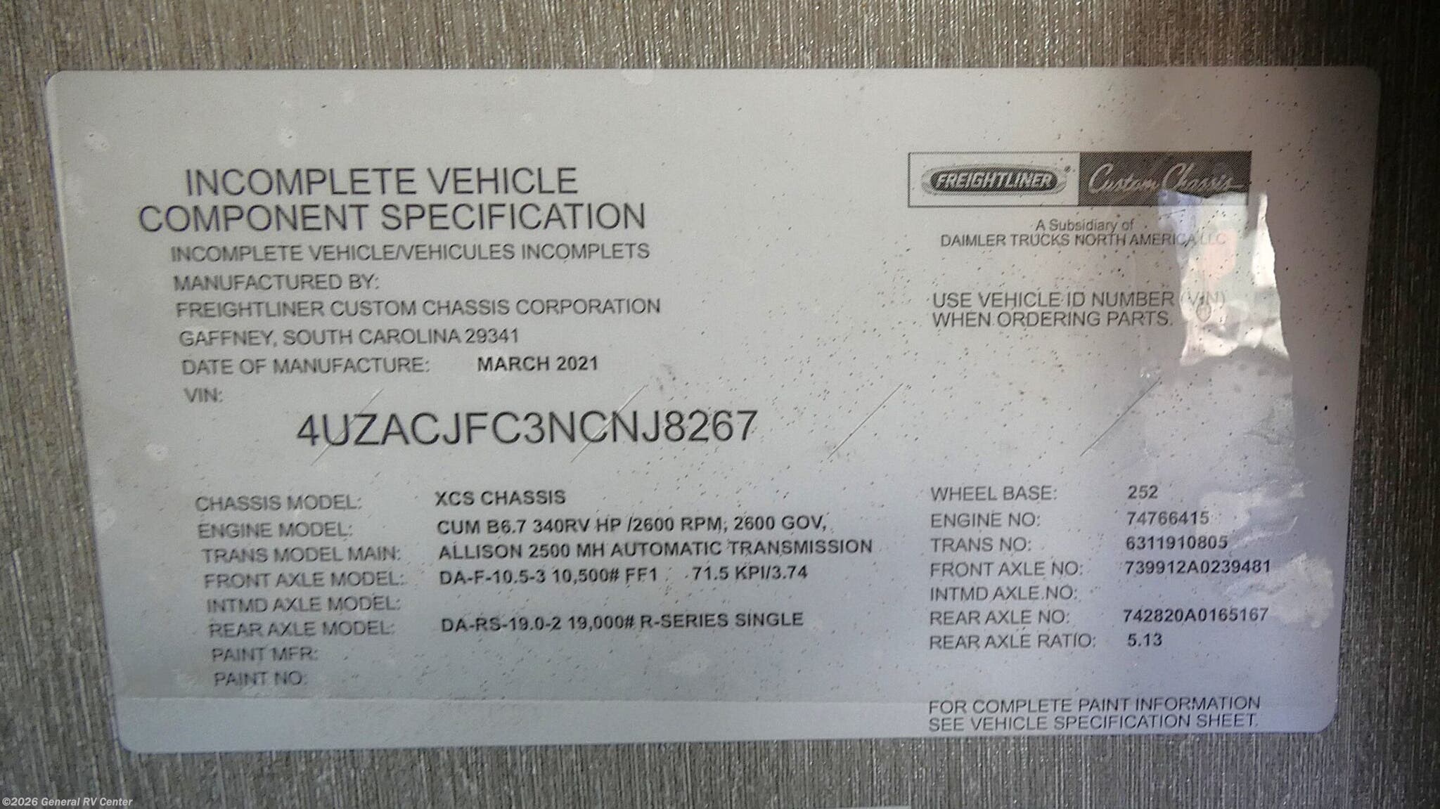 - VIN4UZACJFC3NCNJ8267