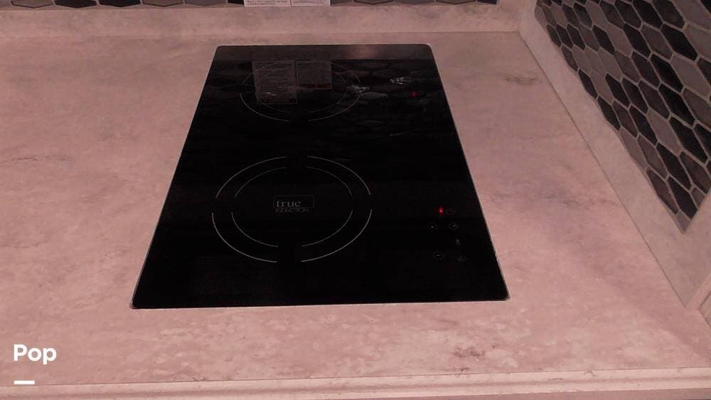 It is equipped with an exceptionally well-furnished kitchen, featuring ample counter space, dual sinks, an electric cooktop, a full-sized refrigerator and freezer, extensive cabinetry, and a pull-out pantry.