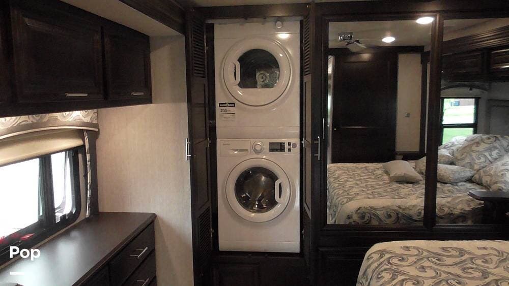 The RV boasts beautiful tile floors and a spacious bedroom with a king-size bed. The bedroom is equipped with ample closet space and a washer and dryer conveniently located within the closet. Additionally, it features a spacious bathroom with a full-size shower stall.