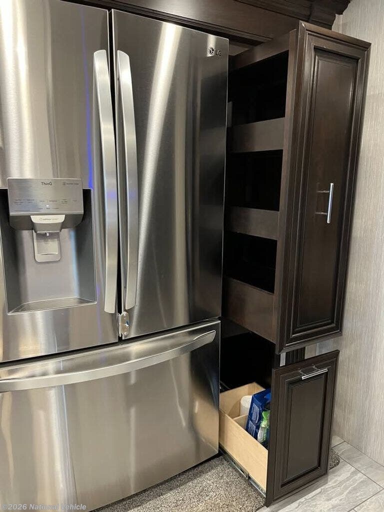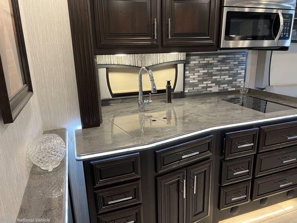The chef?s kitchen is a masterpiece, featuring a two-burner induction cooktop, 30" convection microwave with exhaust fan, 23 cu. ft. French-door residential refrigerator, and slide-out pantry. The booth dinette doubles as extra sleeping space, while the hide-a-bed sofa and side-by-side recliners provide comfort and relaxation for the whole family. Aqua Hot hydronic heat keeps the interior cozy and provides instant hot water, while three AC units maintain the perfect climate.