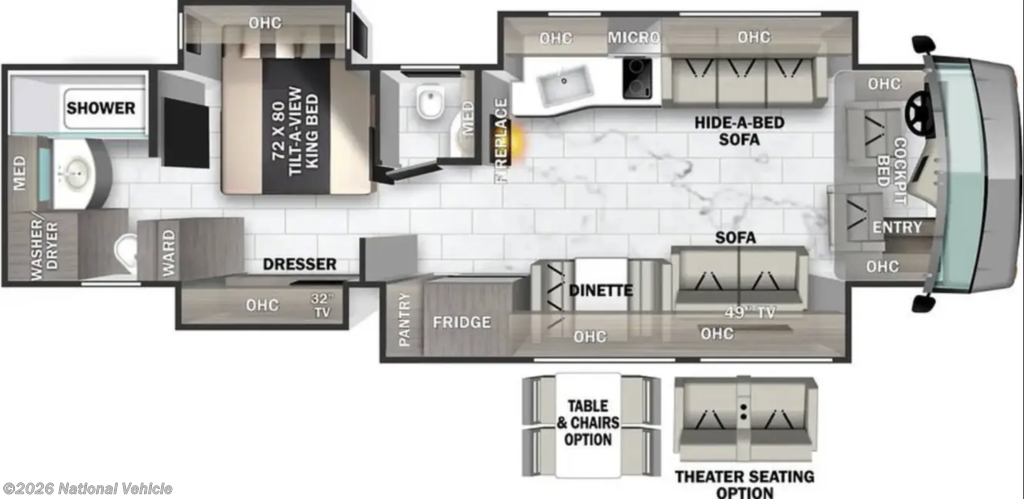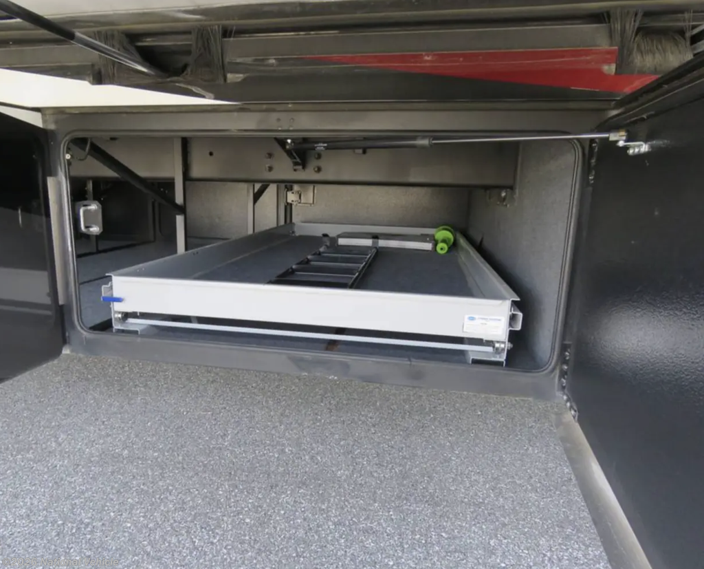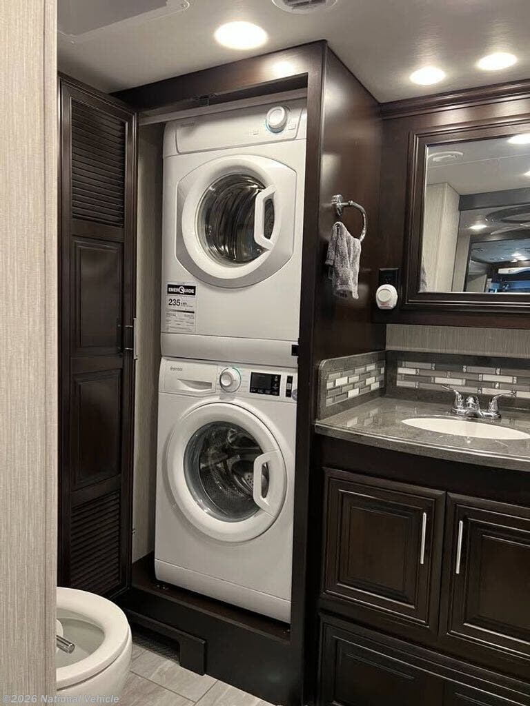 Inside, every detail exudes luxury. A cab-over bunk with 32" LED TV welcomes guests, while the rear master suite offers a private LED TV, full rig control panel, and heated porcelain tile floors for a first-class experience. The rear full bath includes a shower, dual wardrobes, and stackable washer and dryer, complemented by a midship half bath for convenience and privacy. Three interior LED TVs and an exterior entertainment center with 43" LED TV, Bluetooth radio, and outdoor speakers ensure entertainment wherever you roam.