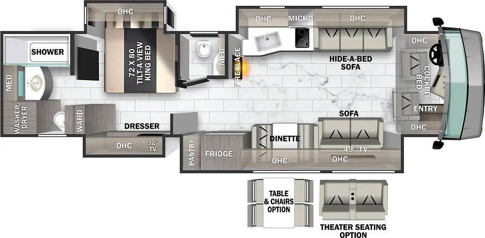 Extra guests? You are covered with the electric drop-down, queen-size bunk over the cockpit area, which includes a 32" LED TV. A unique upgrade that is hard to find on any diesel pusher.