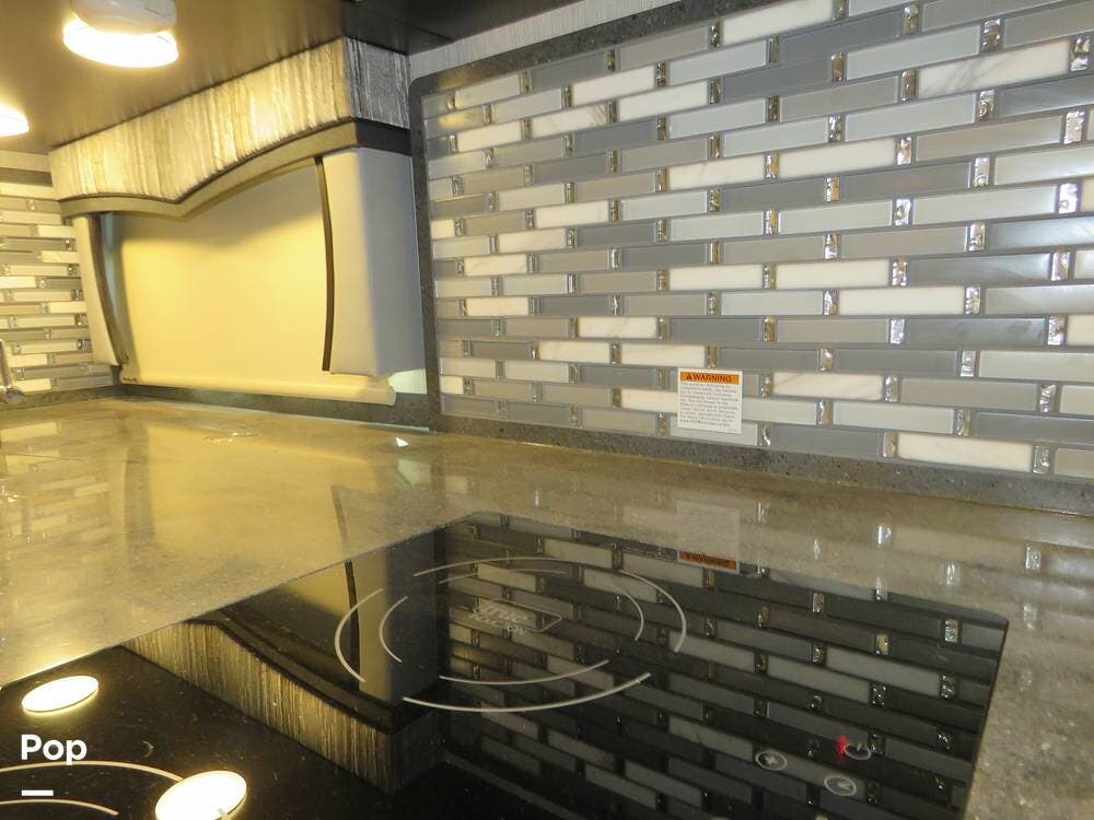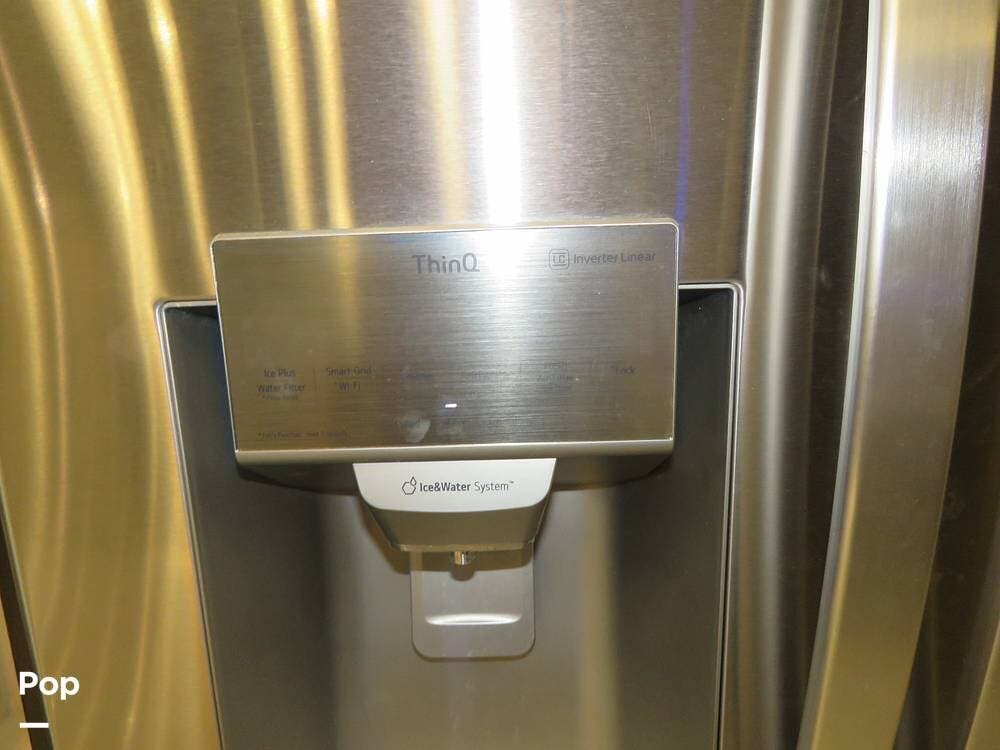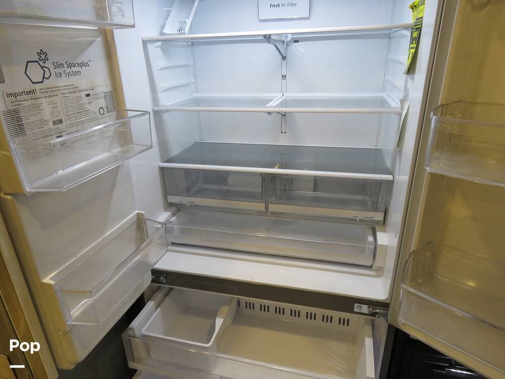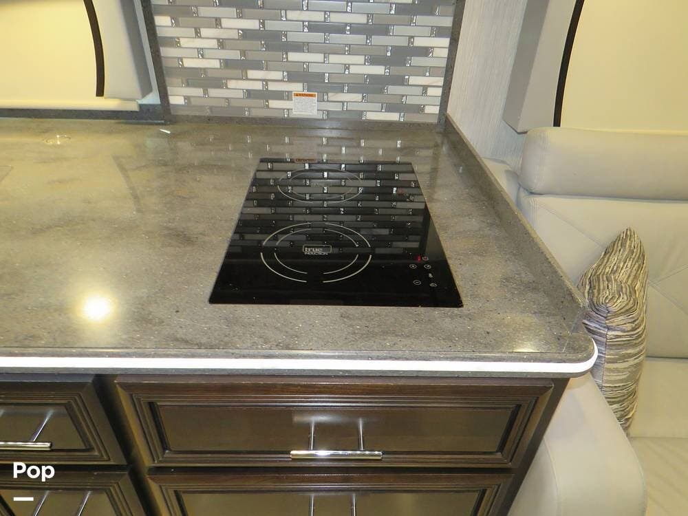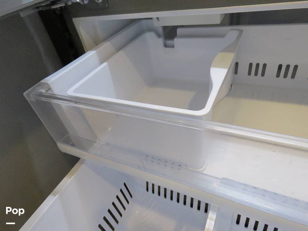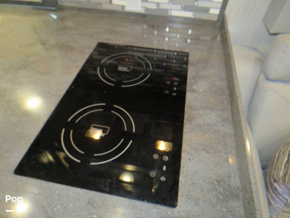 Snazzy two burner induction cooktop is complimented by the stainless-steel refrigerator w/French doors, freezer drawer, water and ice dispenser (includes 2,800-watt inverter and 2 additional 12-volt coach batteries).