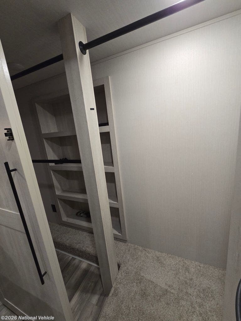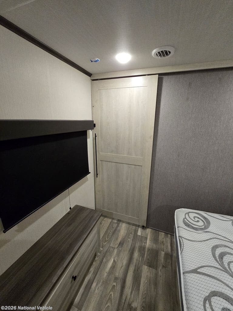 A private mid-bunk/office suite makes this floorplan especially desirable, offering flexible space for remote work, guests, or additional storage. The luxurious master bedroom features a residential king bed, abundant closet space, washer/dryer prep, and a spa-inspired bathroom with a spacious shower and premium fixtures.