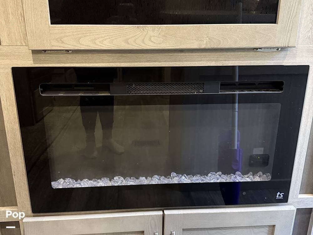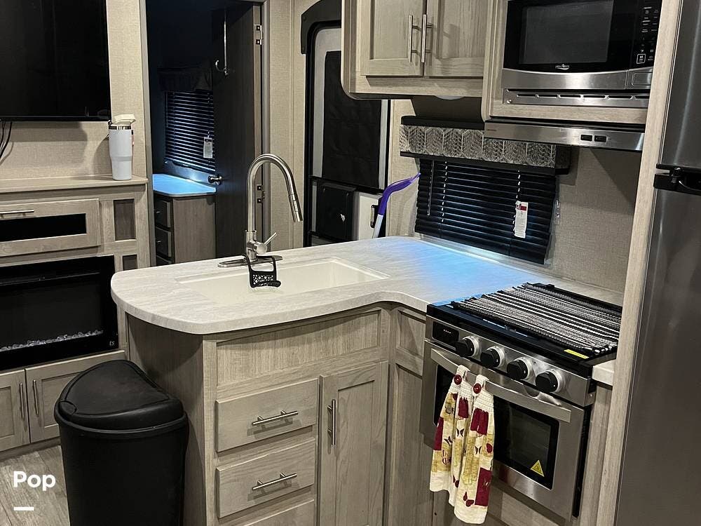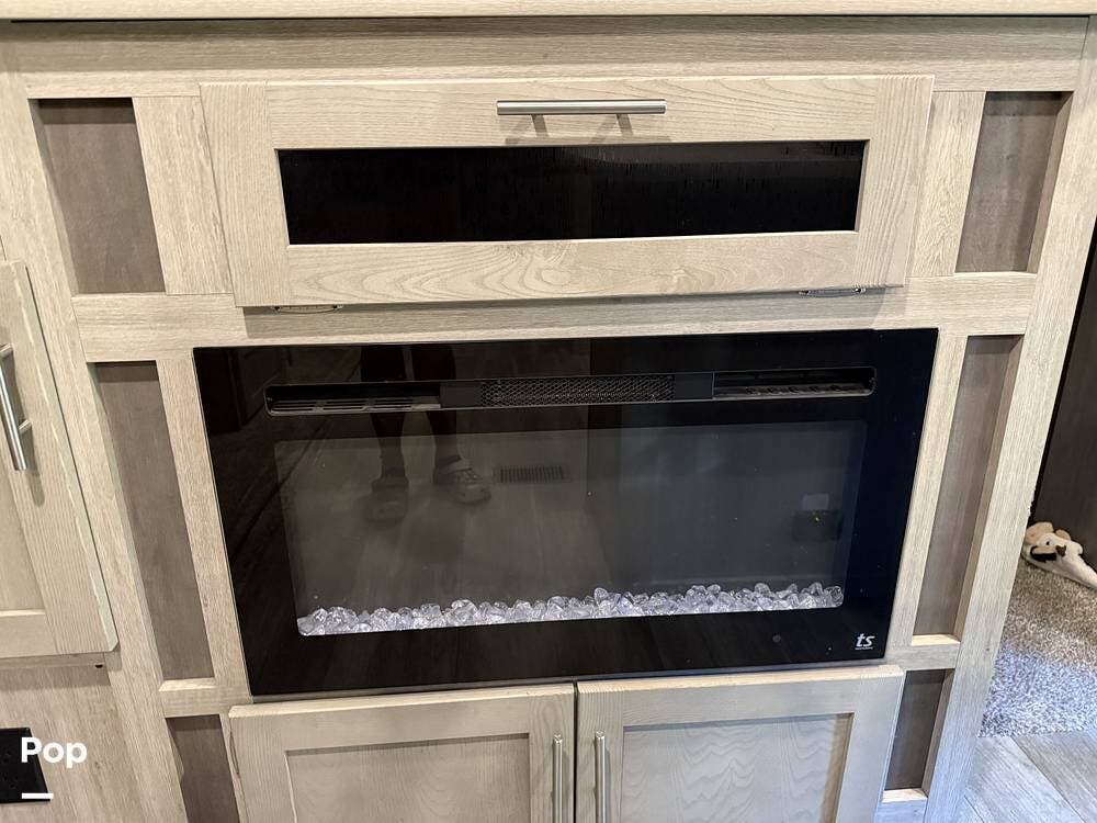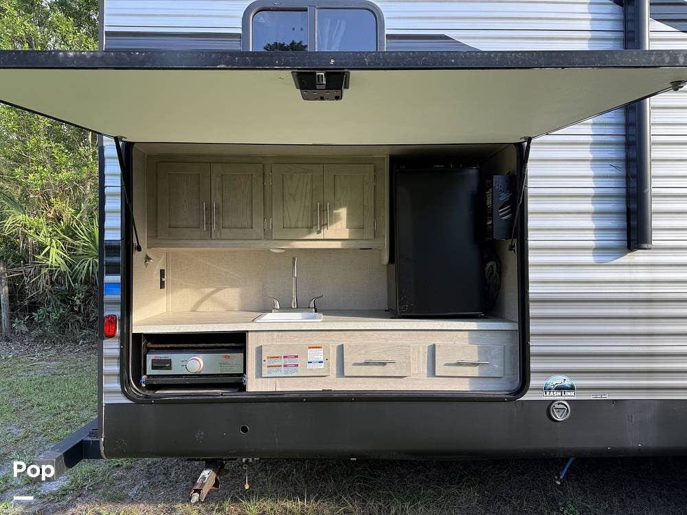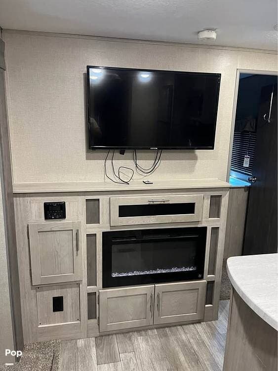 The outdoor kitchen is perfect for tailgating or outdoor entertaining. Inside, there is an electric fireplace and washer/dryer hookups.