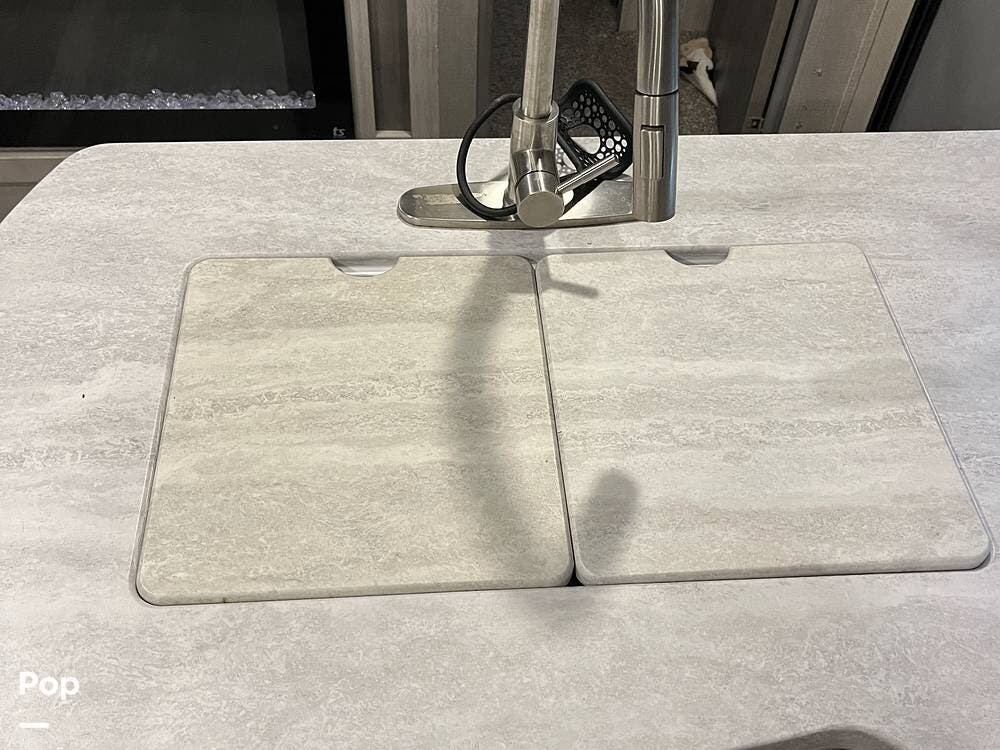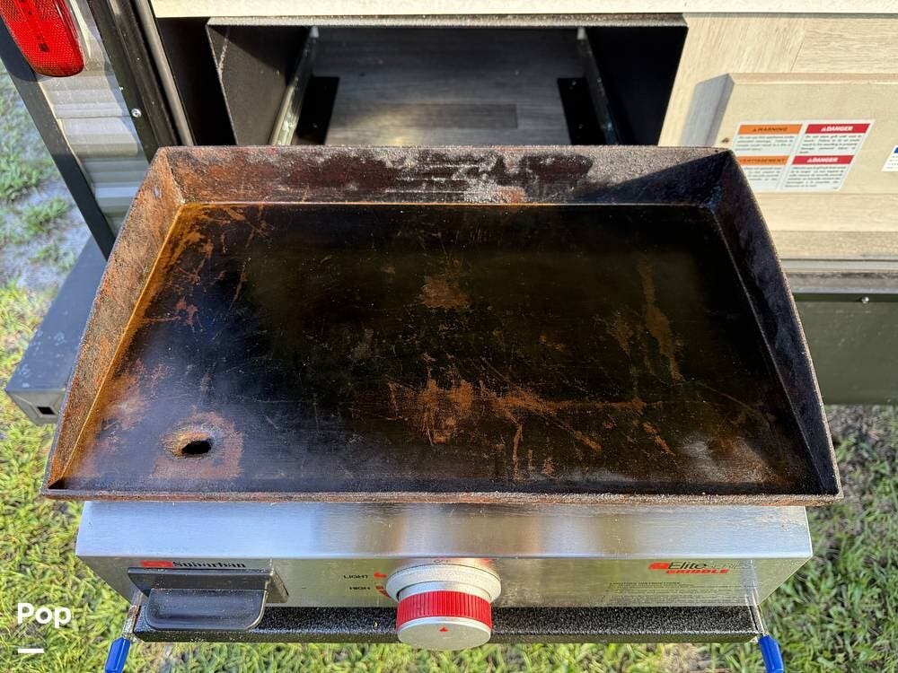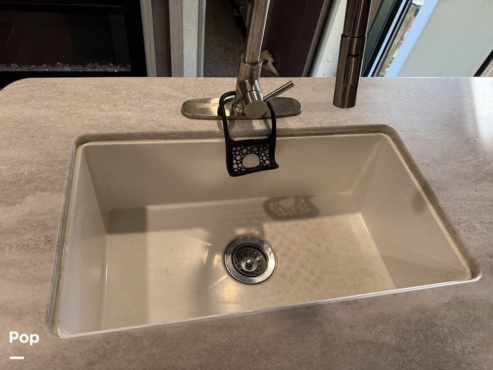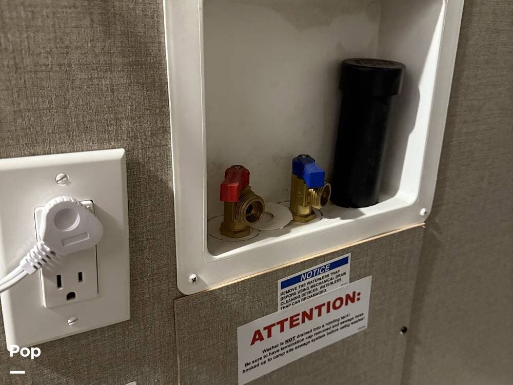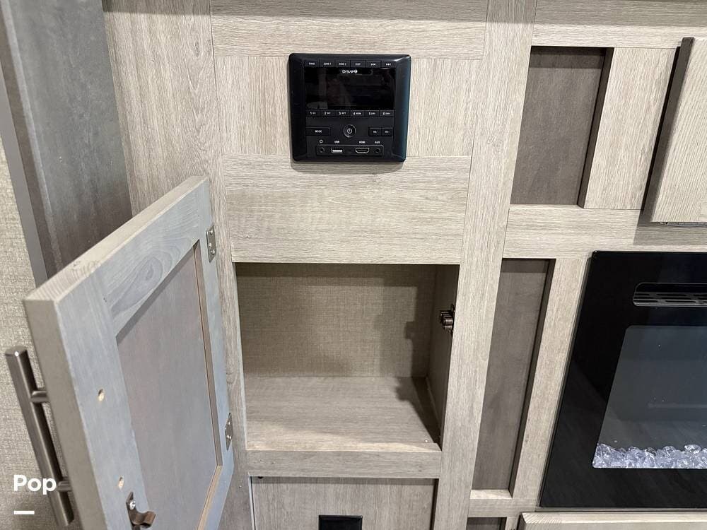 The outdoor kitchen is perfect for tailgating or outdoor entertaining. Inside, there is an electric fireplace and washer/dryer hookups.