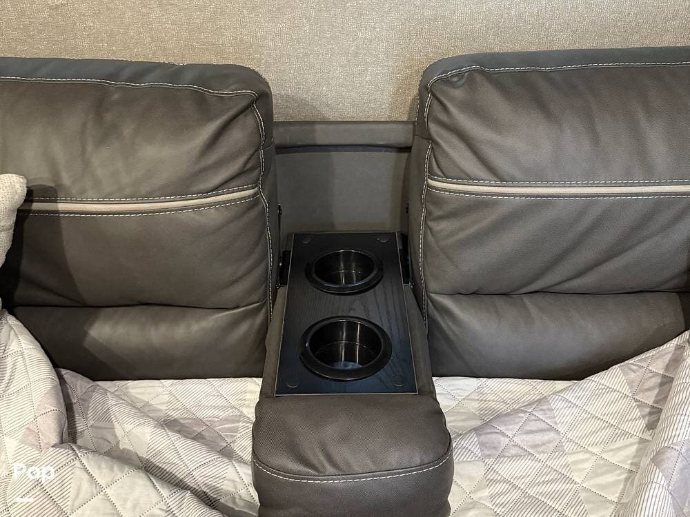The Power Awning features LED lighting and exterior speakers. And the owners really appreciate the Modern Farmhouse interior decor.
