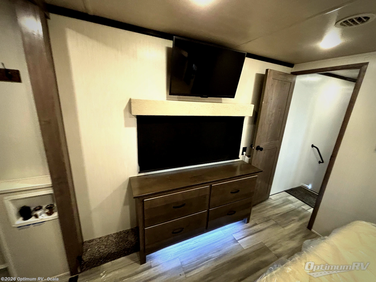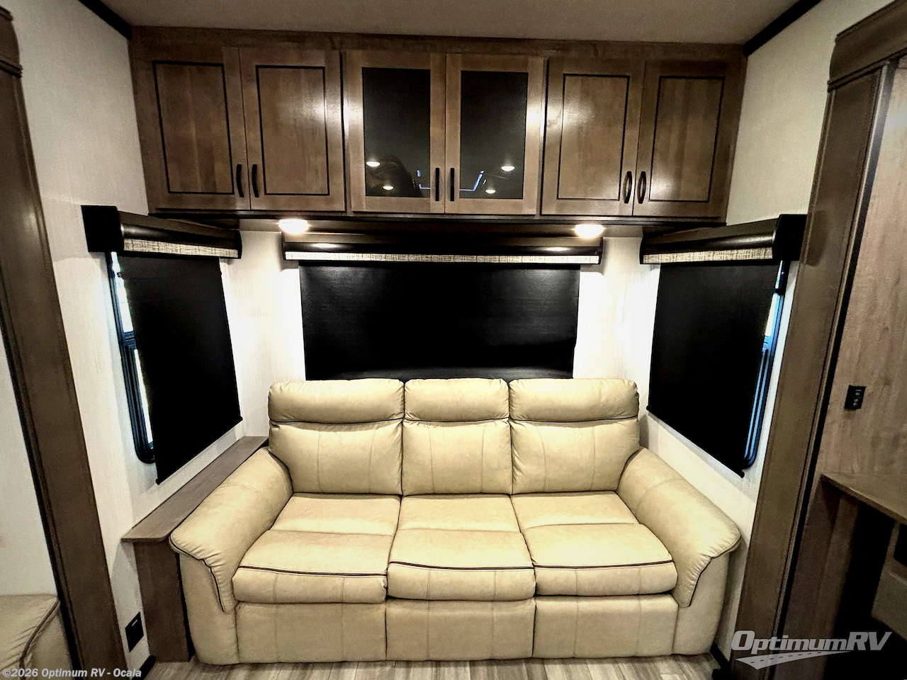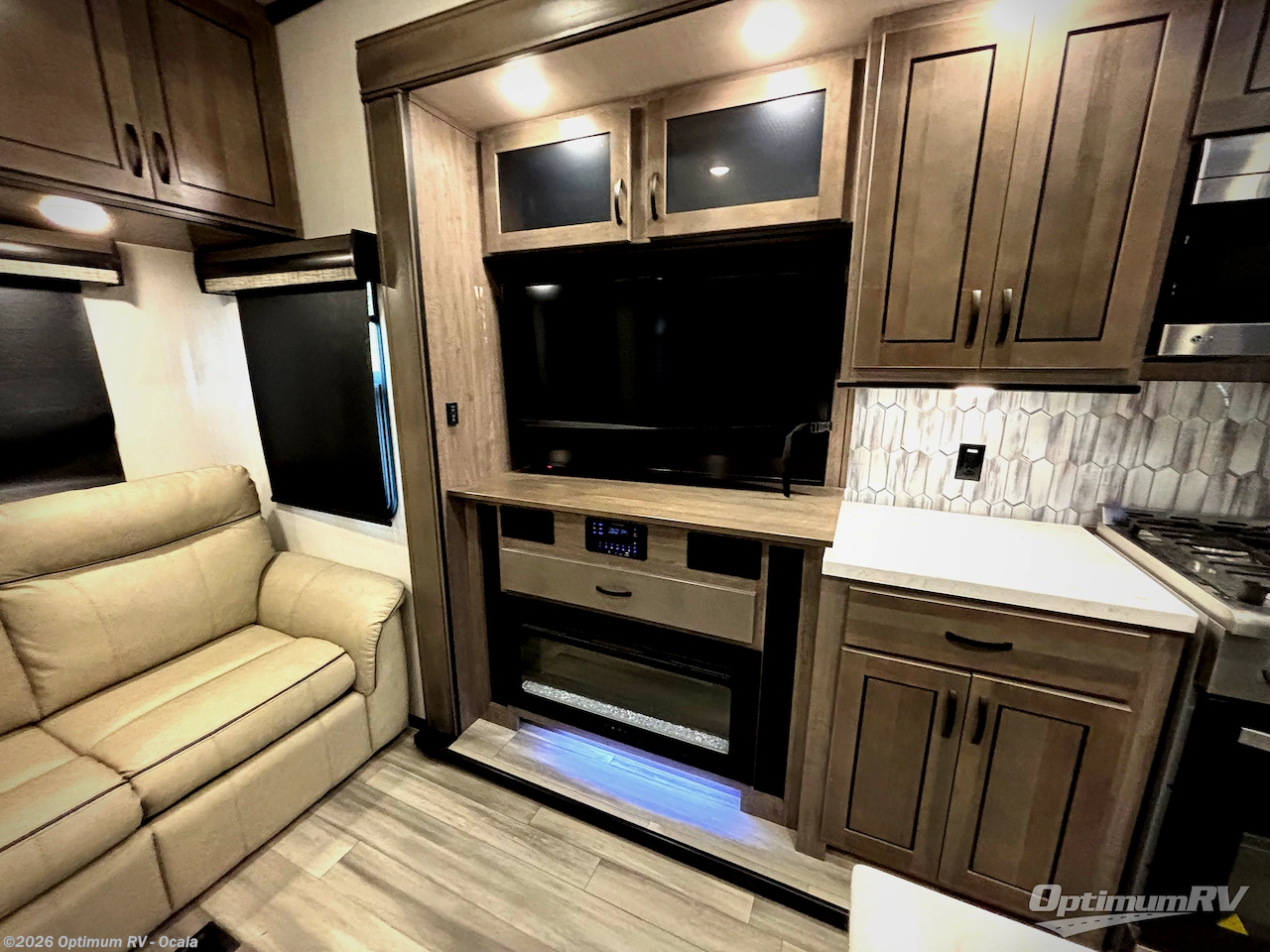 Enjoy a relaxing camping trip with this fifth wheel! The rear living area has a hide-a-bed sofa and power theater seating with USB charging across from an entertainment center with a fireplace and 50" flat screen TV to watch your favorite movies. The chef can prepare their best meals with the kitchen island and if you want an easier clean up time then add the optional dishwasher to the island. You could even add the optional pull-out kitchen for breakfast outdoors. The full bathroom has a 48" x 30" shower with a seat to wash the sand out of your hair after a fun day at the beach and a dual sink vanity for two to get ready at once. The king bed slide in the front private bedroom welcomes you to enjoy a good night's rest and the front wardrobe has storage shelves and an area prepped to add an optional washer and dryer for you to have clean clothes throughout your entire trip!