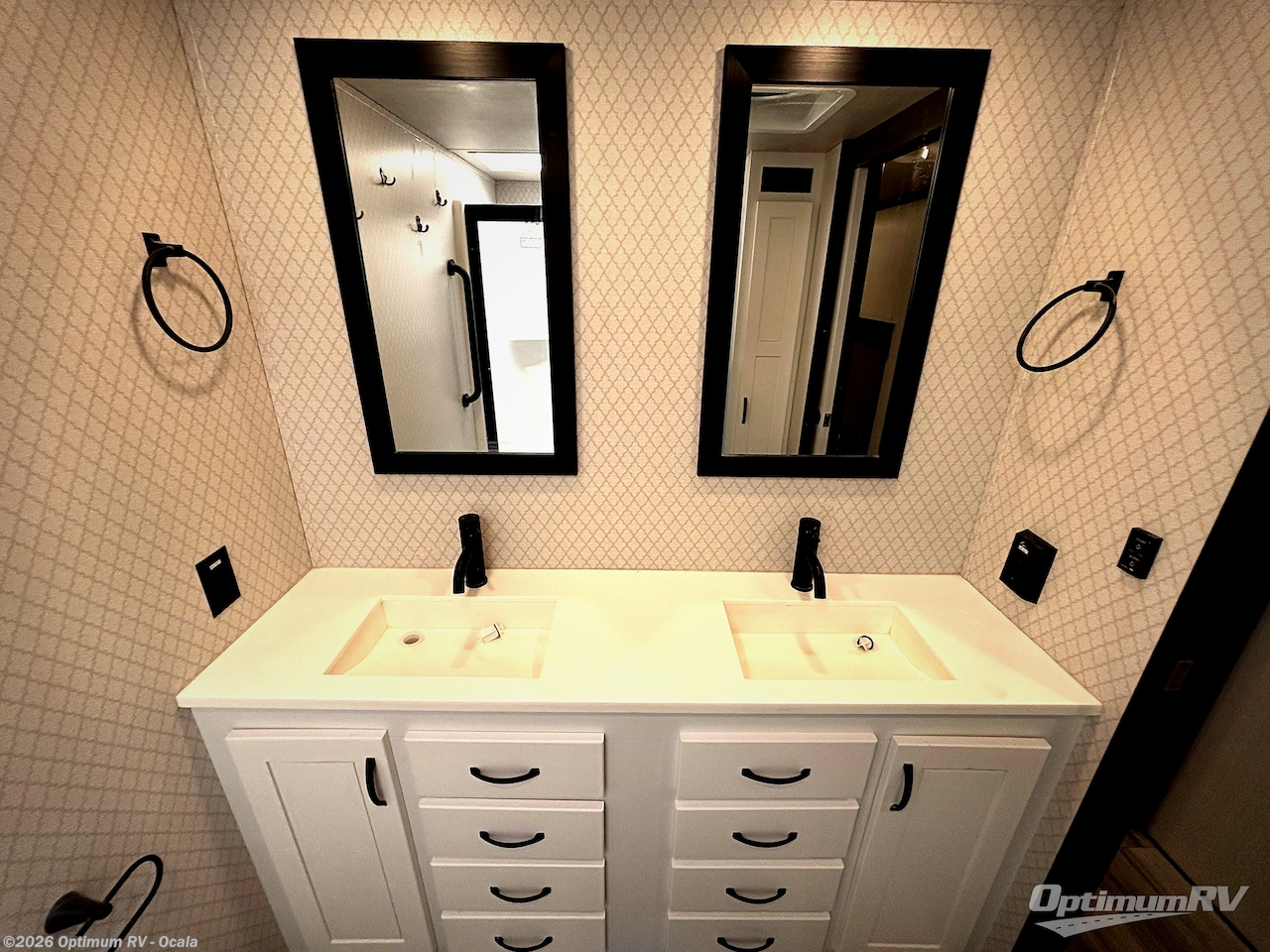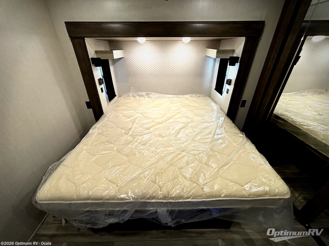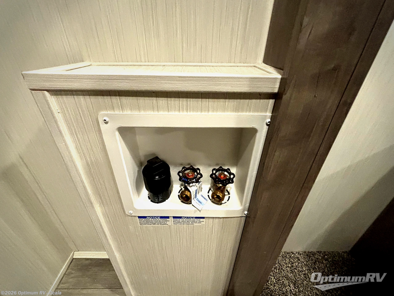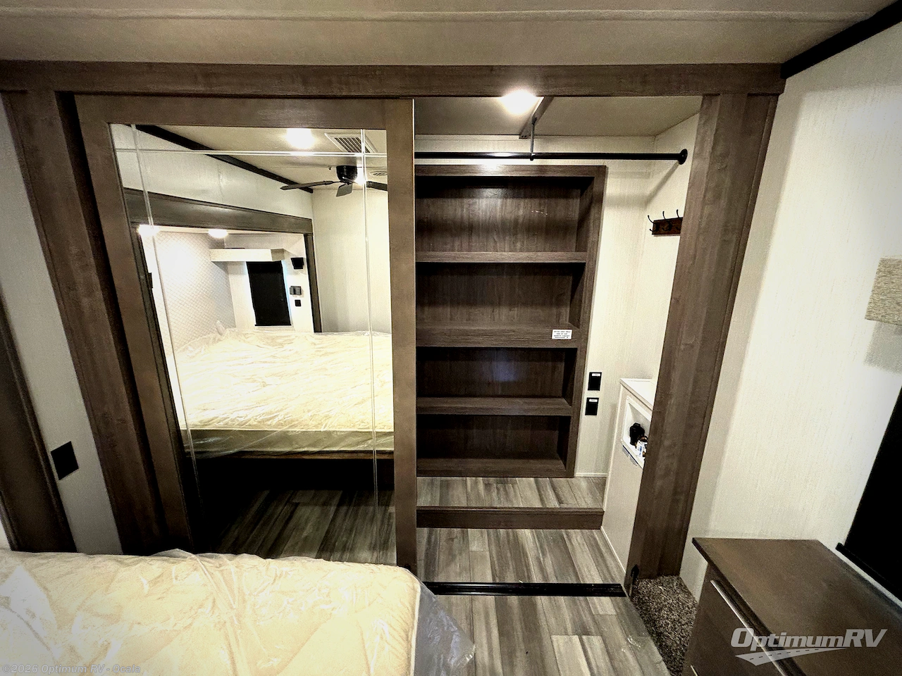 Enjoy a relaxing camping trip with this fifth wheel! The rear living area has a hide-a-bed sofa and power theater seating with USB charging across from an entertainment center with a fireplace and 50" flat screen TV to watch your favorite movies. The chef can prepare their best meals with the kitchen island and if you want an easier clean up time then add the optional dishwasher to the island. You could even add the optional pull-out kitchen for breakfast outdoors. The full bathroom has a 48" x 30" shower with a seat to wash the sand out of your hair after a fun day at the beach and a dual sink vanity for two to get ready at once. The king bed slide in the front private bedroom welcomes you to enjoy a good night's rest and the front wardrobe has storage shelves and an area prepped to add an optional washer and dryer for you to have clean clothes throughout your entire trip!