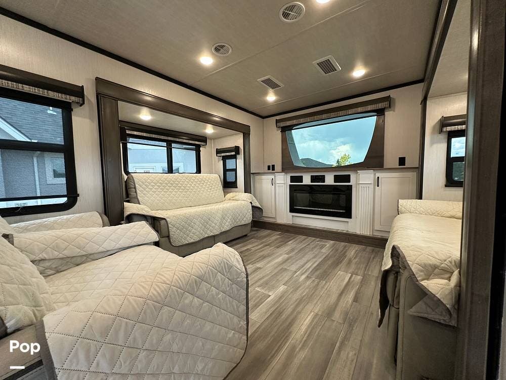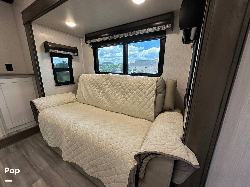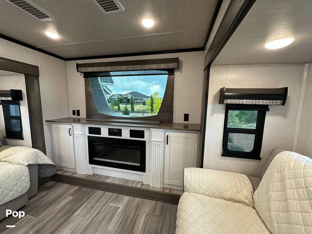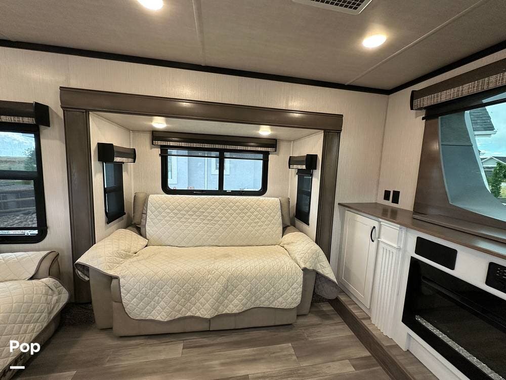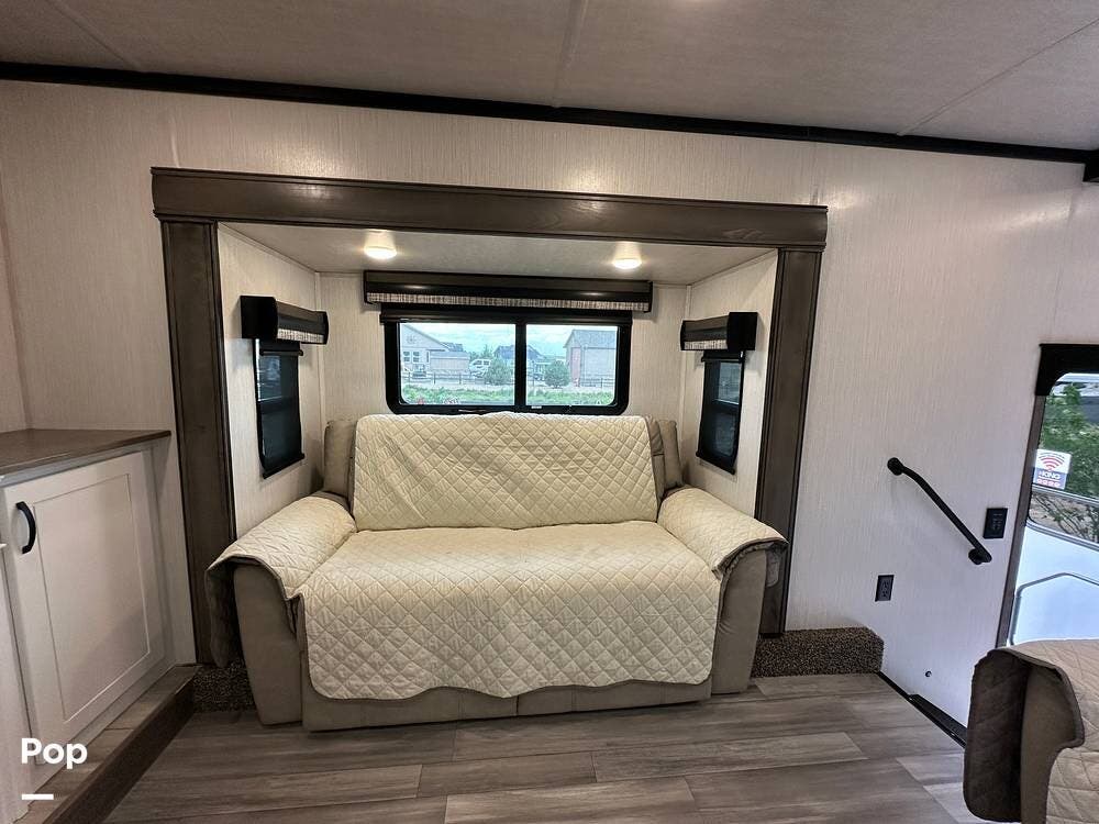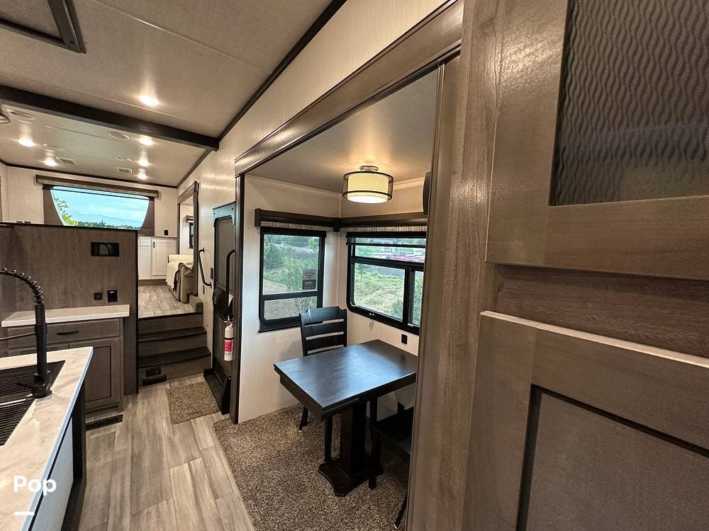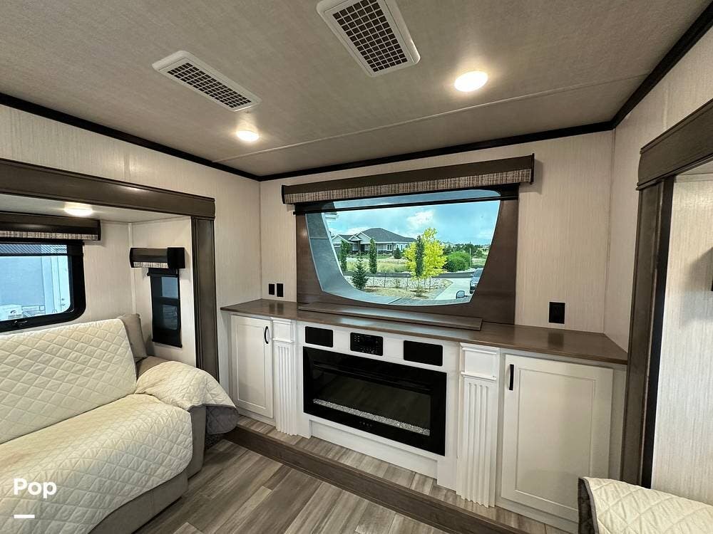 You'll love the comfort and numerous features of this 2022 Cedar Creek 371FL front living 5th wheel, which features 1.5 bathrooms, a king bed, and residential appliances in the kitchen. This RV is located in Berthoud, CO, and is in great condition.