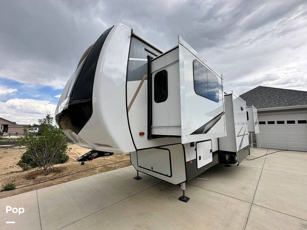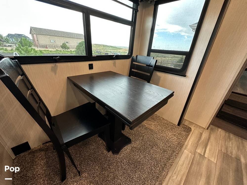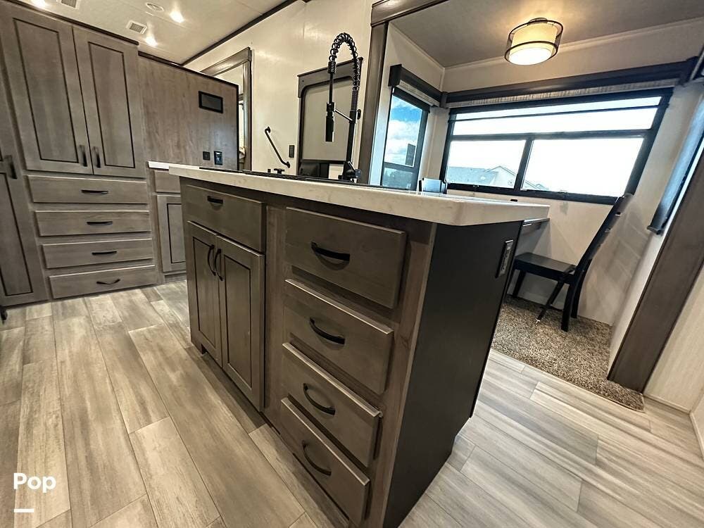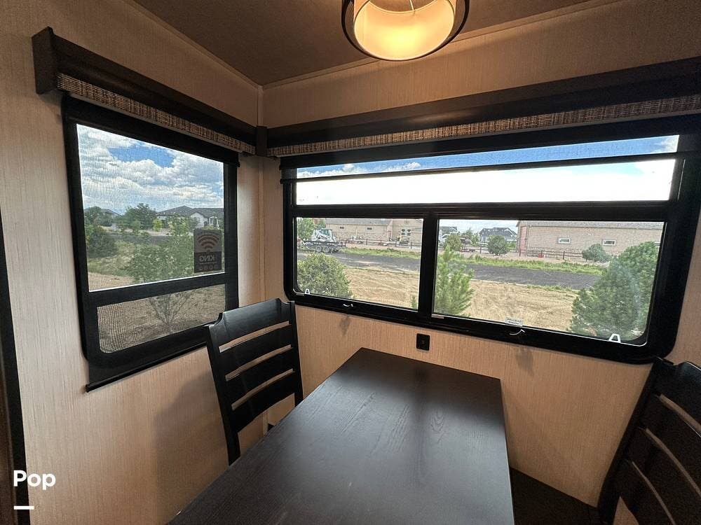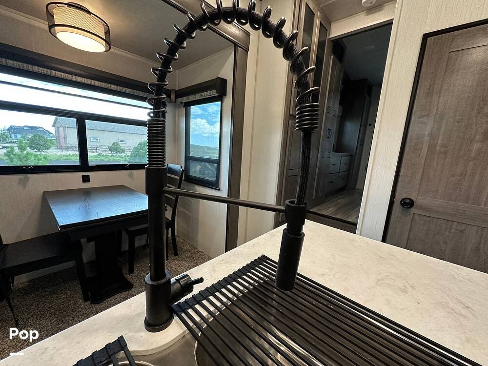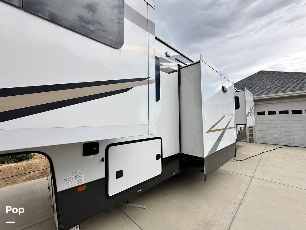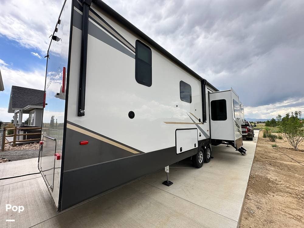 You'll love the comfort and numerous features of this 2022 Cedar Creek 371FL front living 5th wheel, which features 1.5 bathrooms, a king bed, and residential appliances in the kitchen. This RV is located in Berthoud, CO, and is in great condition.