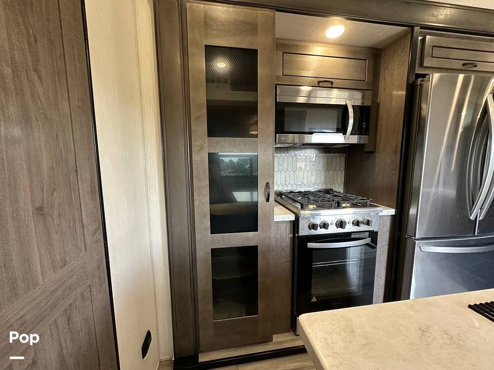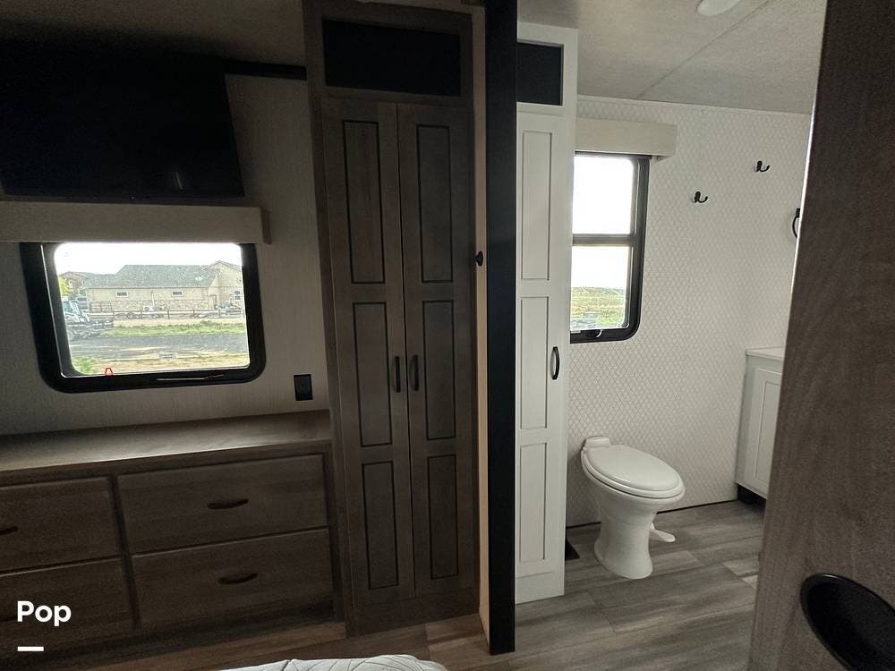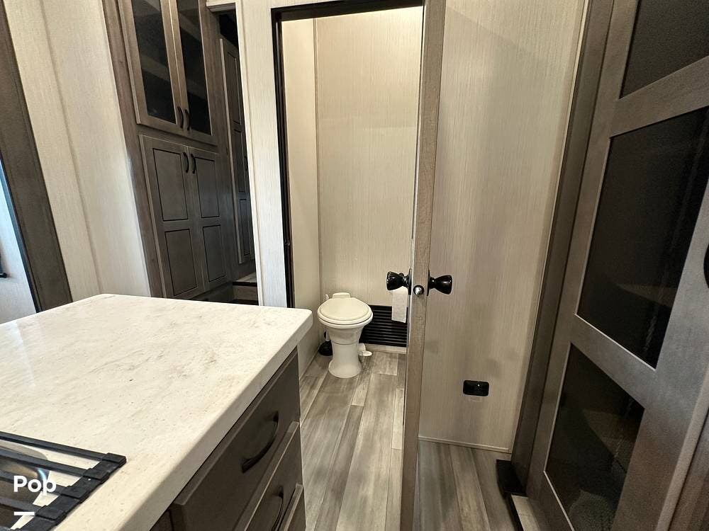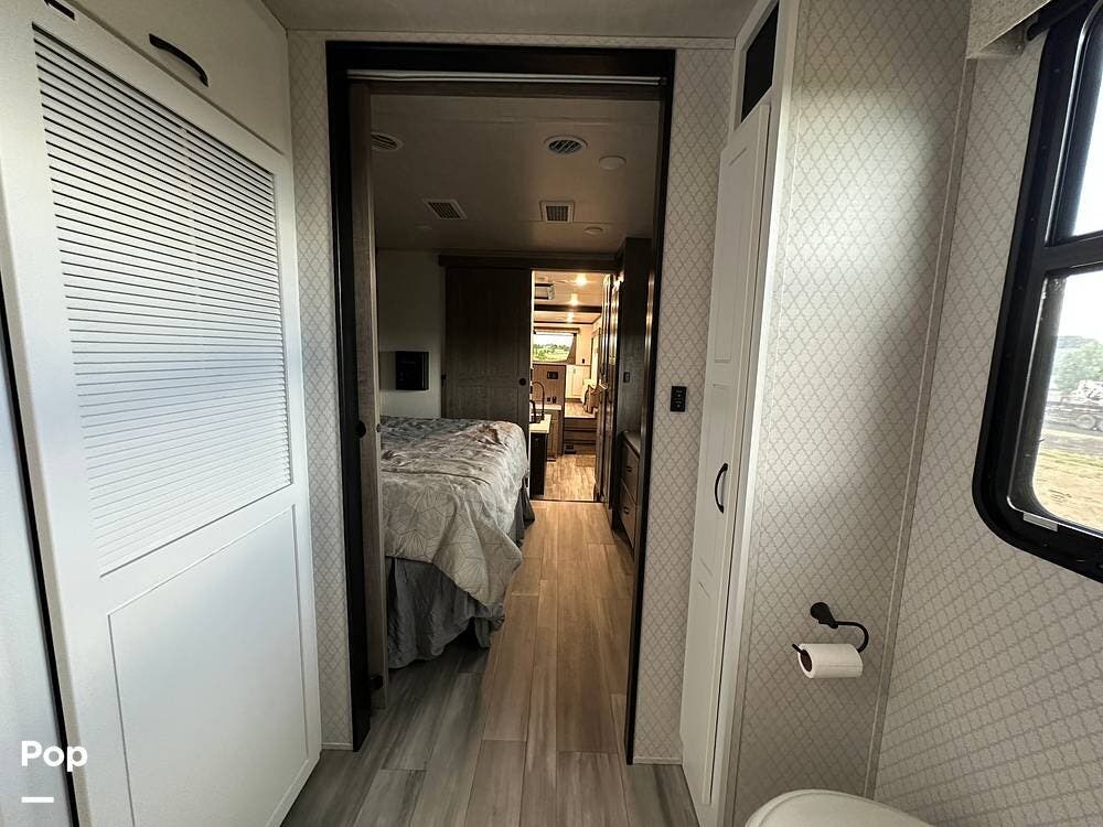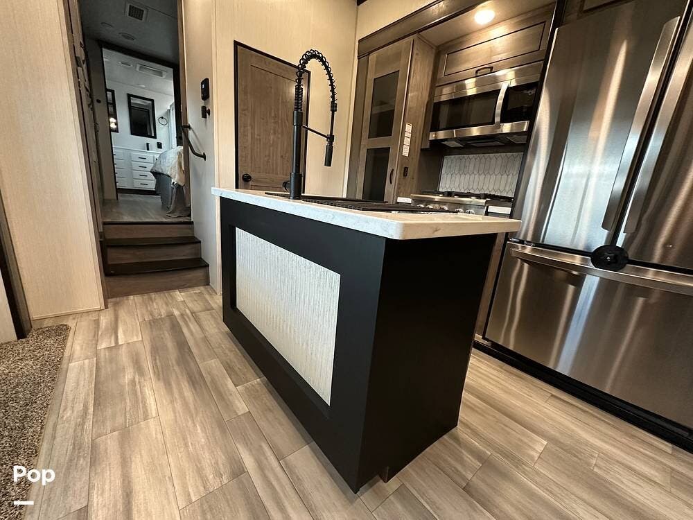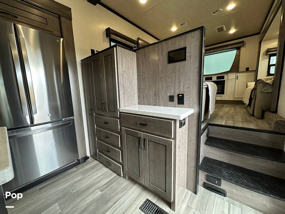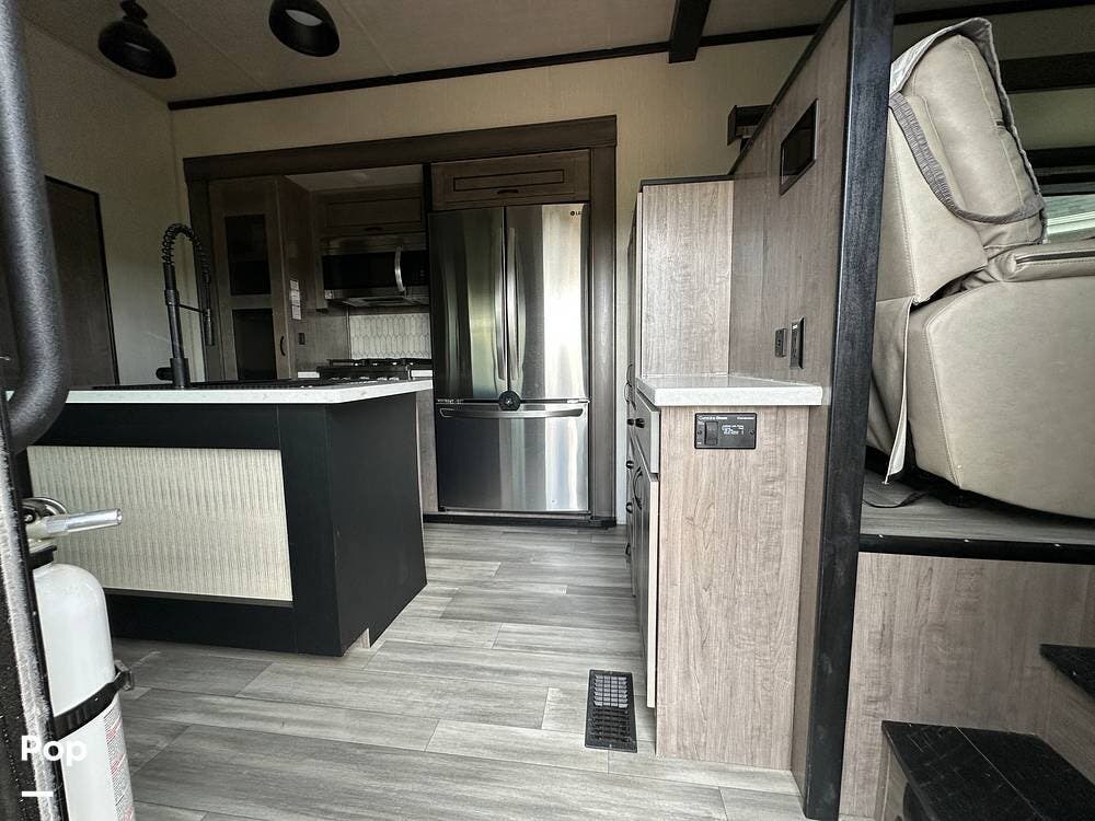 You'll love the comfort and numerous features of this 2022 Cedar Creek 371FL front living 5th wheel, which features 1.5 bathrooms, a king bed, and residential appliances in the kitchen. This RV is located in Berthoud, CO, and is in great condition.
