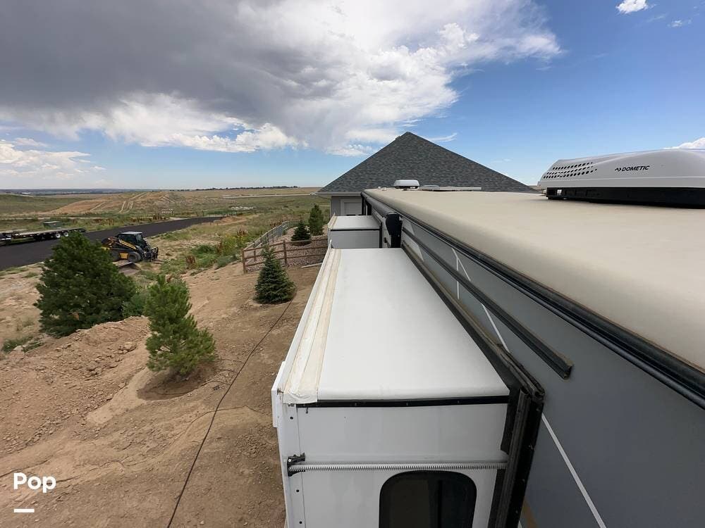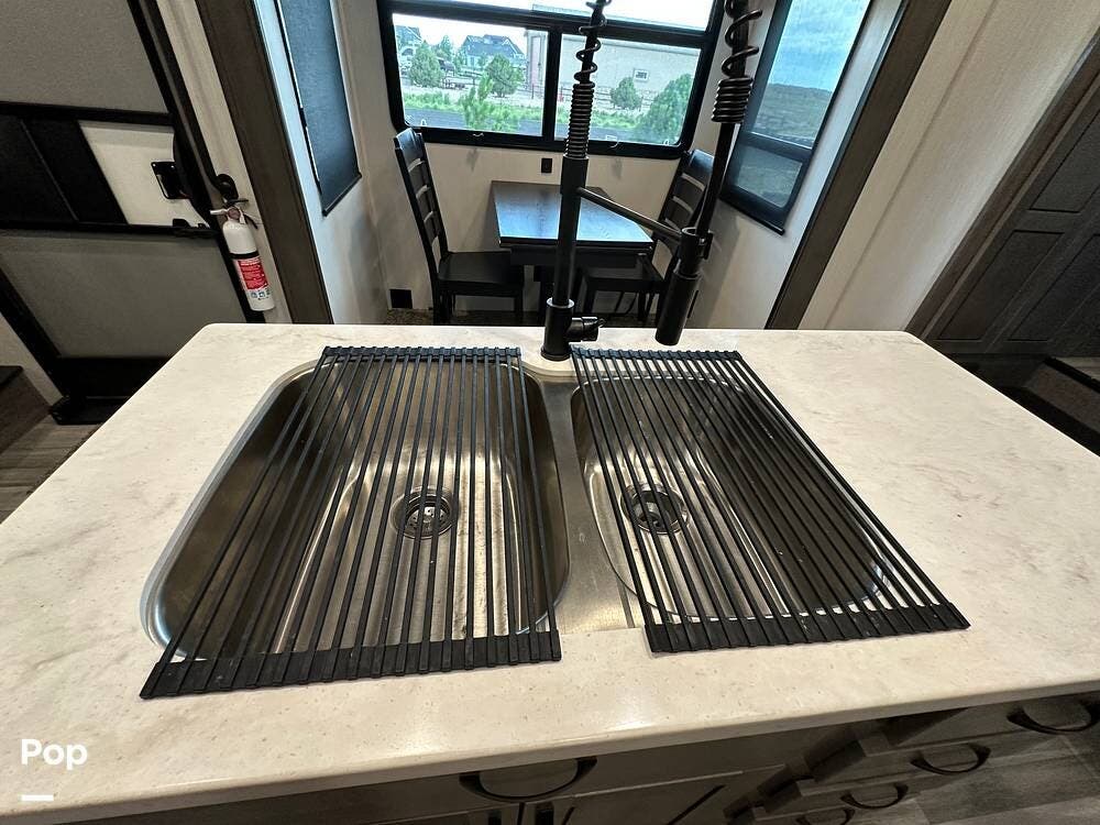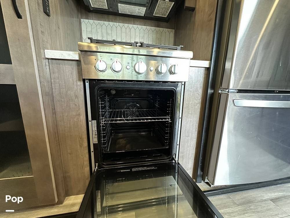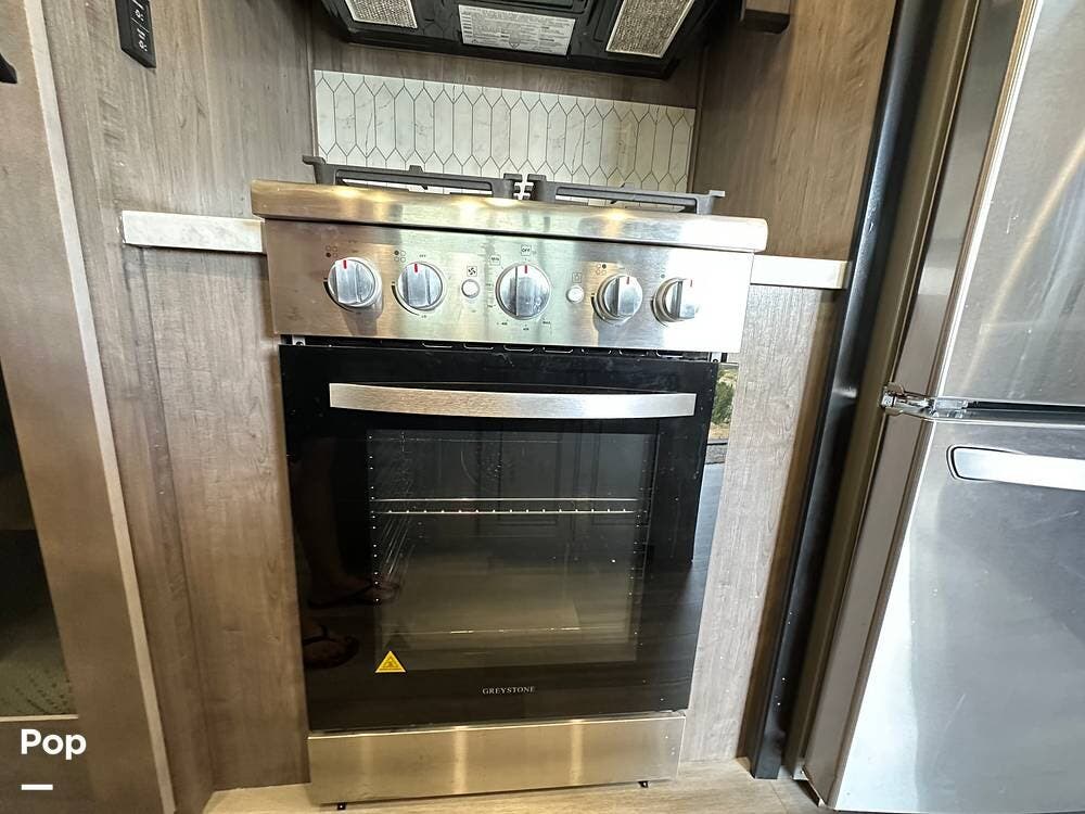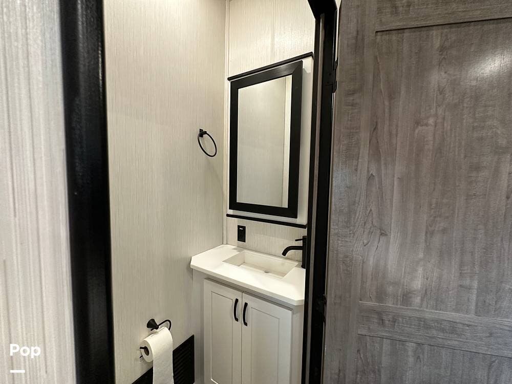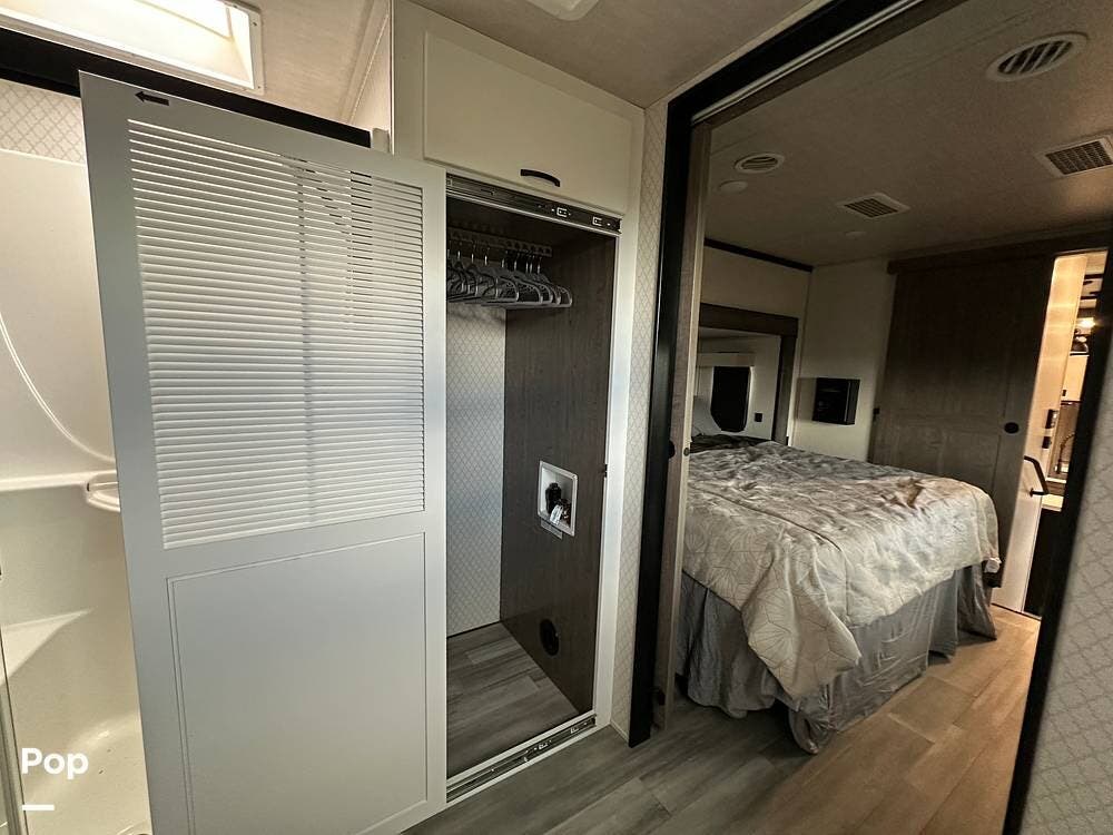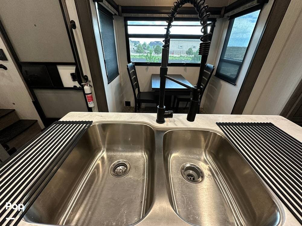 You'll love the comfort and numerous features of this 2022 Cedar Creek 371FL front living 5th wheel, which features 1.5 bathrooms, a king bed, and residential appliances in the kitchen. This RV is located in Berthoud, CO, and is in great condition.