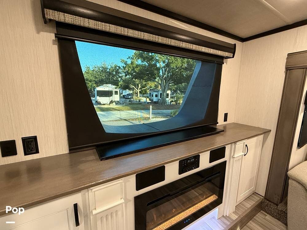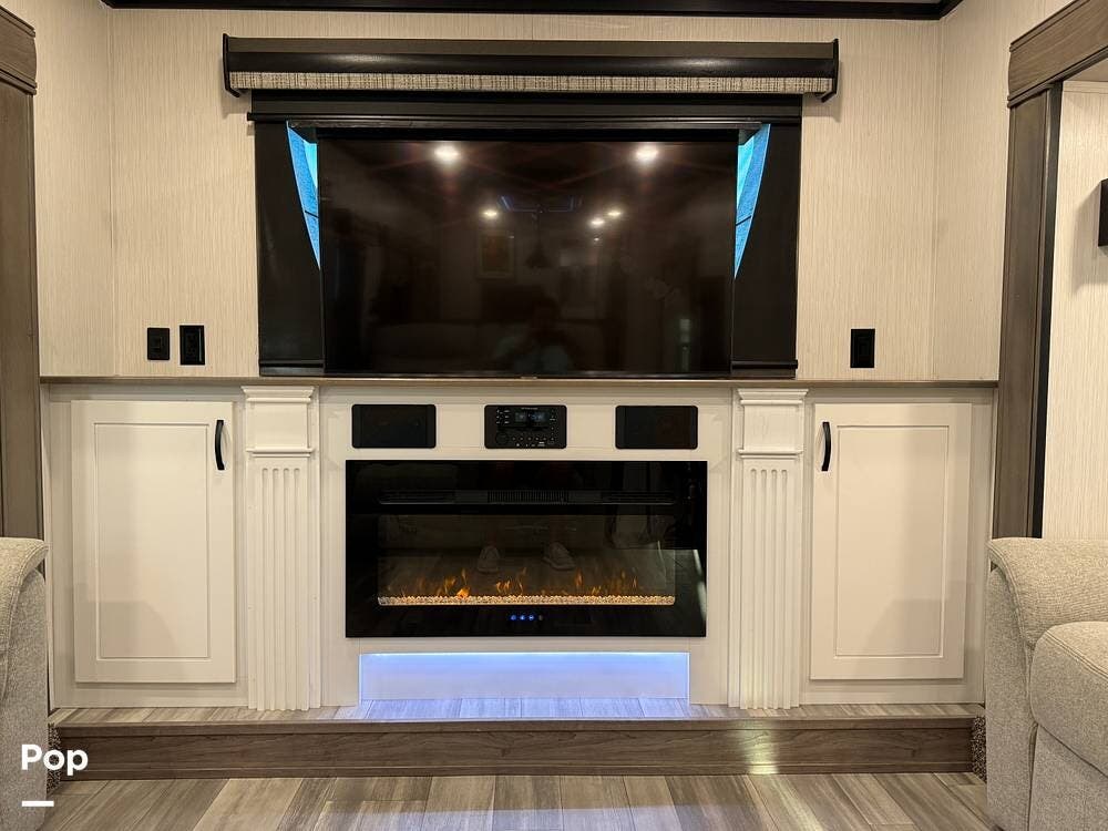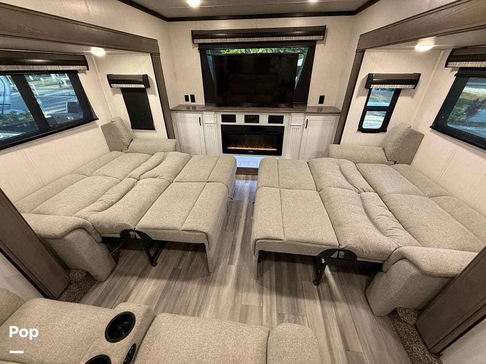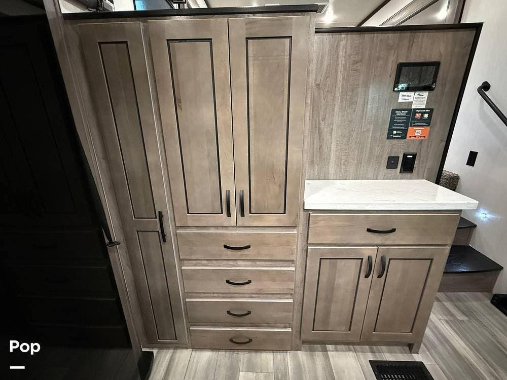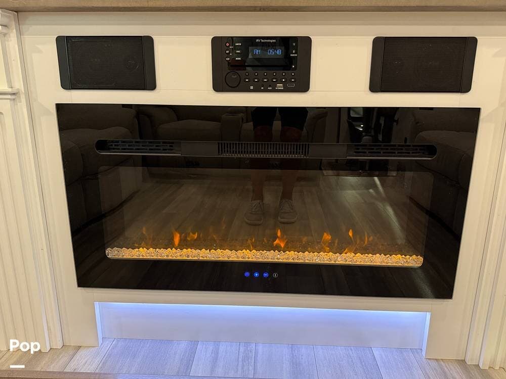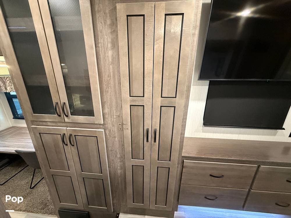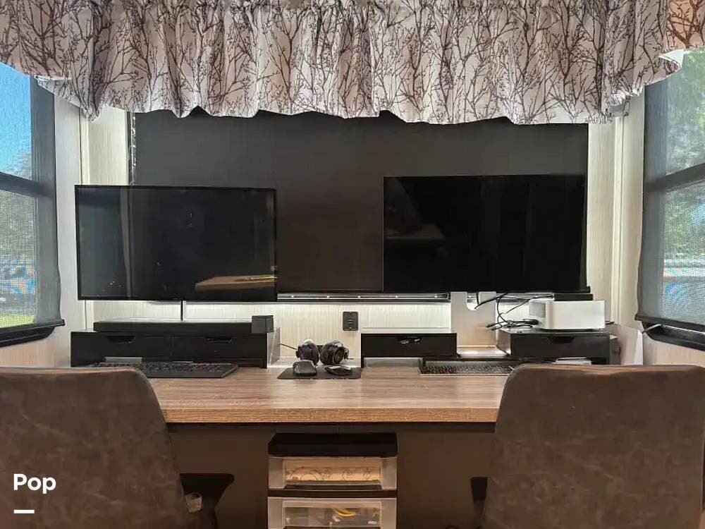 Step inside to a beautifully finished interior featuring an elevated front living room designed for relaxation and entertainment. This inviting space includes opposing tri-fold sleeper sofas, dual theater seating, and an entertainment center complete with a CD/DVD player, an electric fireplace, and a large Smart TV that rises smoothly from the cabinet via power lift. Just steps down is the central galley and dining area, where you'll find a spacious workstation (easily convertible back to the original dinette), residential-style appliances, a kitchen island with counter extension & double sink, a full-size refrigerator/freezer, microwave, four-burner stove, oven, and an oversized pantry with pull-out drawers & shelves.