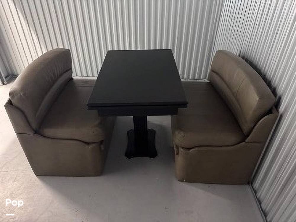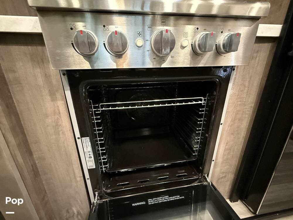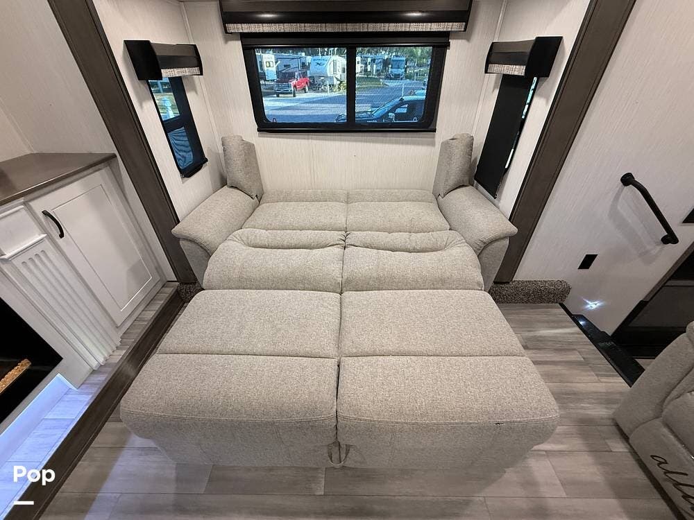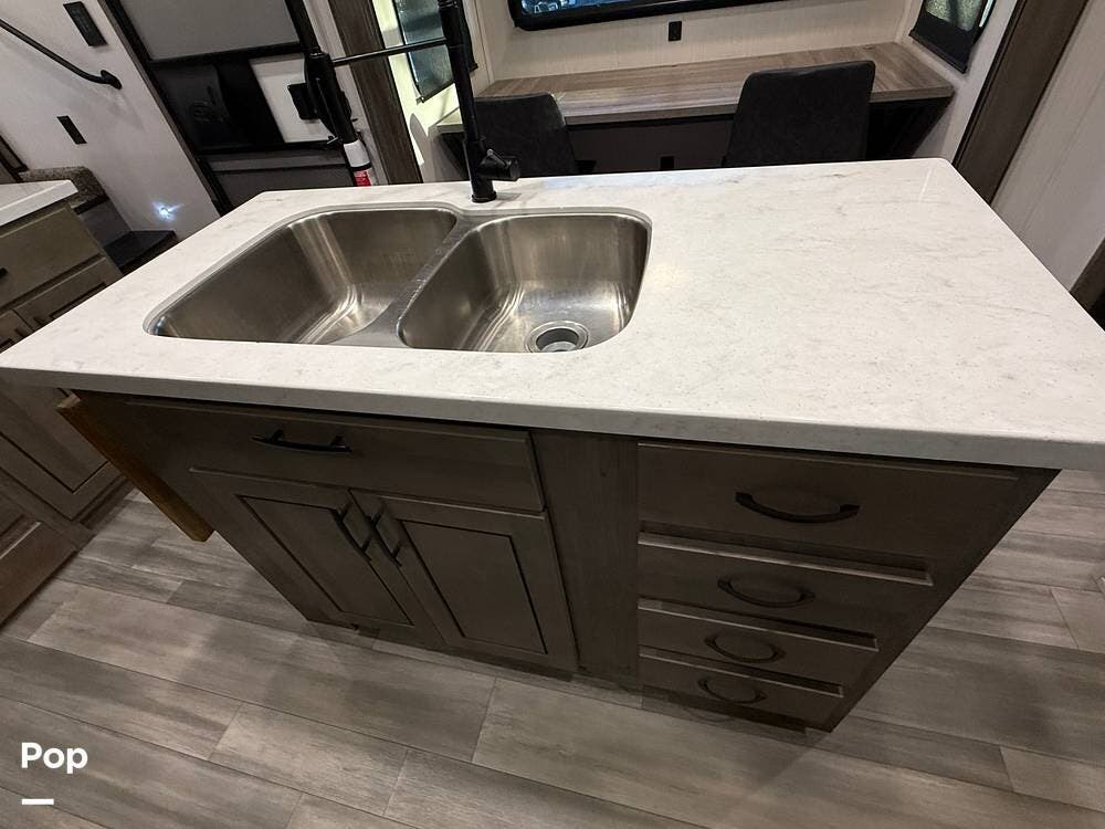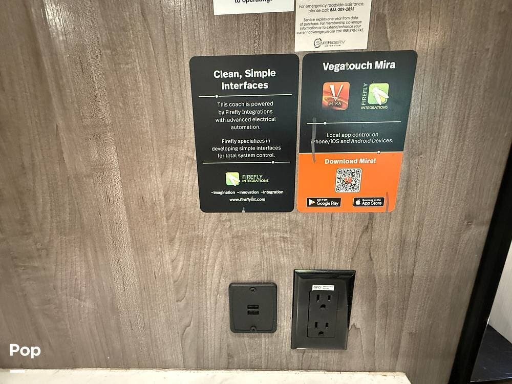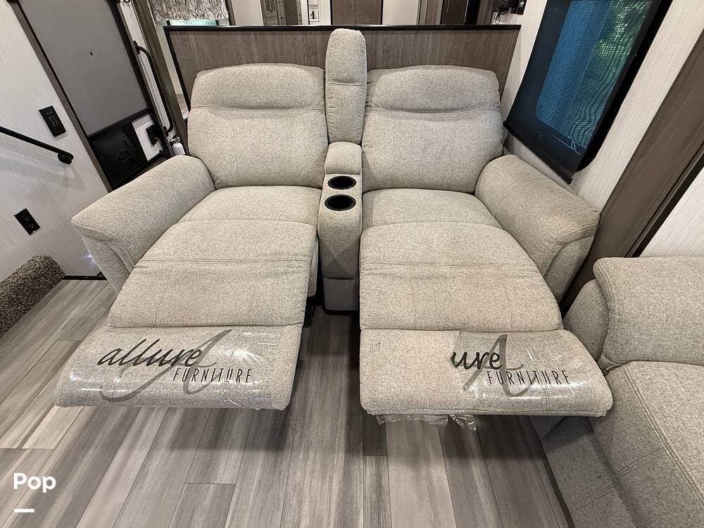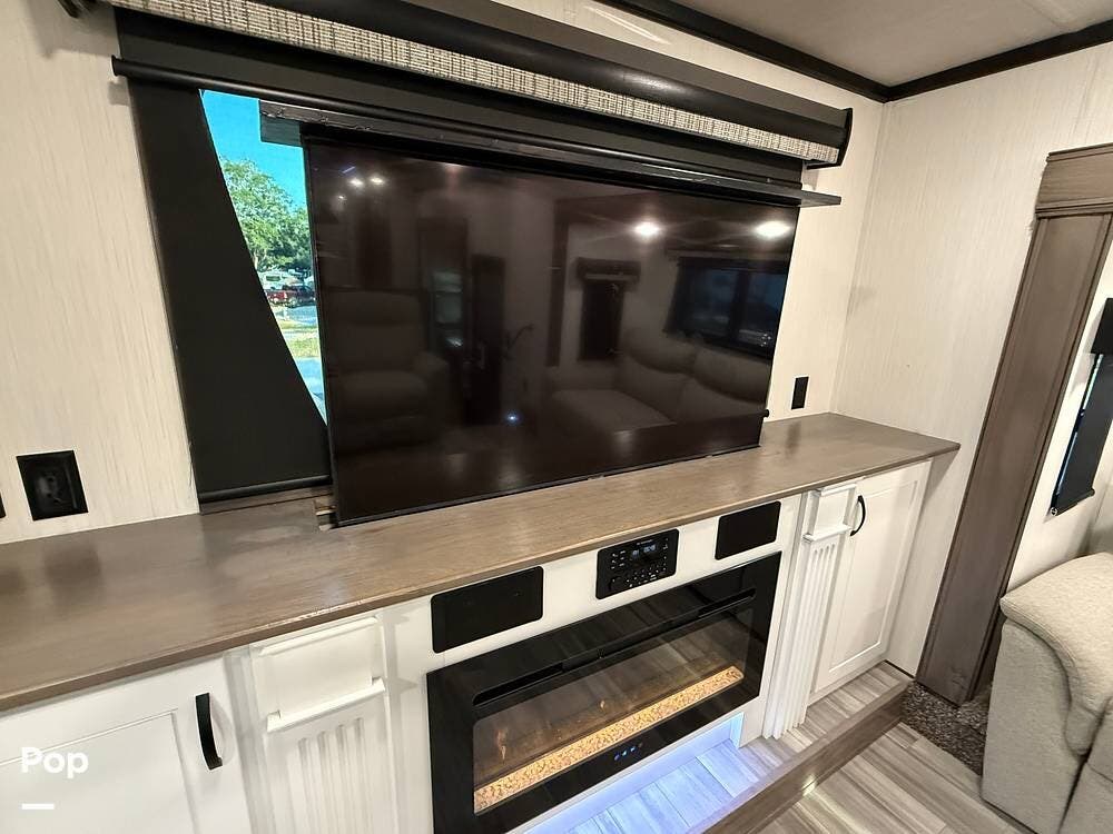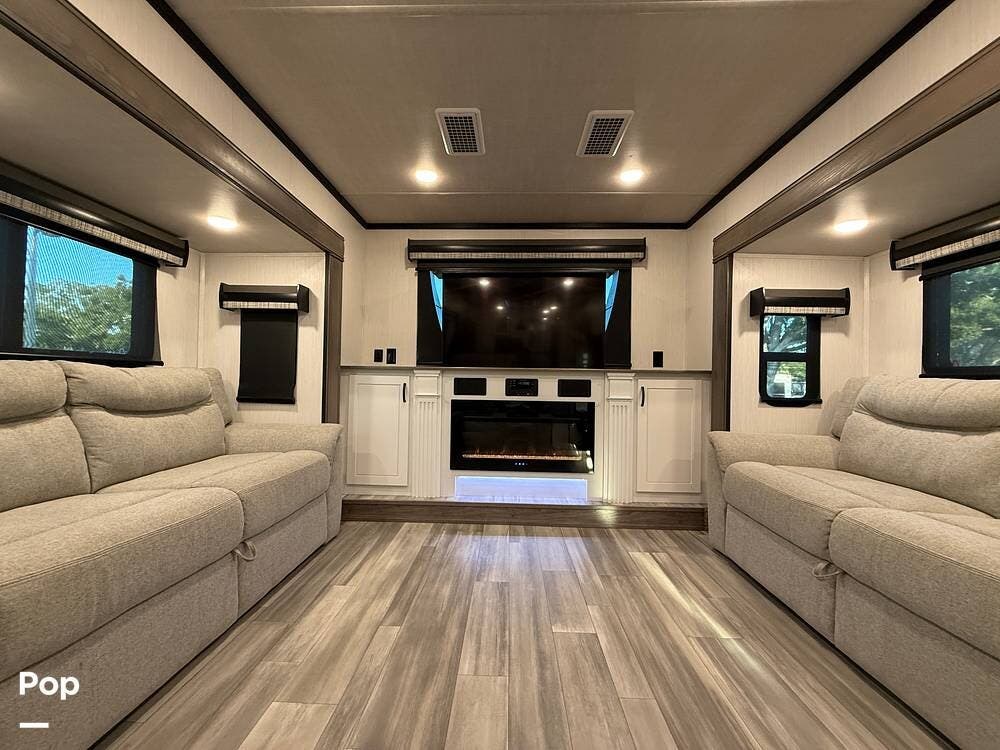 Step inside to a beautifully finished interior featuring an elevated front living room designed for relaxation and entertainment. This inviting space includes opposing tri-fold sleeper sofas, dual theater seating, and an entertainment center complete with a CD/DVD player, an electric fireplace, and a large Smart TV that rises smoothly from the cabinet via power lift. Just steps down is the central galley and dining area, where you'll find a spacious workstation (easily convertible back to the original dinette), residential-style appliances, a kitchen island with counter extension & double sink, a full-size refrigerator/freezer, microwave, four-burner stove, oven, and an oversized pantry with pull-out drawers & shelves.