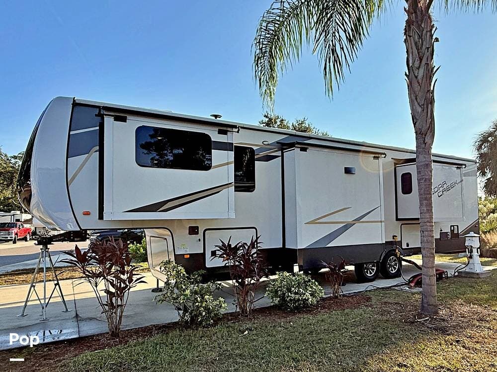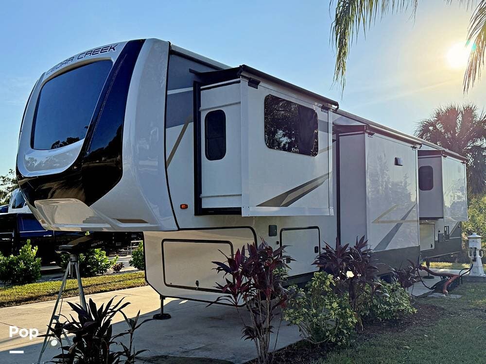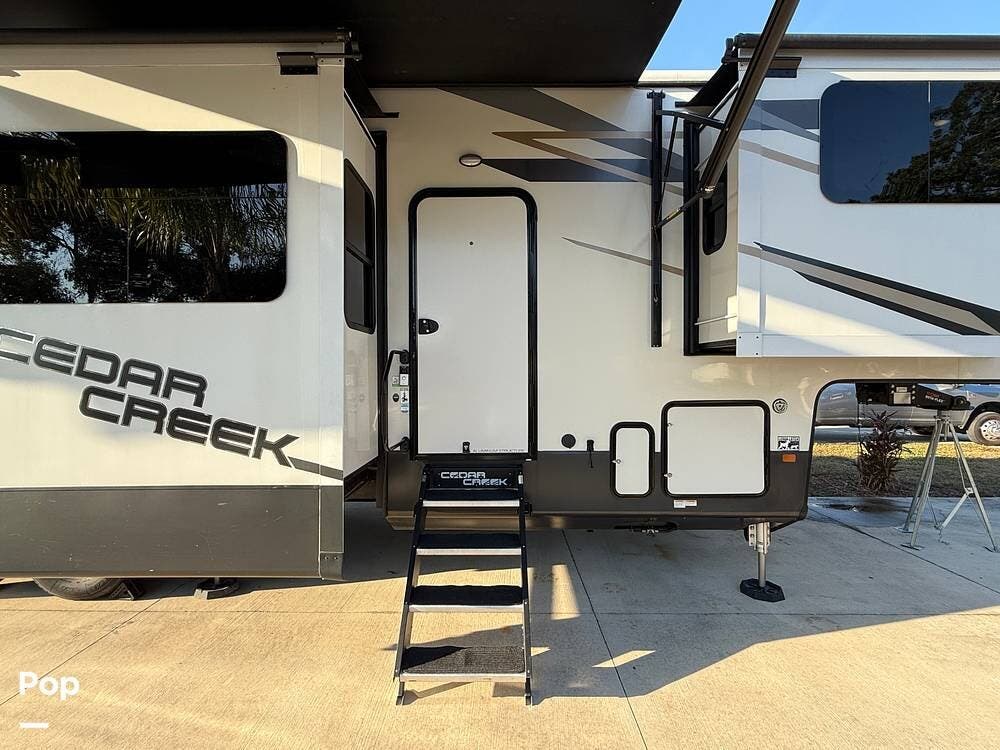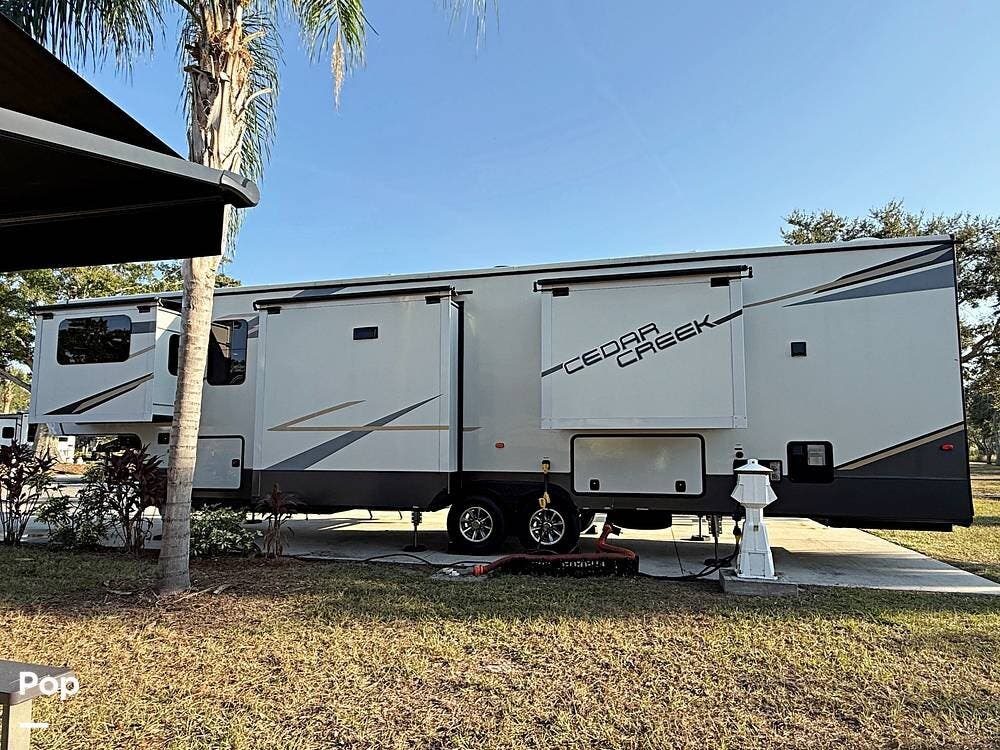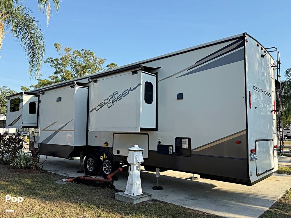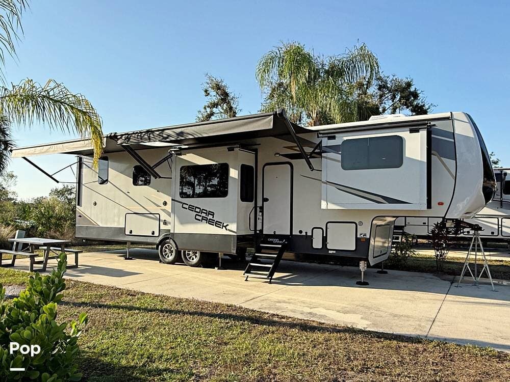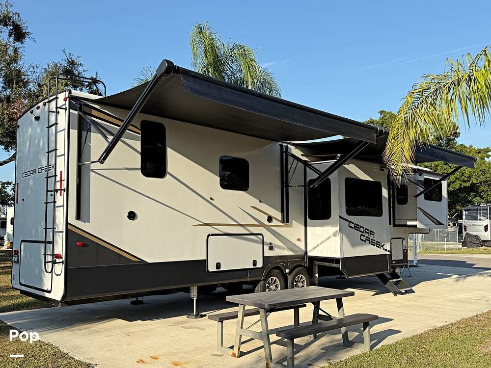Located in Clearwater (Tampa Bay), Florida, this lightly used Cedar Creek 371FL by Forest River is an impressive, nearly 42-foot fifth-wheel trailer offering exceptional comfort, luxury, and capability.