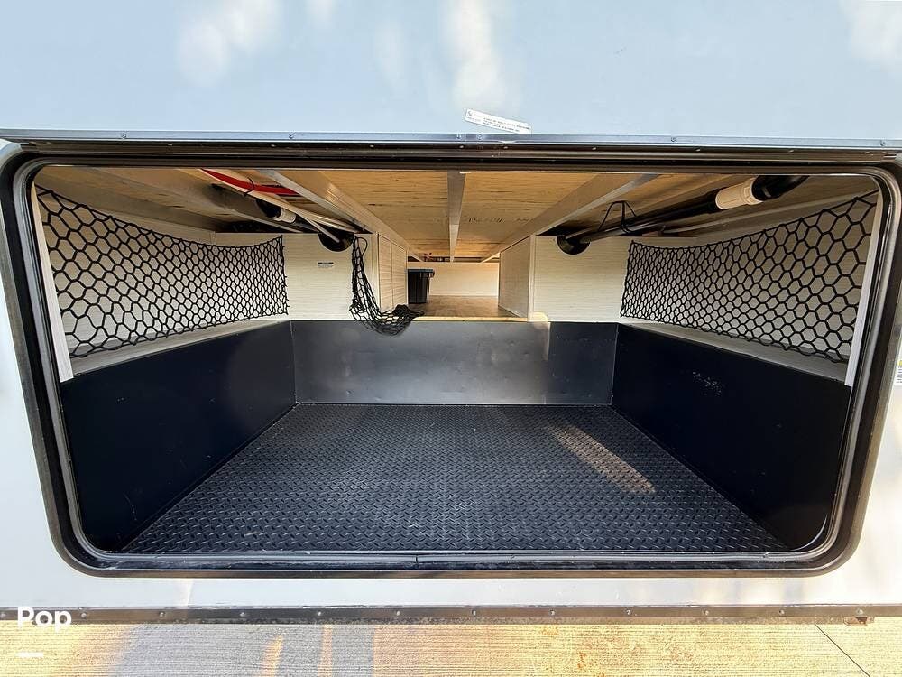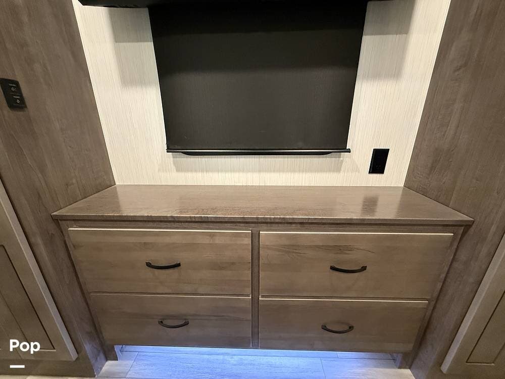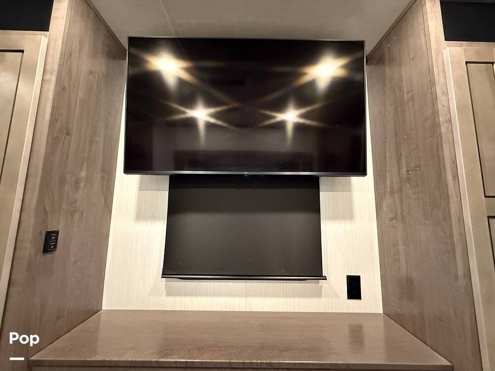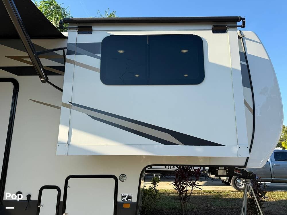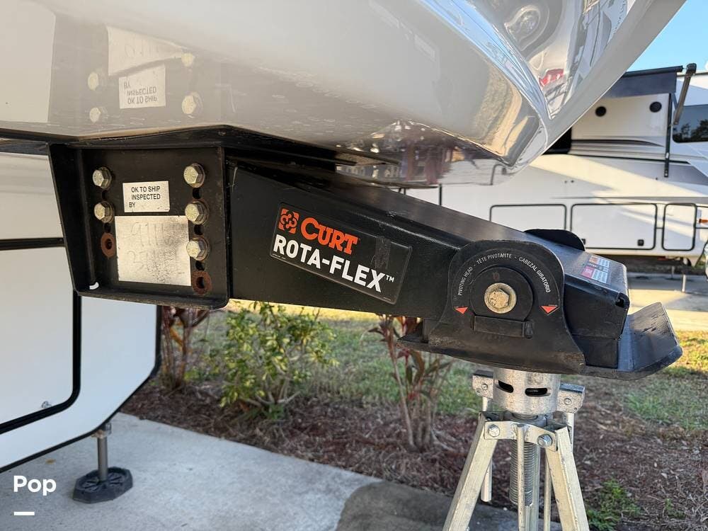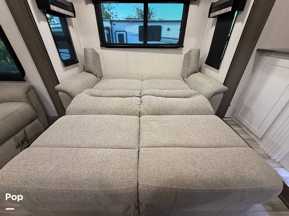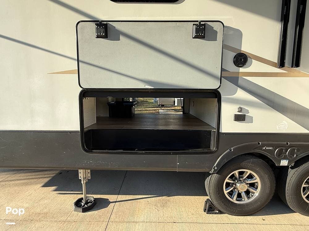 Outside, the 371FL offers ample well-designed storage, including a front heated compartment, a spacious pass-through, and a large rear trunk. Towing is made easier with the Curt Rota-Flex pin box, and once you arrive, setup is simple with the automatic six-point hydraulic leveling system. Additional exterior highlights include two 18-foot power awnings with LED lighting, a TST tire-pressure monitoring system, and a rearview camera for added safety and peace of mind.