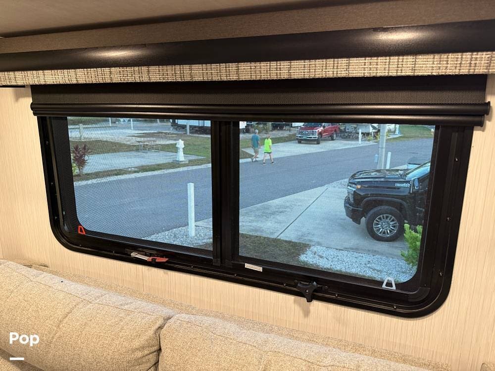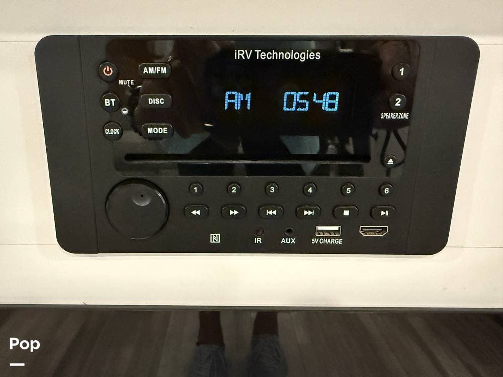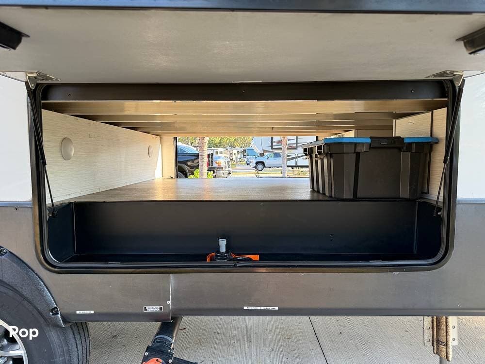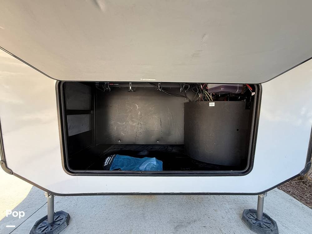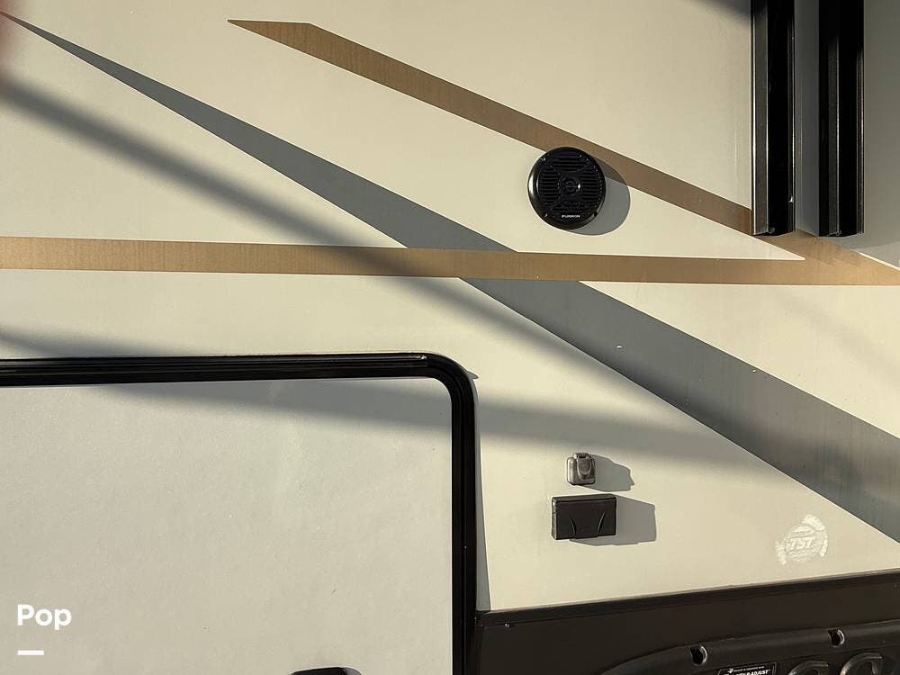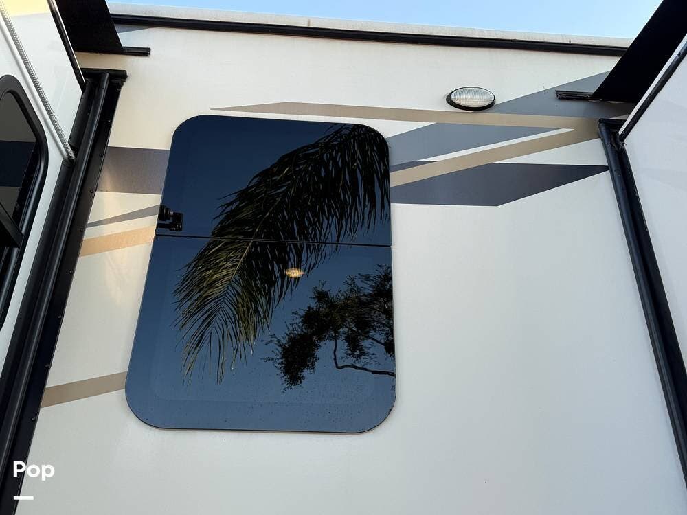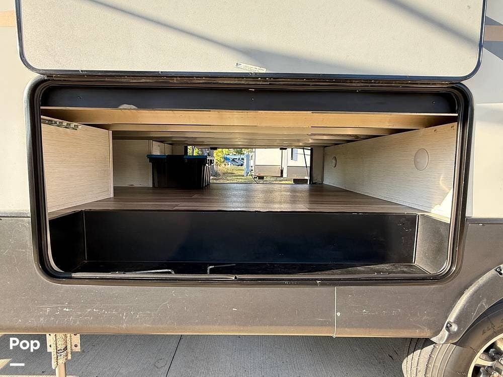 Outside, the 371FL offers ample well-designed storage, including a front heated compartment, a spacious pass-through, and a large rear trunk. Towing is made easier with the Curt Rota-Flex pin box, and once you arrive, setup is simple with the automatic six-point hydraulic leveling system. Additional exterior highlights include two 18-foot power awnings with LED lighting, a TST tire-pressure monitoring system, and a rearview camera for added safety and peace of mind.