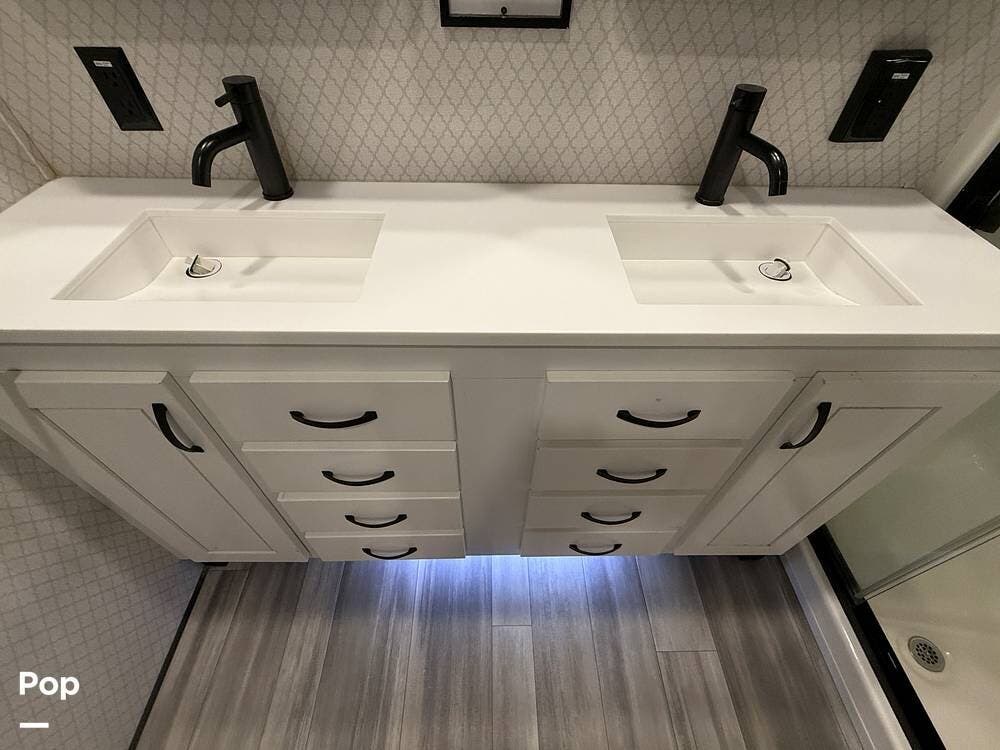 The 371FL includes a convenient half bath mid-ship, while the rear master suite offers a private retreat with a king-size bed, dual wardrobe closets, a dresser, a wall-mounted fan heater, and a second Smart TV. The adjoining full bathroom features a large shower with a seat, skylight, ceiling vent, solid-surface vanity with double sinks, two mirrored medicine cabinets, a toilet, and a generous cabinet that provides access to the combination washer/dryer. With three 15,000 BTU air conditioners and floor-ducted heat, the coach keeps you comfortable year-round.